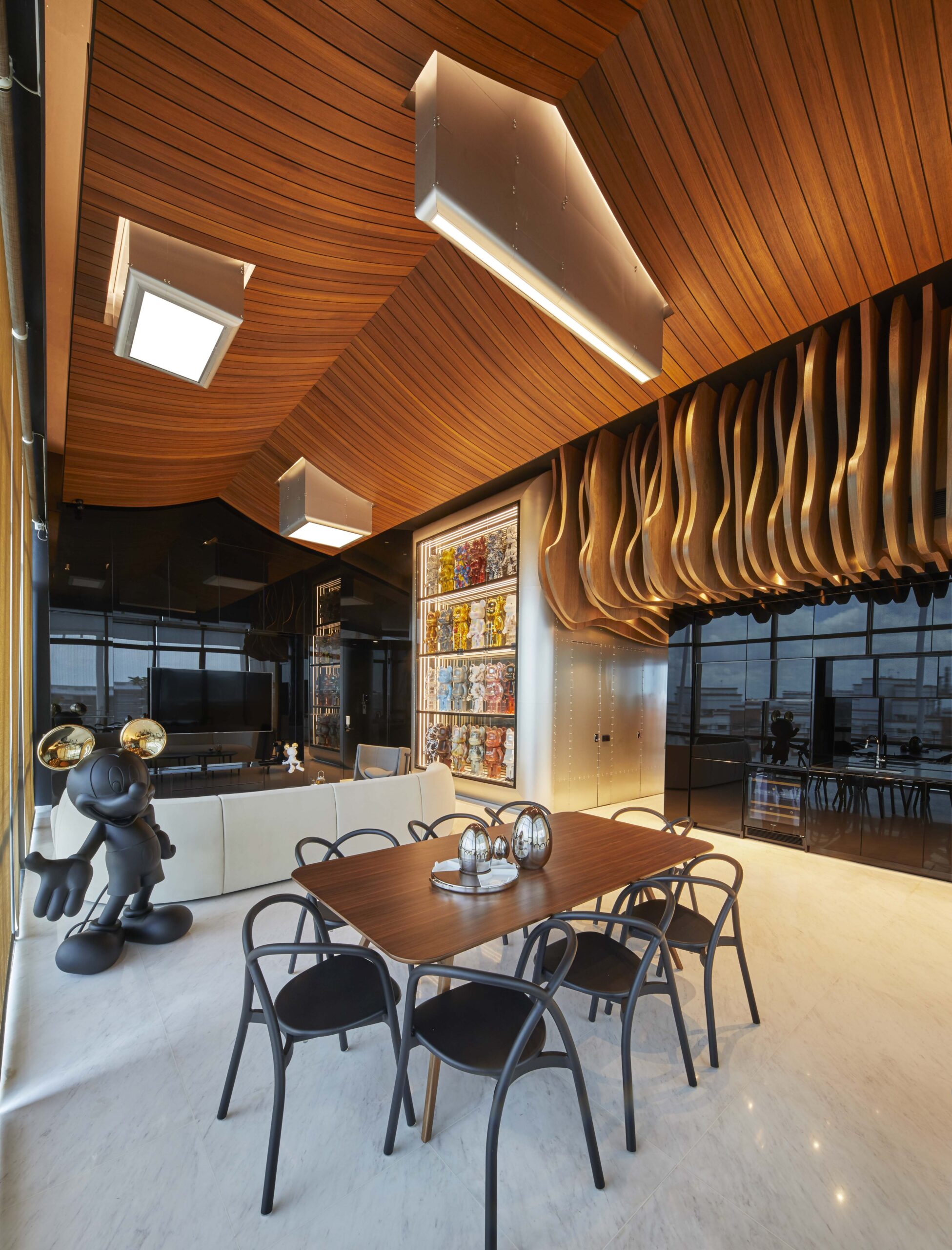 The irregularly-shaped floor plan is carved in such a way that the entire space appears to be defined by the few families of volumetric forms that were injected, taking advantage of the penthouse’s high ceiling and using the Injecting Architecture methodology. The volume visually extends to the other side of the home, encasing the TV wall cabinet system in the Family area, thanks to the aluminum-clad spaceship bearbrick display cabinet. The three-light wells lightboxes that protrude into the living space through the curved ceiling are part of this family.