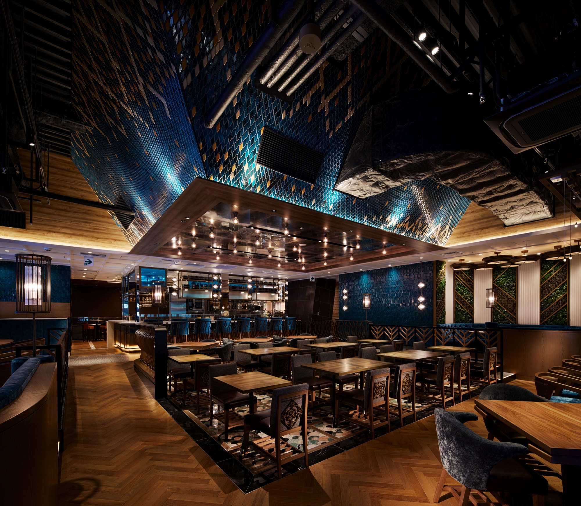 The goal was to create an upscale restaurant that was also comfortable enough for people to visit several times a month. Our goal was to evoke the senses through color, texture, and pattern while remaining true to Indian culture’s deep-rooted heritage. The colors and textures of indigo allude to how the original textiles were dyed and processed generations ago. The combination of these elements and more refined details results in a space that is both sophisticated and welcoming.