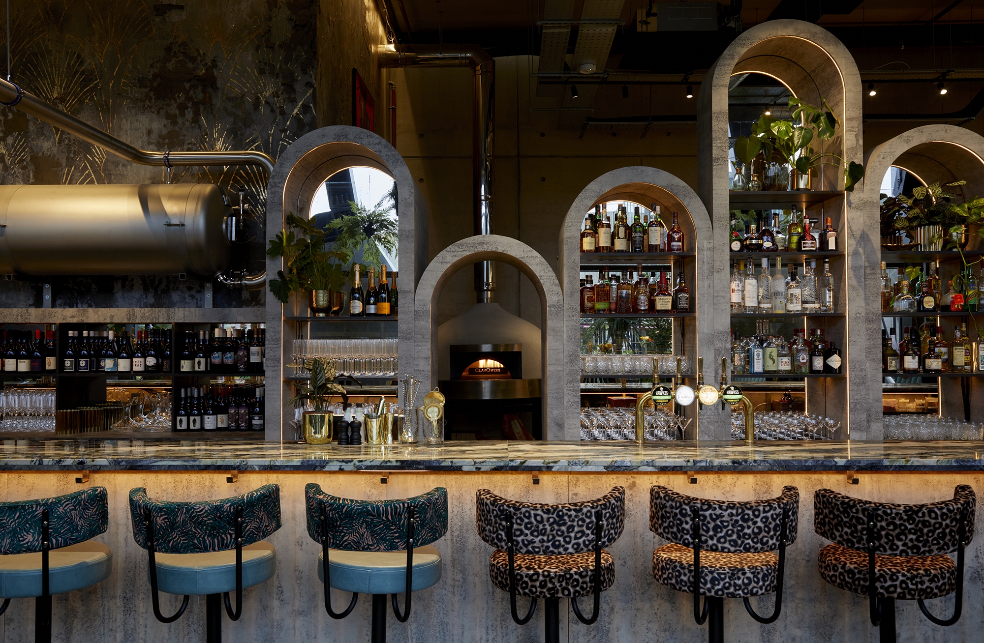 The end result is a design that puts colorful glamour front and center, with massive art and dramatic arches lit in an atmospheric way. Extrovert botanical and animal print fabrics make furniture pop. Planting and highly textured metallic specialist wall finishes help to divide the large space, which sparkles day and night with a perfectly placed ‘opening’ in the bar’s center, straight down the pizza oven’s barrel.