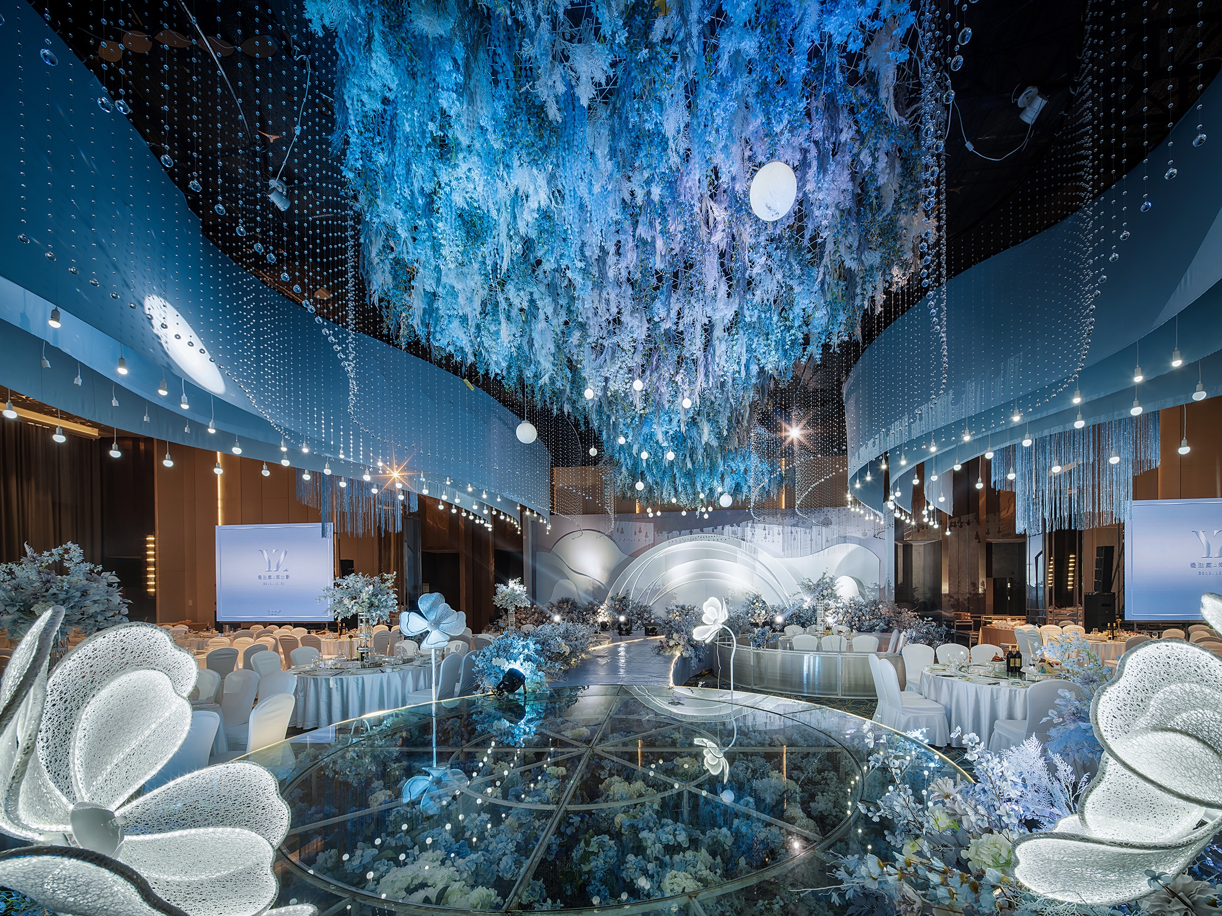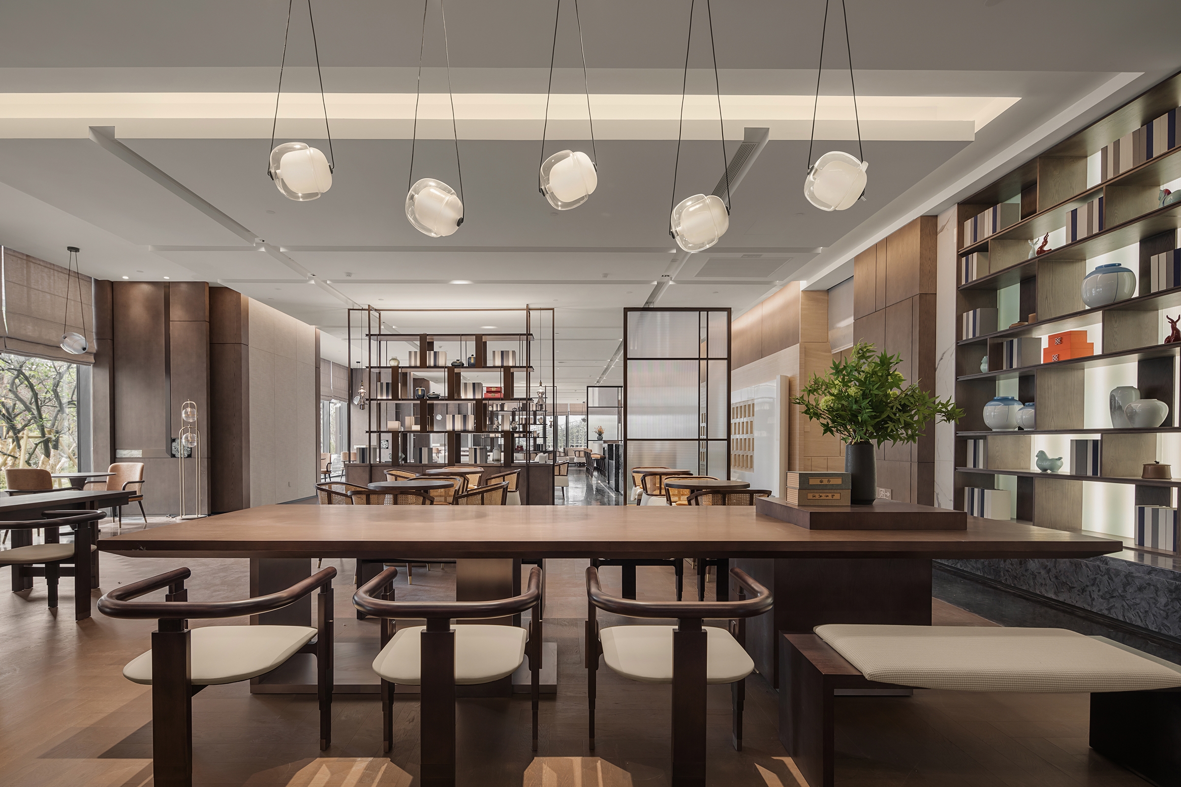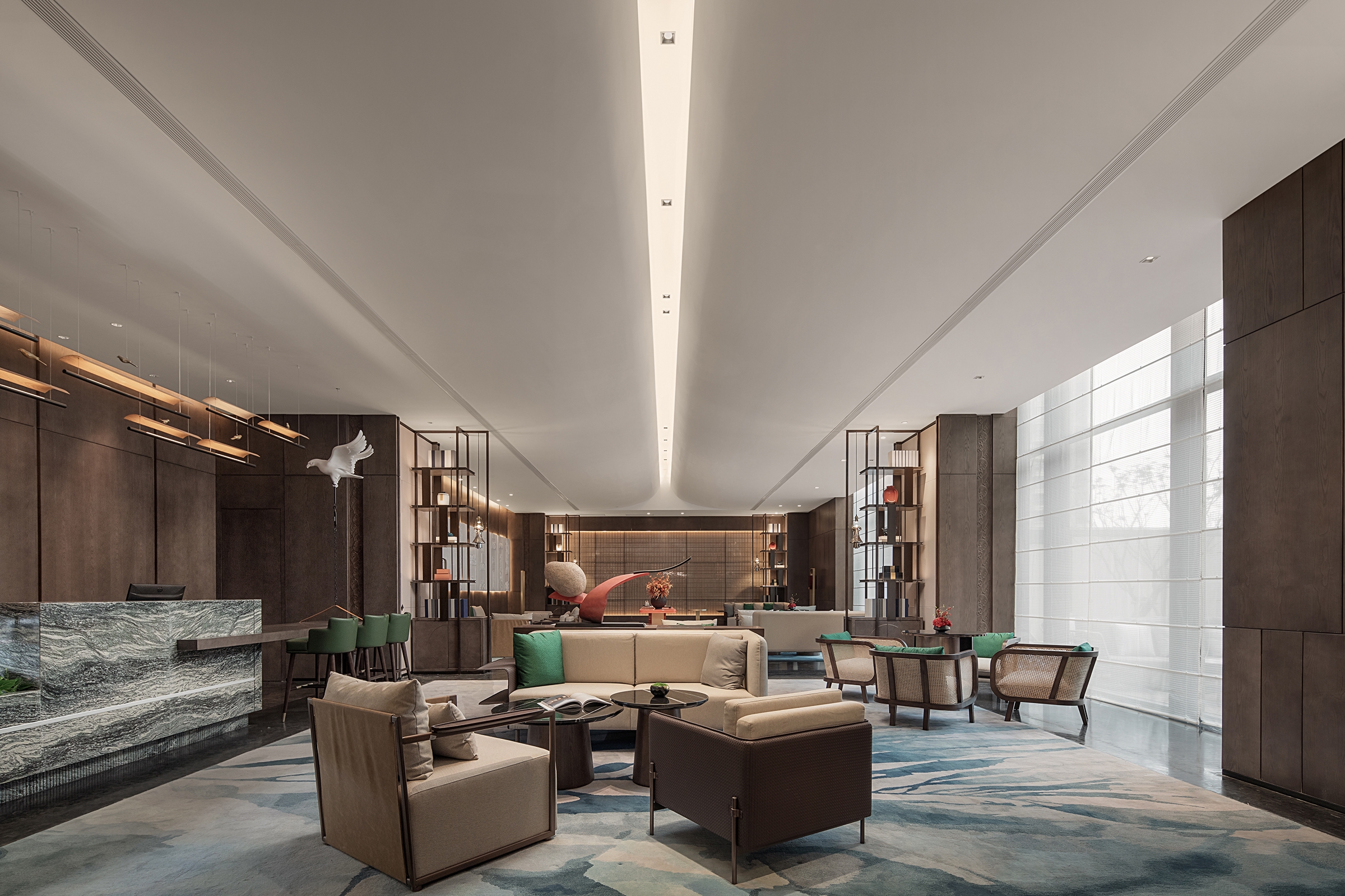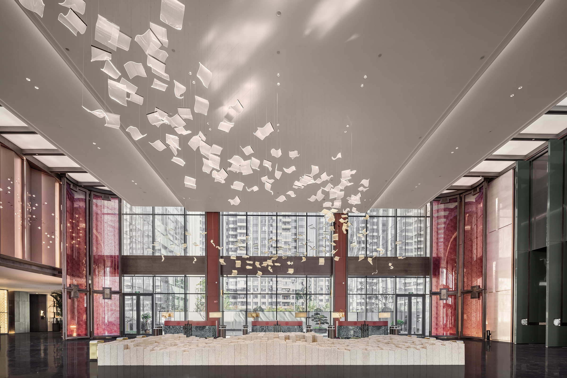 The design theme of the hotel lobby is "Scholarly Rui'an" with a sea and mountain picture scroll, abstractly integrating the local representative cultural elements of "movable type printing" into the lobby space, echoed by the book-shaped chandelier. The exquisite and transparent silk screen combines traditional and modern techniques to create a magnificent scene.