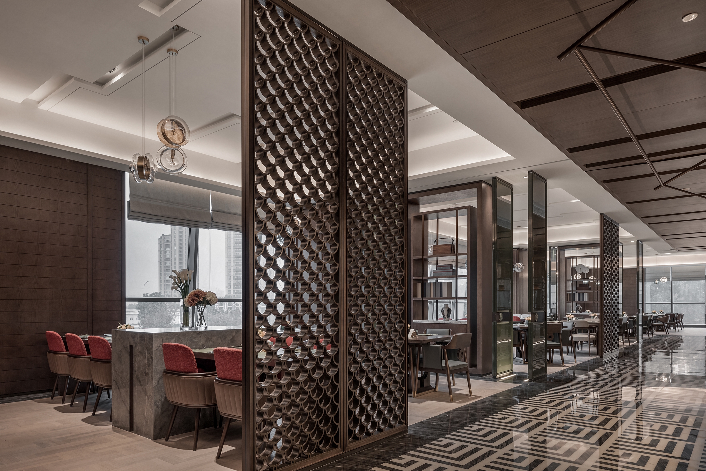 The lobby bar space is transparent and bright. The understated and warm leather seats are matched with leisurely, chic cloth sofas, and the aqua carpet integrates art and nature to establish a quiet, relaxing and elegant atmosphere. The ceiling implements elements of ancient architecture, both minimal and aesthetic, adding a sense of gradation. One wall contains a Rui'an wood carving, the abstract geometric lines providing a feeling of stability.