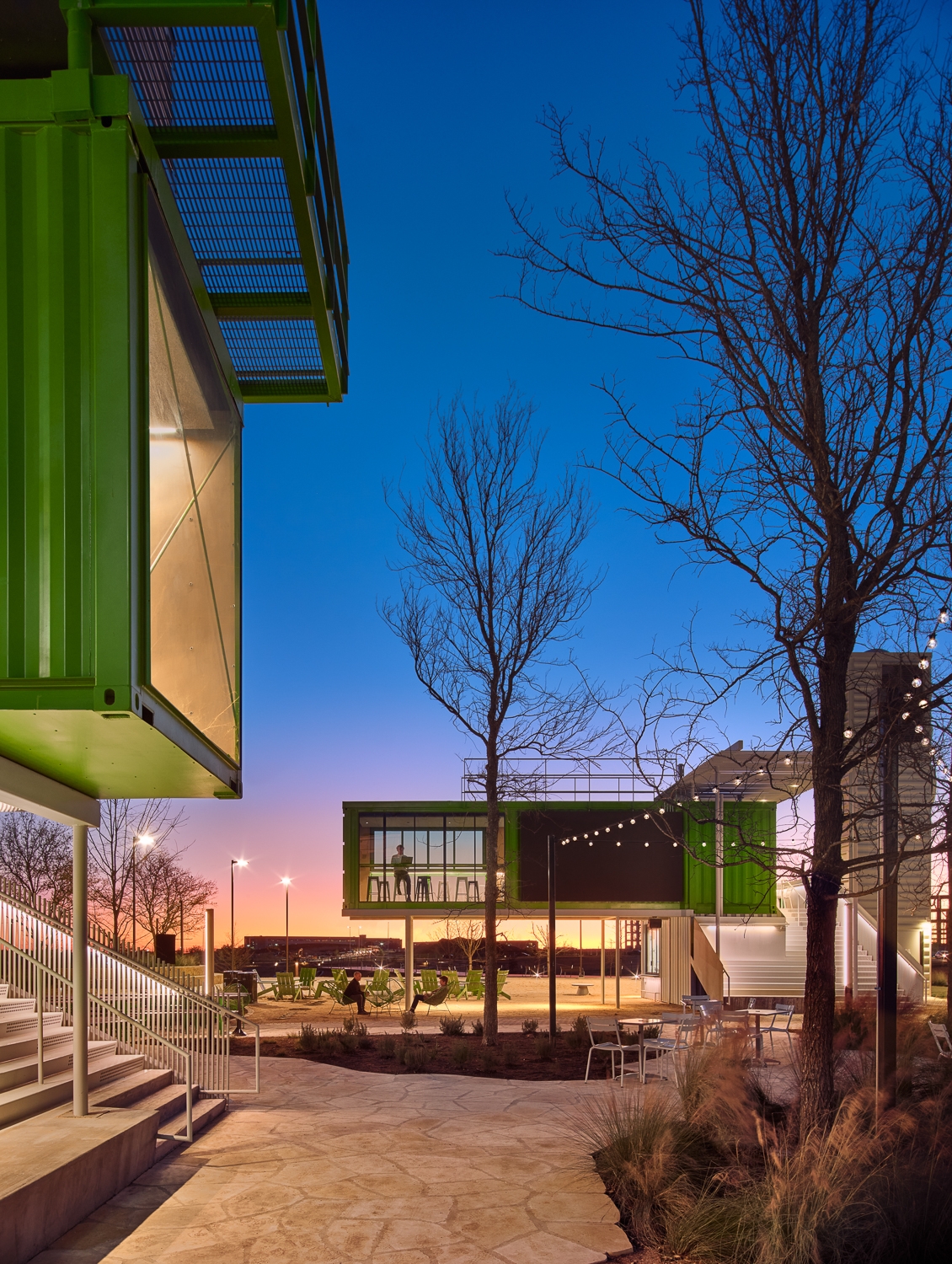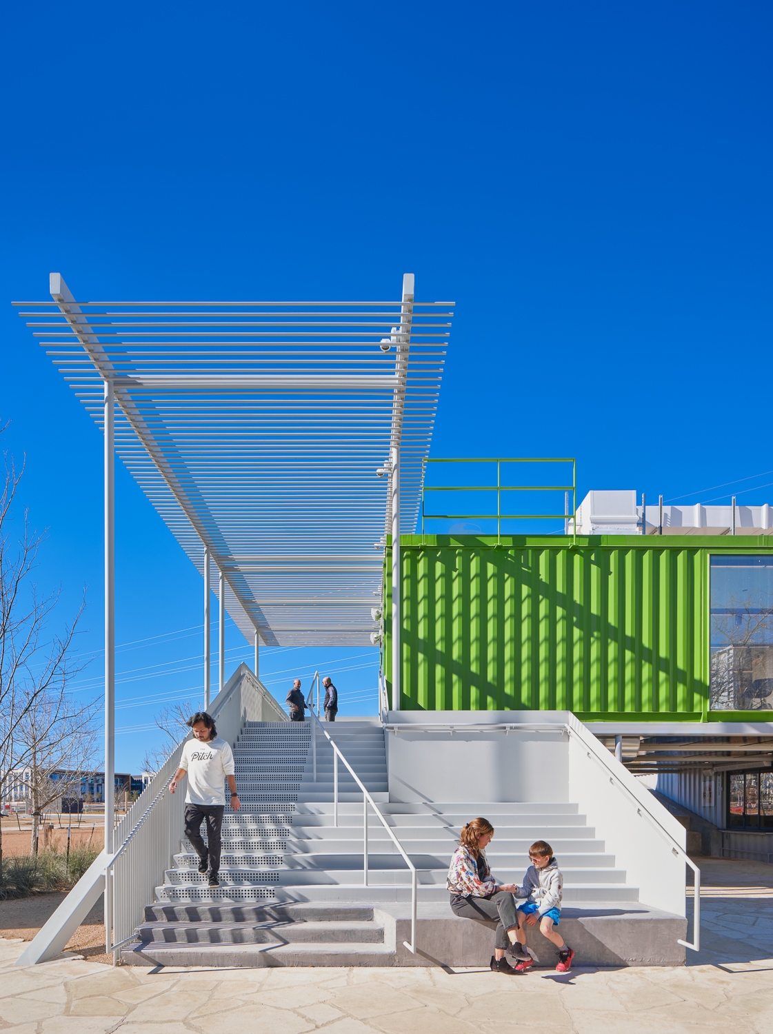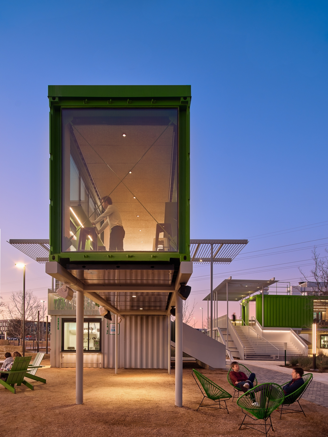 The Pitch is a distinct hospitality and entertainment complex for Austin FC soccer fans and the community. The two-acre site is a one-of-a-kind destination hub for retail, food, office and outdoor gatherings served from 23 two-story repurposed shipping containers. Using two standard sizes (8x20 foot and 8x40 foot) the containers are stacked and clustered into five separate building pods with varying square footage. Ground level containers serve as food and beverage outlets for premiere local food vendors. Second level containers are multifunctional as viewing decks, interior gathering spaces, private office, party rooms, and Austin FC game watching. Custom stairs, vertical tube steel railings, and overhead trellises were carefully designed and executed tying together each level and event. Three 40-foot-tall containers were placed on ends serving as wayfinding nodes from afar, while functioning as restrooms and electrical rooms at ground. A mass timber pavilion acts as a communal gathering hub for all patrons. The once flat site was heavily landscaped to nestle the containers and curate different user experiences with each visit, enticing exploration across the complex.