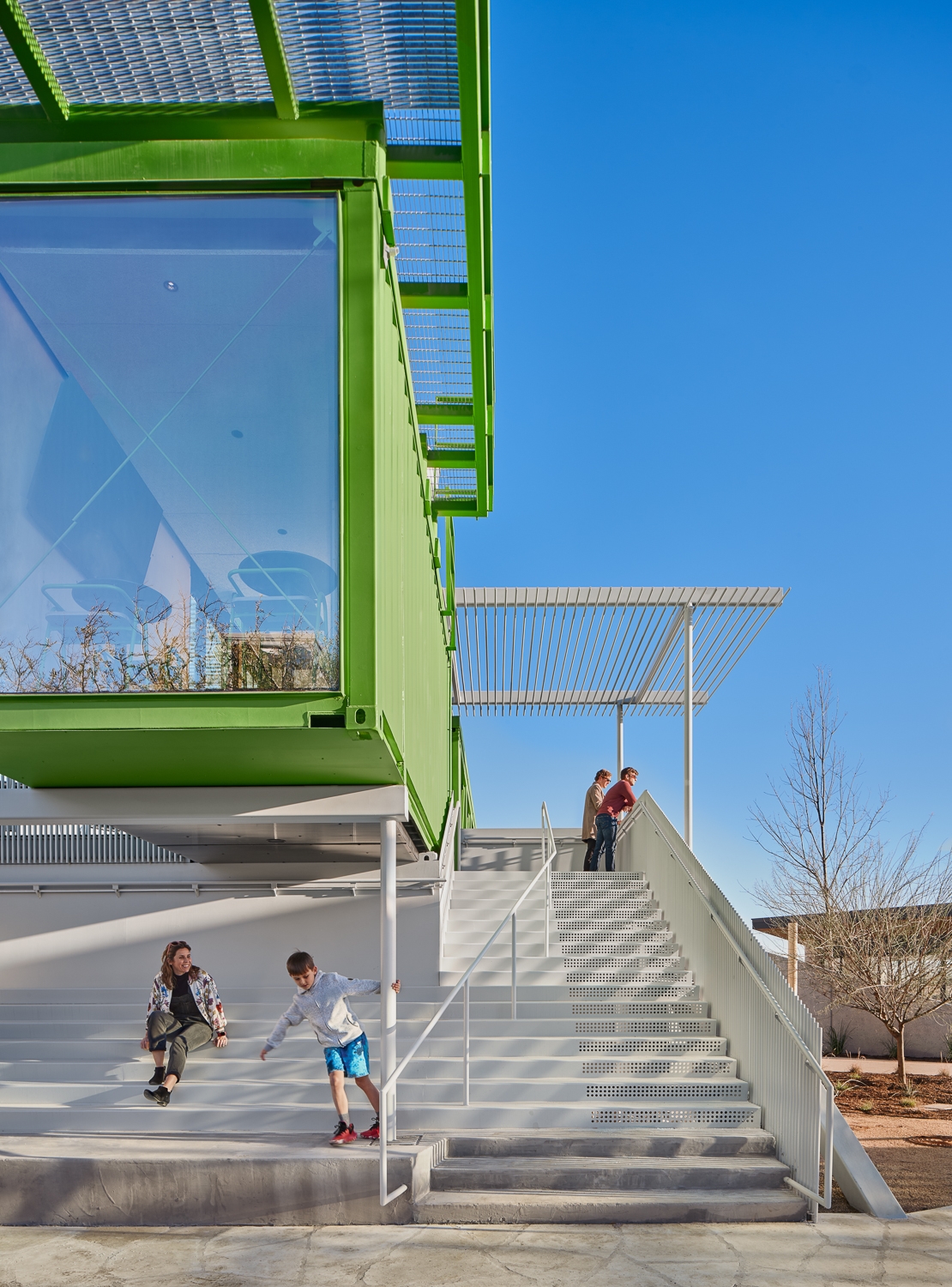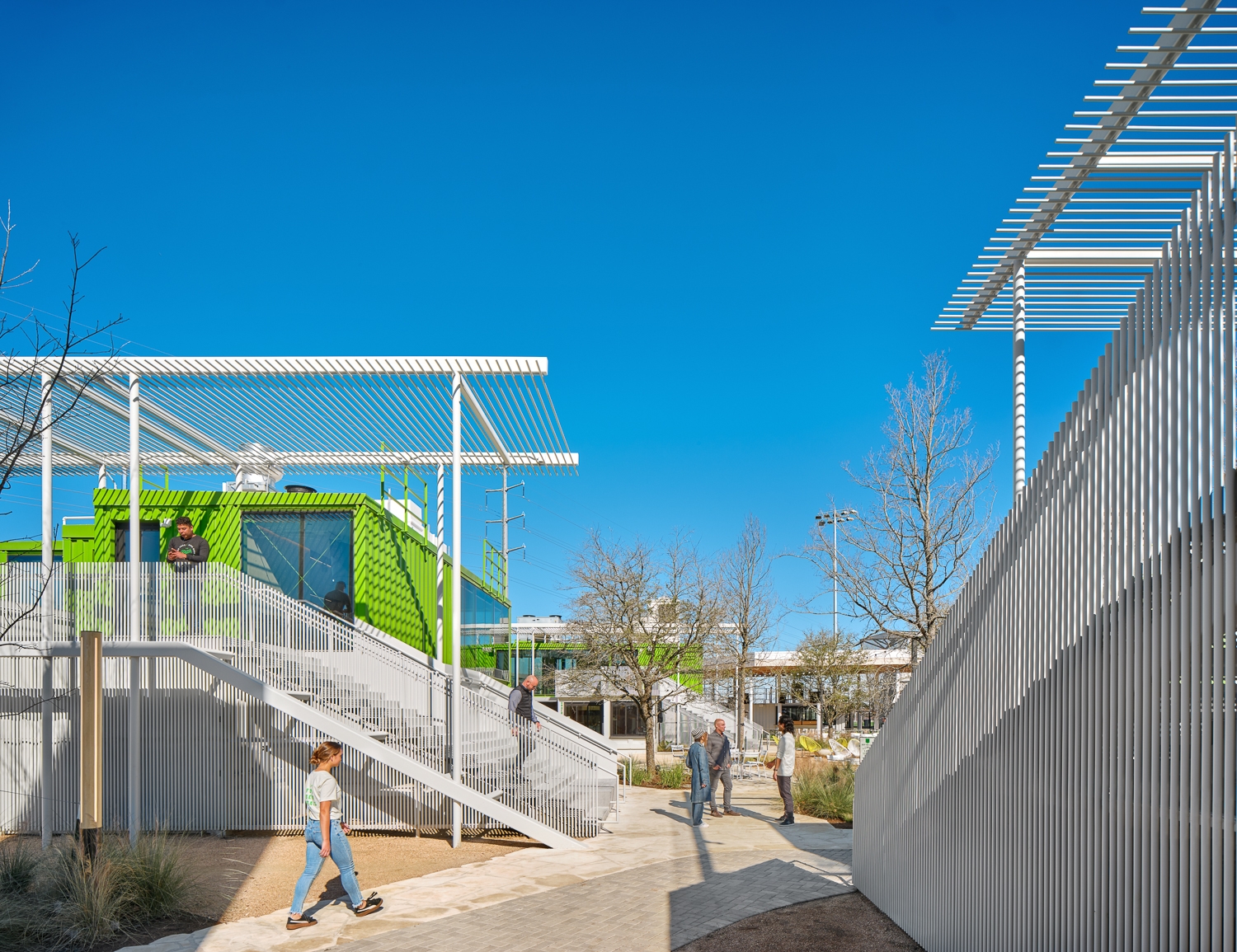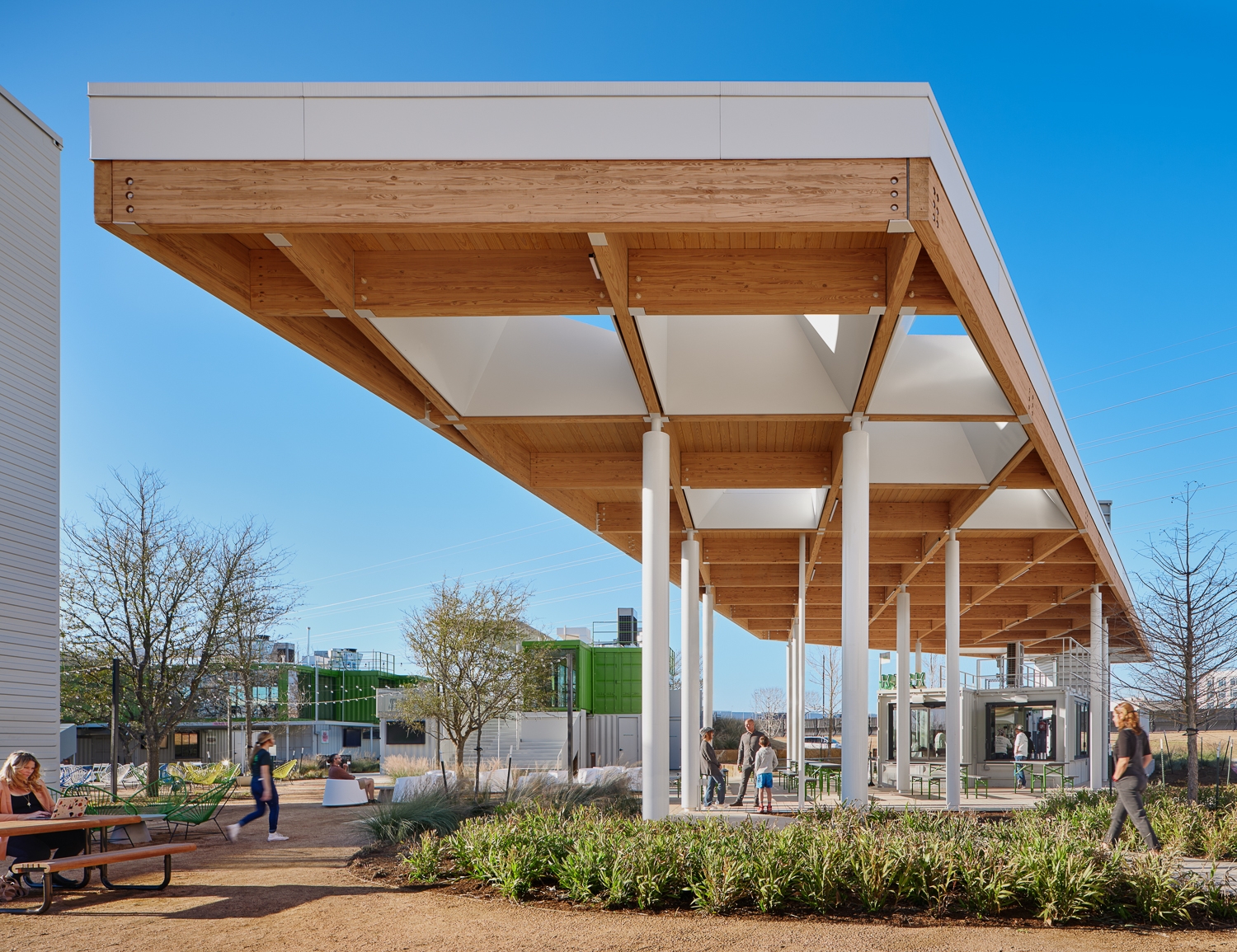 The Pitch is a distinct hospitality and entertainment complex for Austin FC soccer fans and the community. The two-acre site is a one-of-a-kind destination hub for retail, food, office and outdoor gatherings served from 23 two-story repurposed shipping containers. Using two standard sizes (8x20 foot and 8x40 foot) the containers are stacked and clustered into five separate building pods with varying square footage. Ground level containers serve as food and beverage outlets for premiere local food vendors. Second level containers are multifunctional as viewing decks, interior gathering spaces, private office, party rooms, and Austin FC game watching. Custom stairs, vertical tube steel railings, and overhead trellises were carefully designed and executed tying together each level and event. Three 40-foot-tall containers were placed on ends serving as wayfinding nodes from afar, while functioning as restrooms and electrical rooms at ground. A mass timber pavilion acts as a communal gathering hub for all patrons. The once flat site was heavily landscaped to nestle the containers and curate different user experiences with each visit, enticing exploration across the complex.
