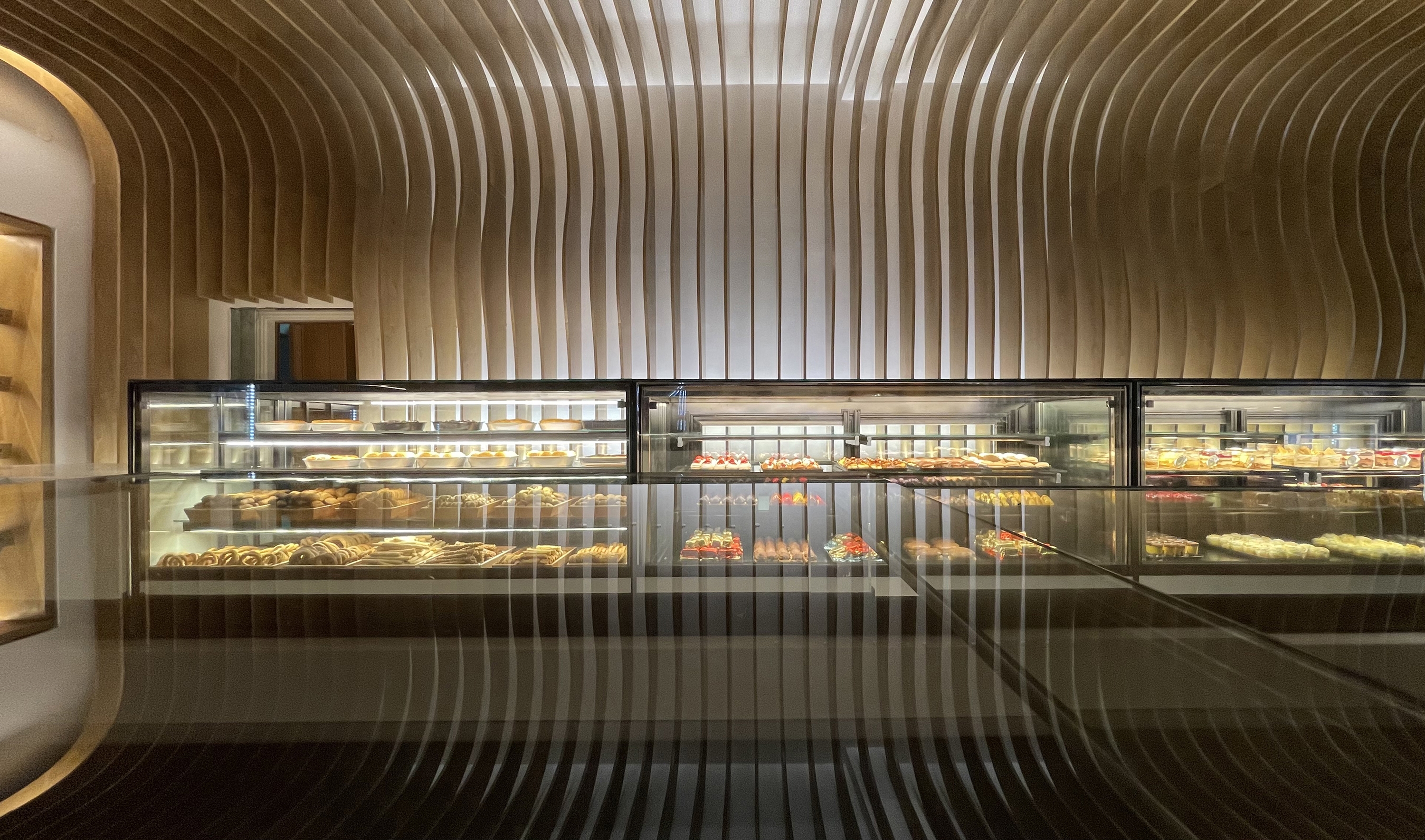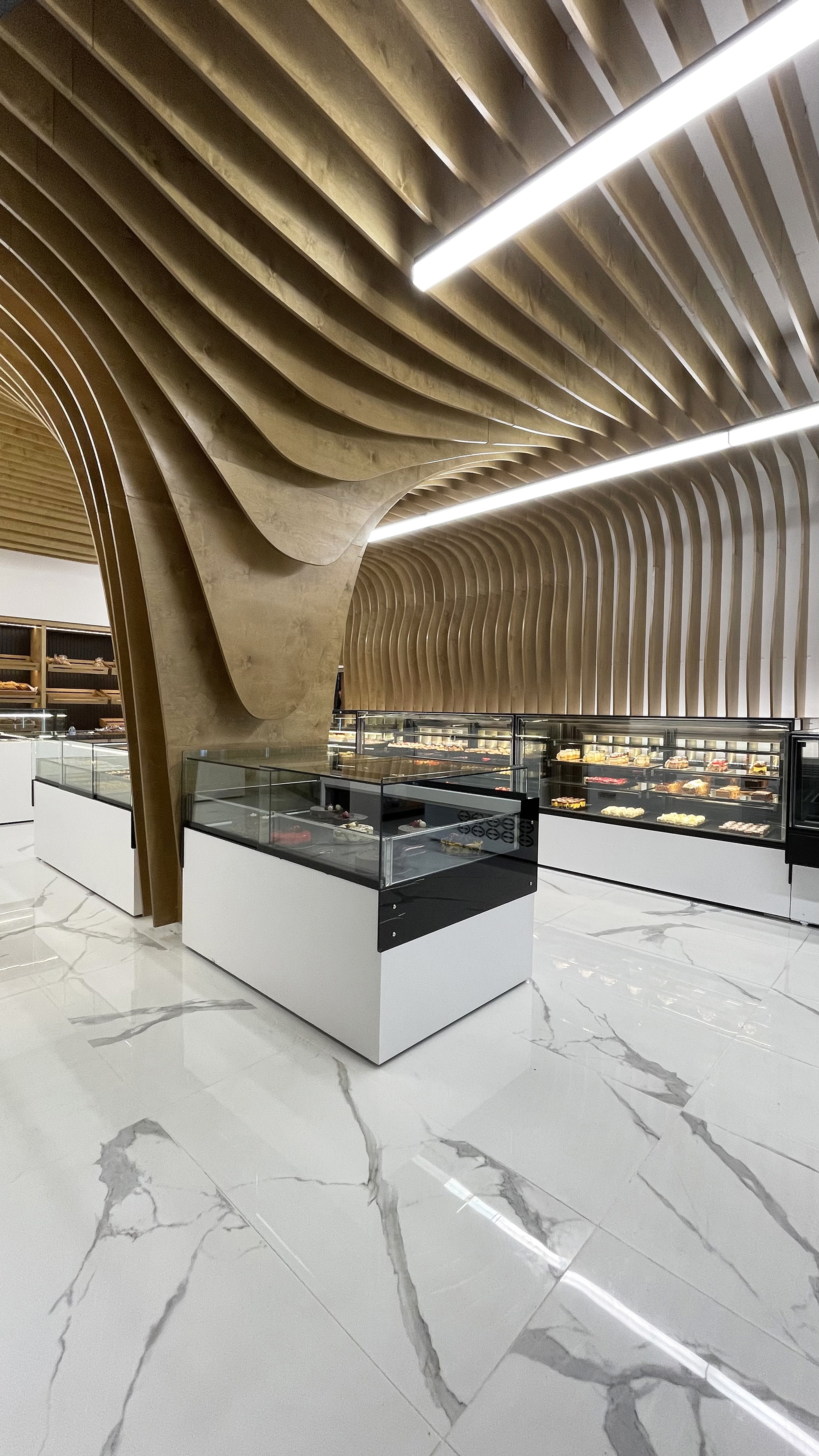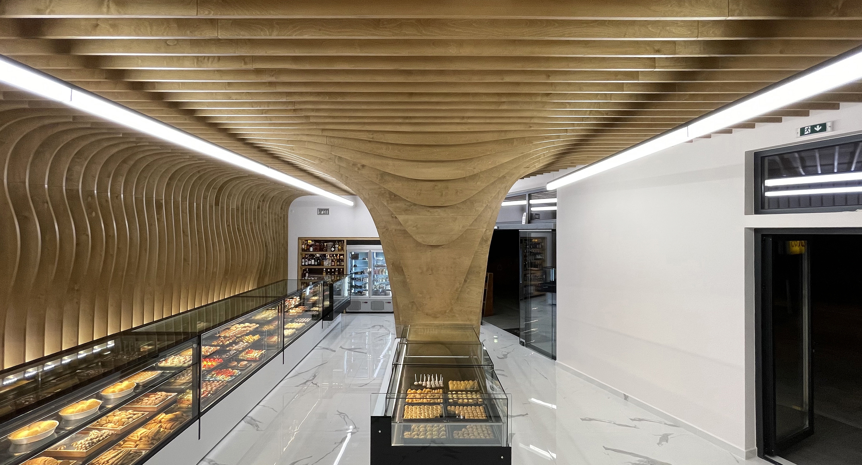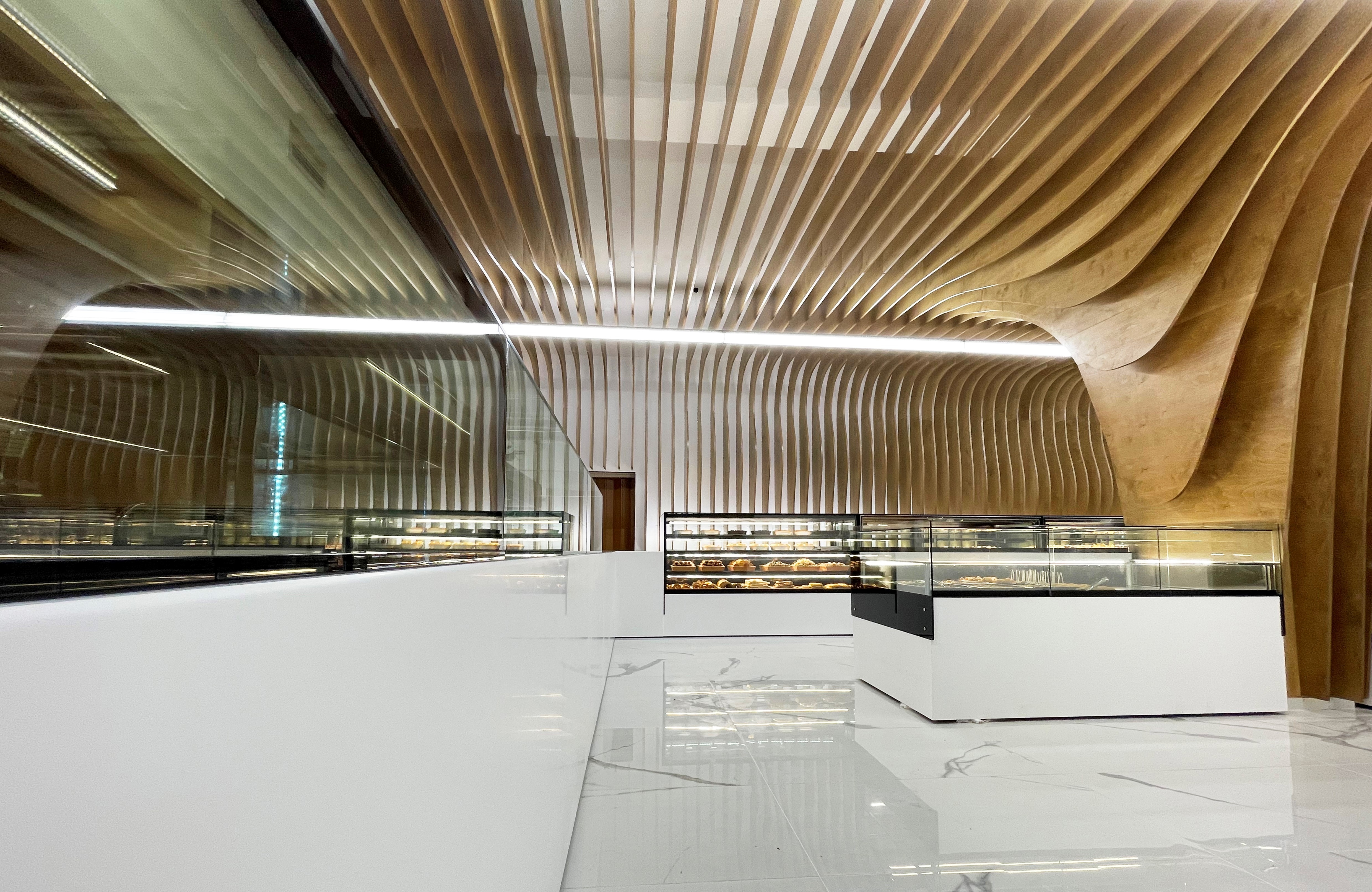 The project is a complete redesign of a bakery and patisserie storefront in Greece. The request from the clients was for a design that is both contemporary and intimate as well as to illustrate the dual identity of the bakery and patisserie. Based on this the approach was structured on the composition of opposing pairs: curve vs line, intricate vs subtle, saturated vs pure, function vs identity. Thus the curved, intricate, saturated upper part is combined with the orthogonal, subtle, pure lower part. The internal pillar (a former functional problem) was converted into the primary sign of identity.
