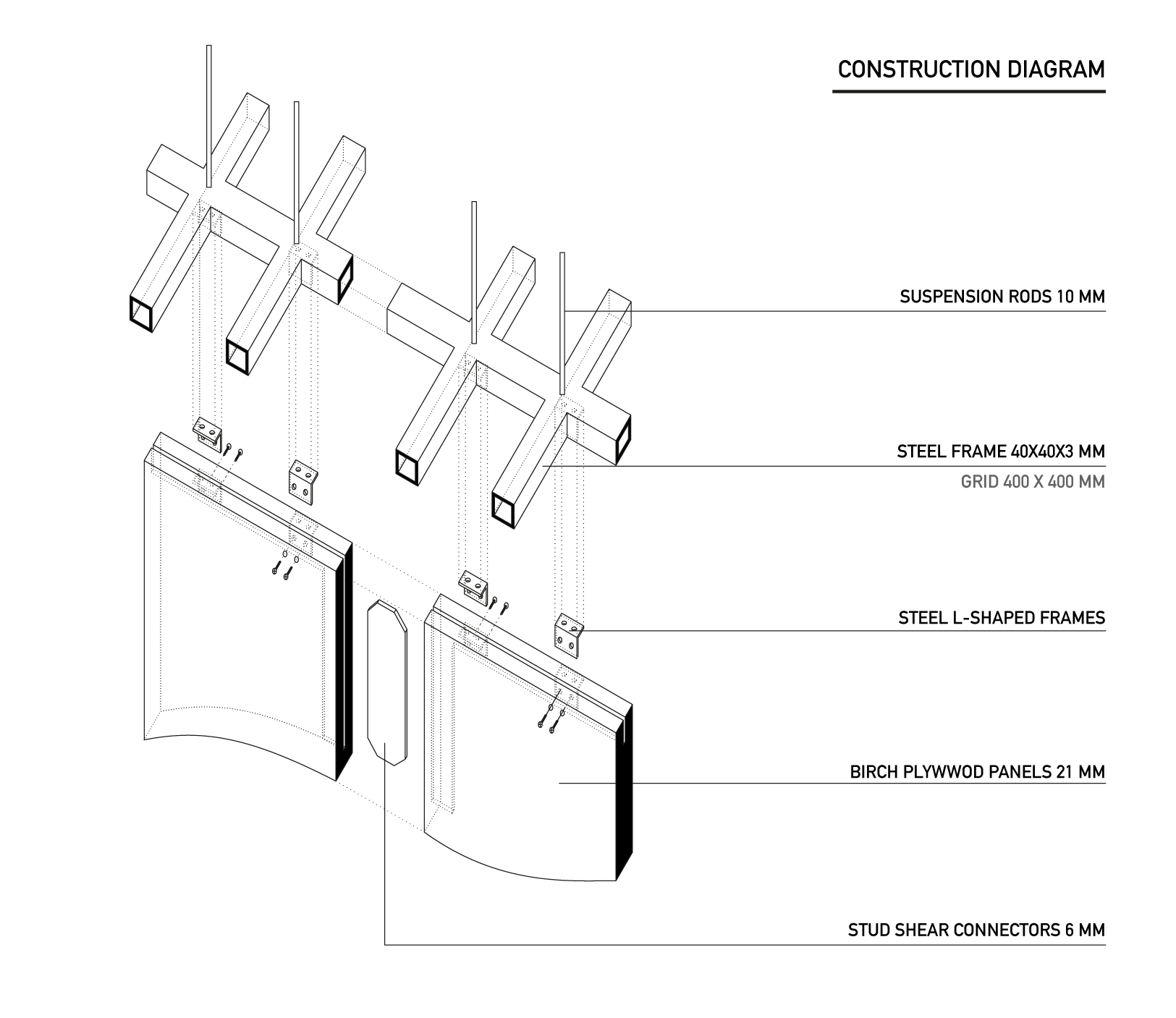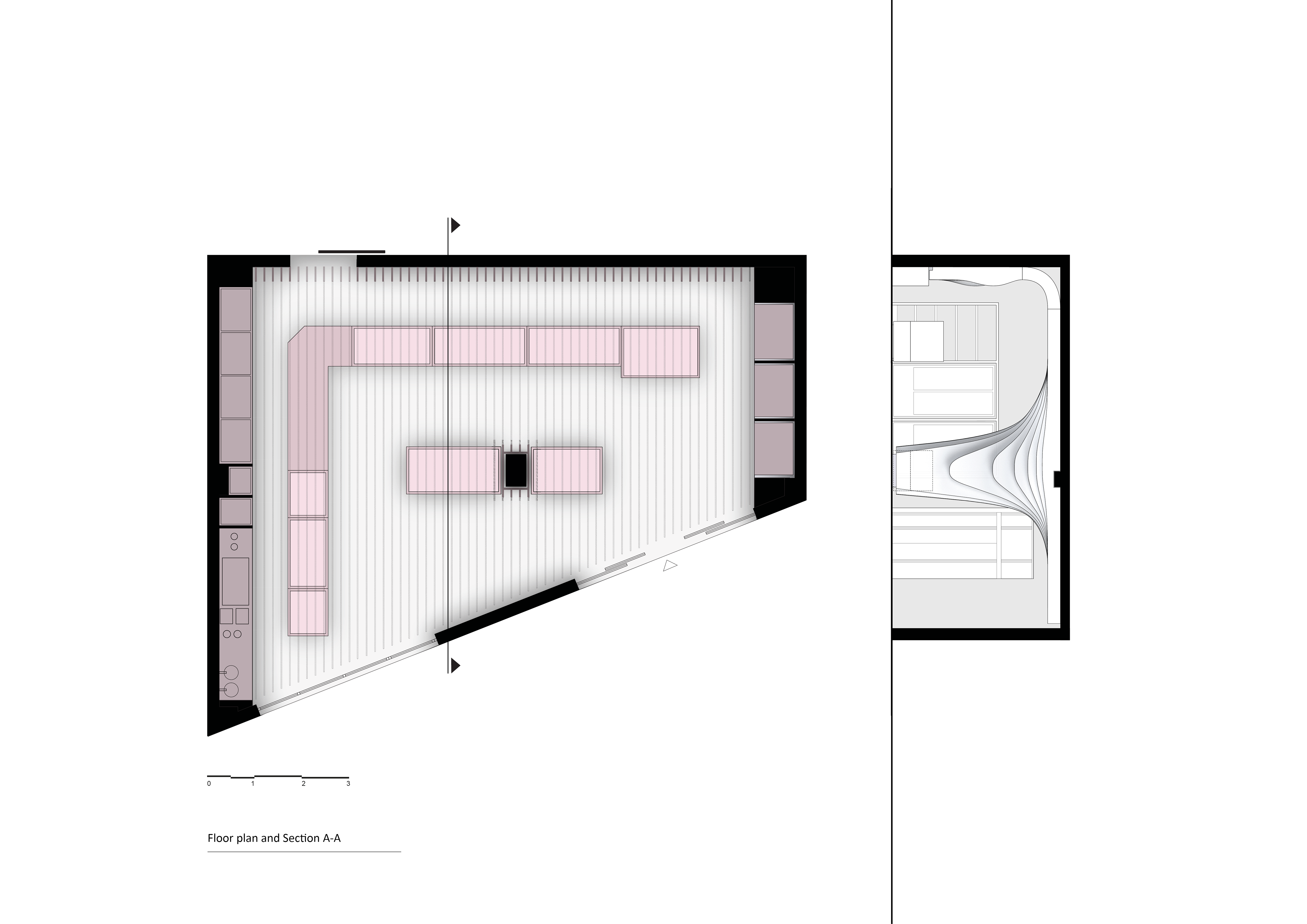 The inner skin is a continuous surface that covers the ceiling and the back wall with its maximum deformation at the location of the inner pillar. It was made of birch plywood, composed of 59 sequential section profiles with differentiating geometry and size. The cutting was made with cnc-milling and the assembly by local craftsmen. This is a particular characteristic of the project: the combination of contemporary methods of design and fabrication with traditional techniques, rendering this as an opportunity for knowledge exchange between the two parties (designers, fabricators).
