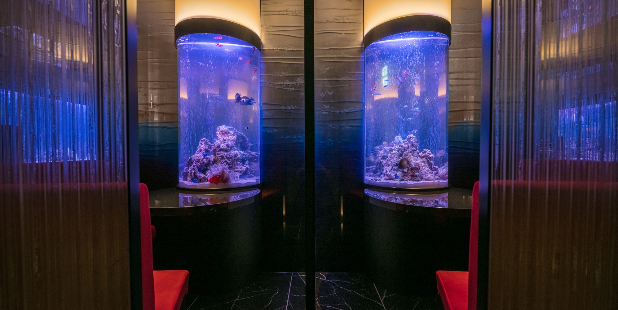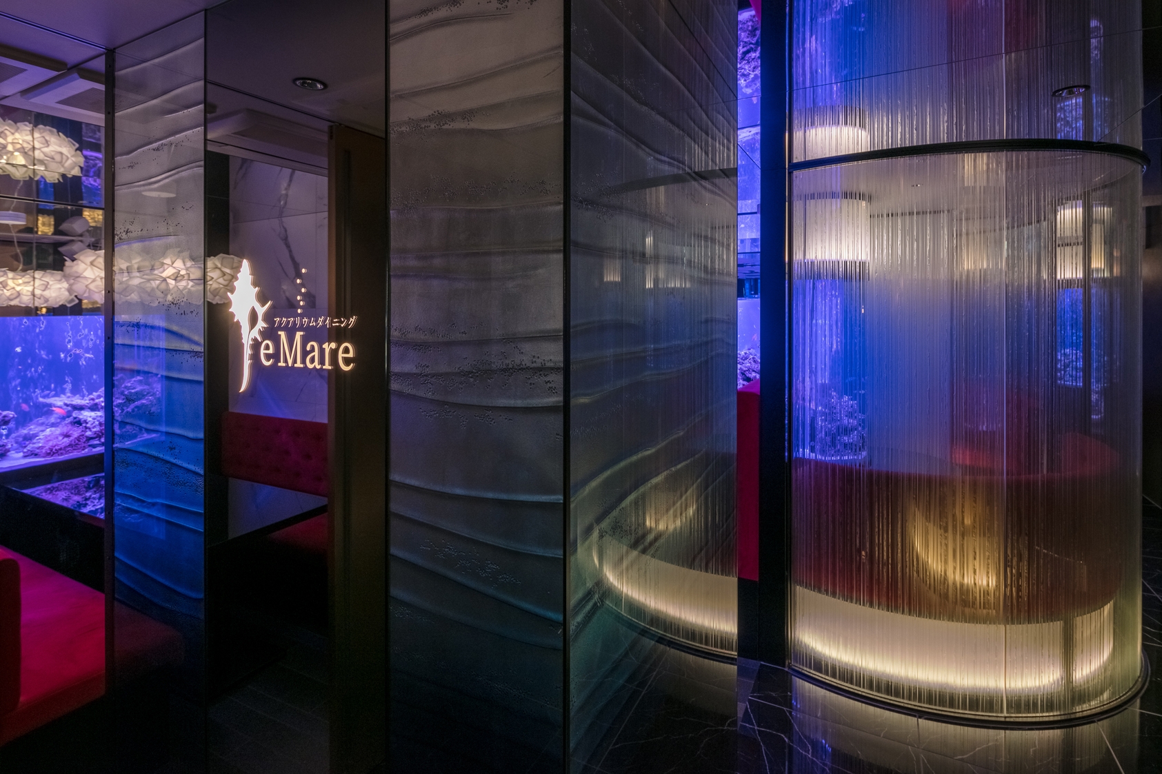 Challenging the ocean-themed possibilities in the heart of the concrete jungle, the new restaurant turns the simple hospitality environment into an immersive space where dinners are submerged in an aquarium universe. The roles are inversed, the dining room is now contained in a box and surrounded by oceanic sceneries, instead of the classical ornamental or decorative use of aquariums.