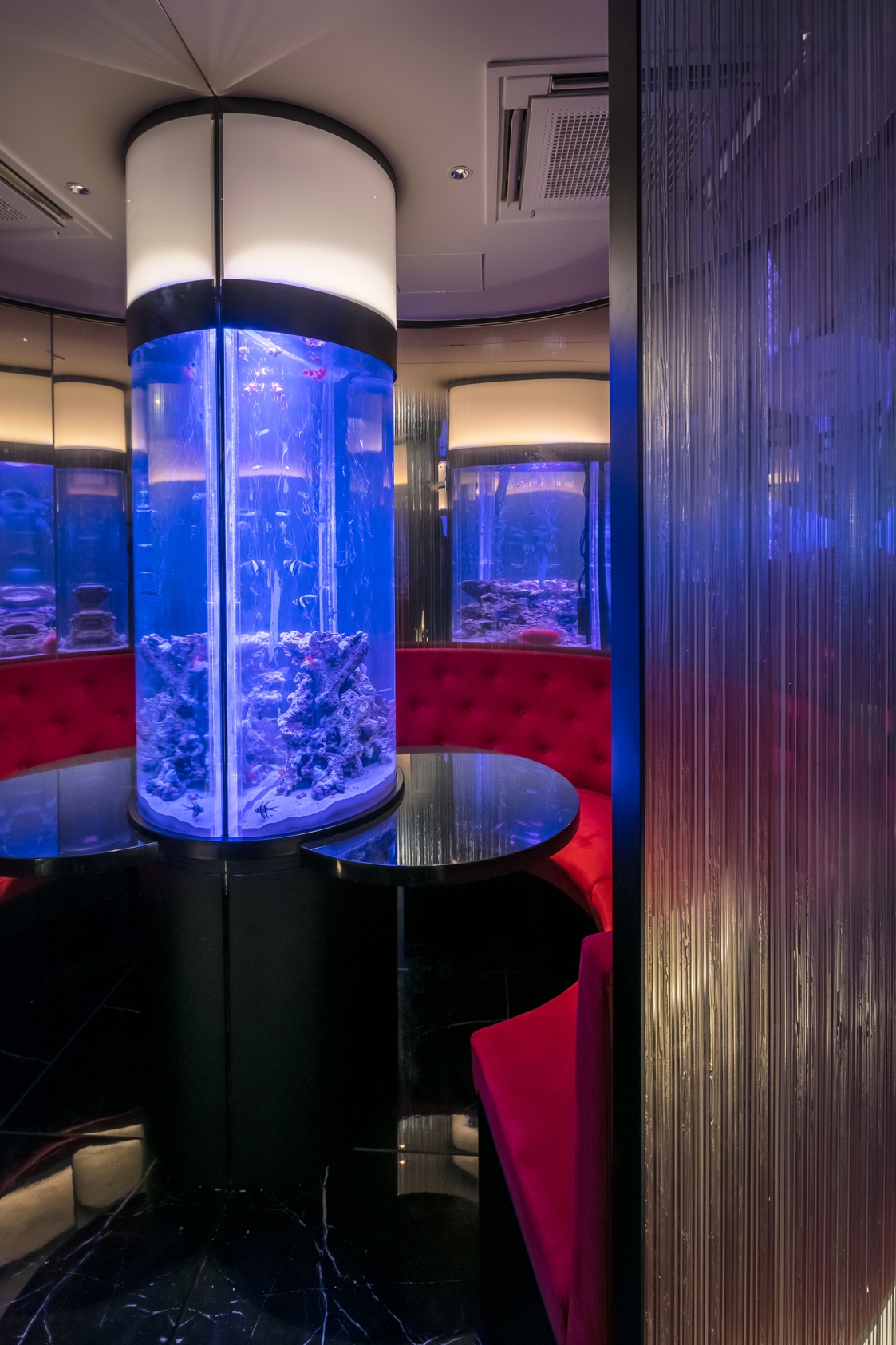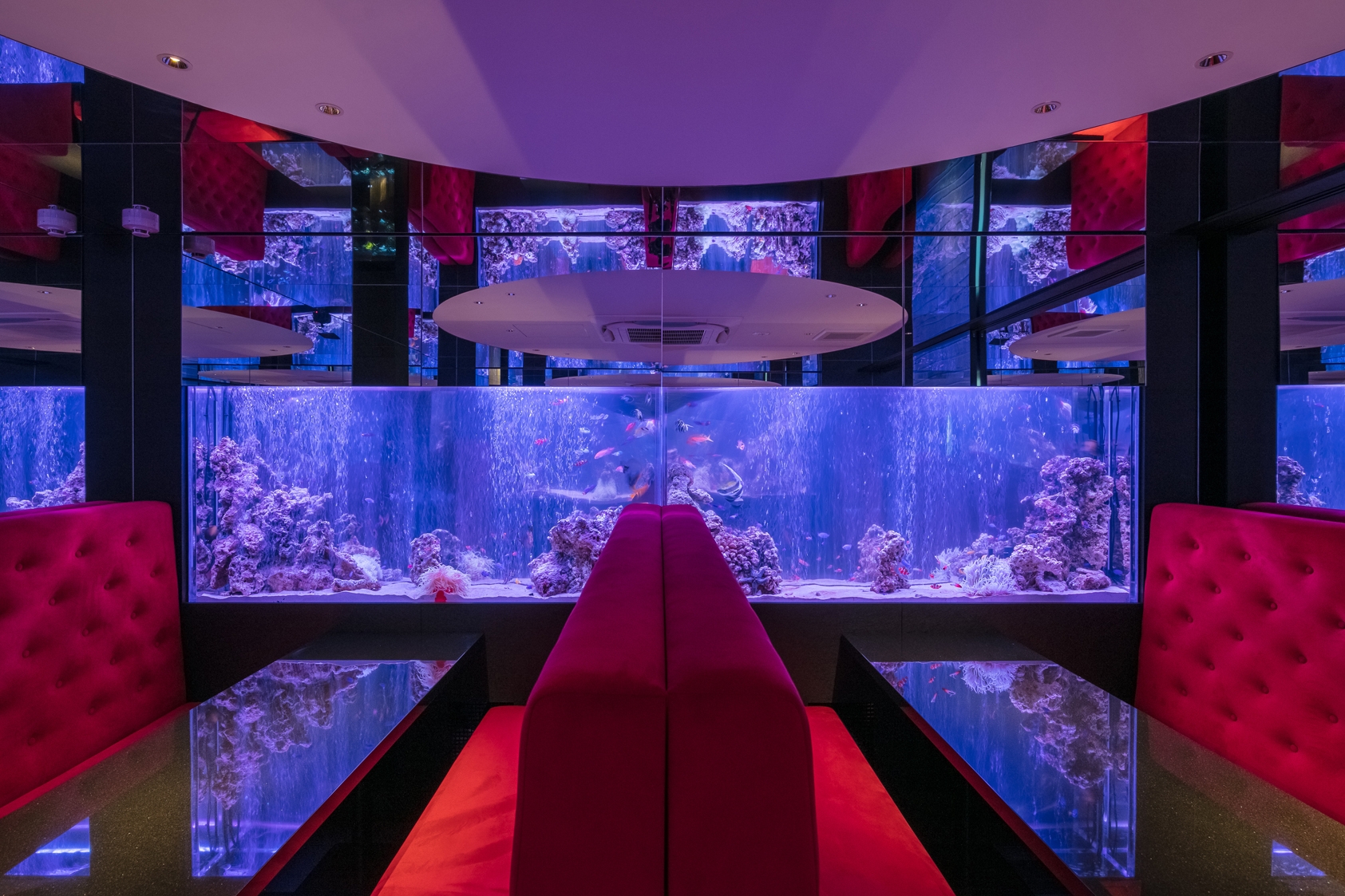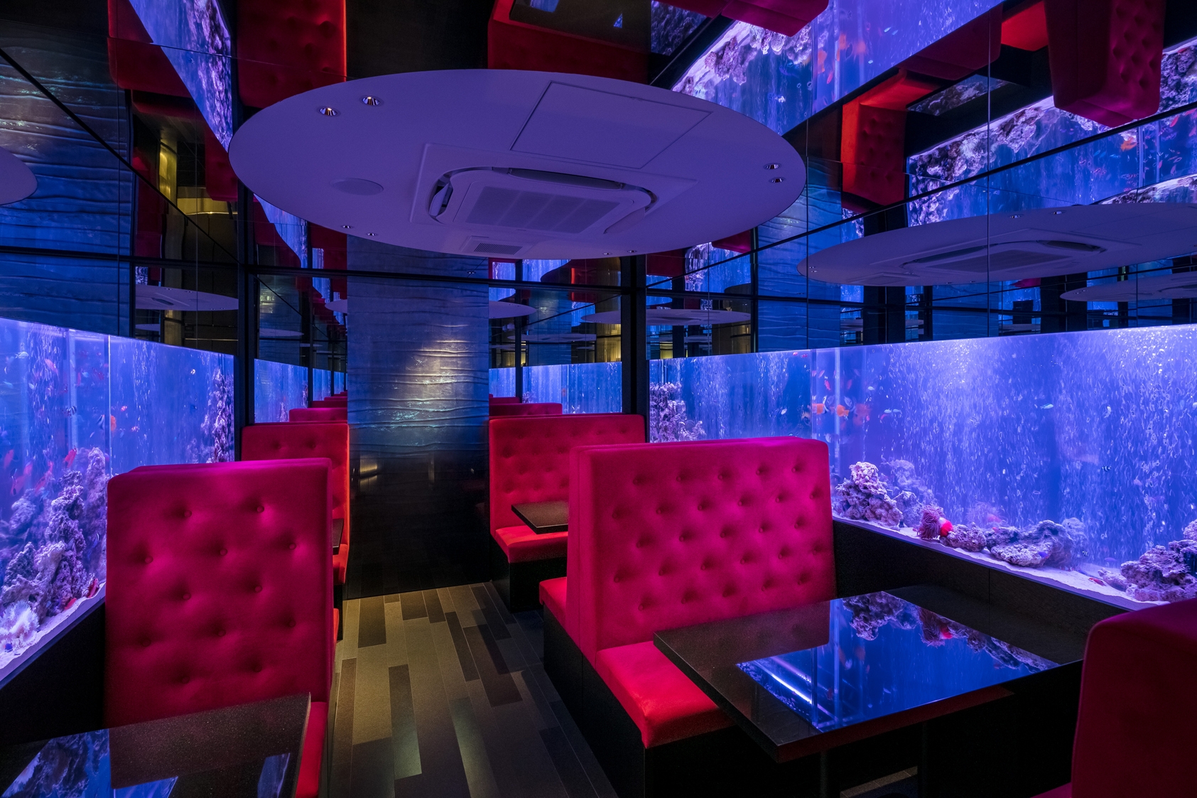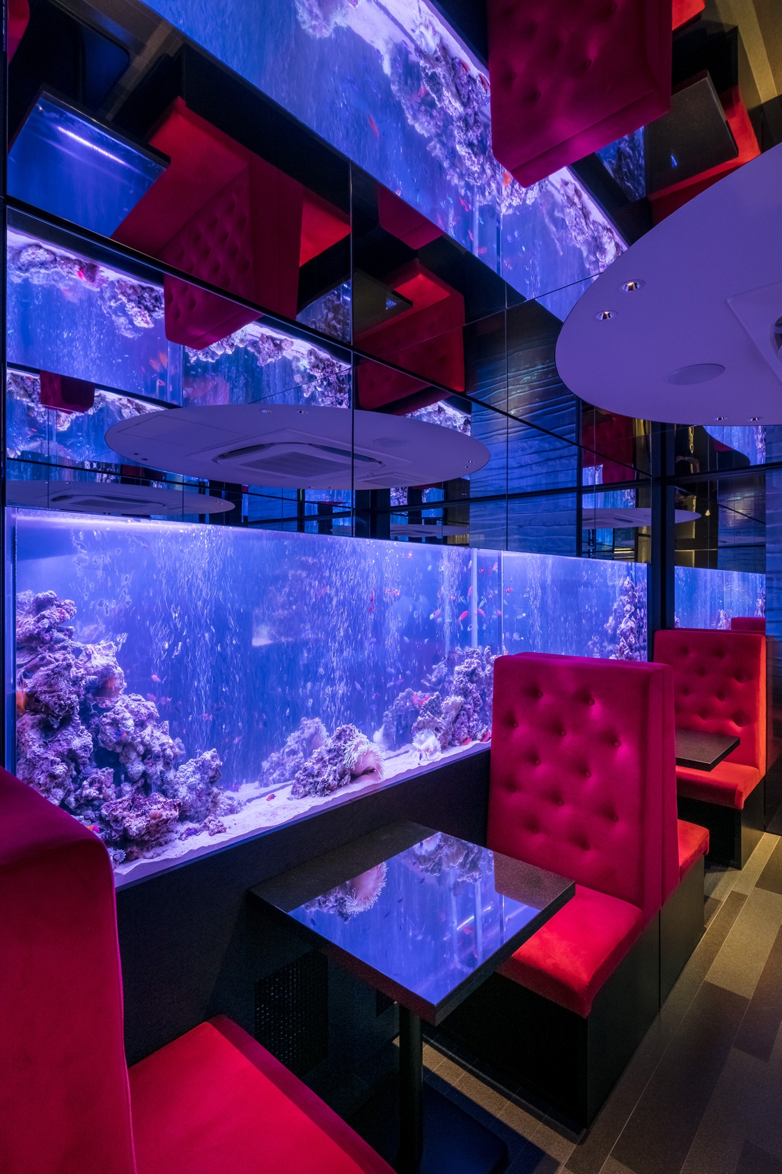The available room not exceeding the 94 square meters, the ceiling height at a crushing 2.1m, and the water tanks heavyweight were decisive in shaping the dining space. To create the immersive experience, walls were finished in mirrors and the ceiling in similarly reflective aluminum panels expending the space in all directions and recreating the oceanic life in a surrounding environment.