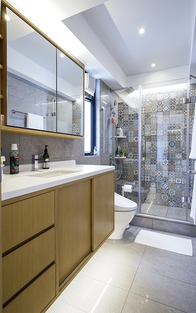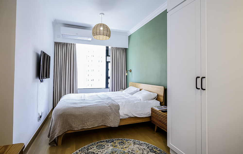 I want to be simple in the design of the master bedroom and bathroom. Green paint is used on the host’s bedside wall to create a characteristic wall effect, and the bathroom adds a shower booth to the shower position.