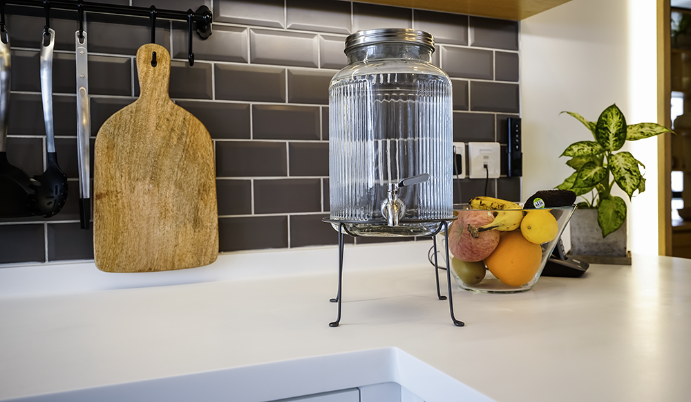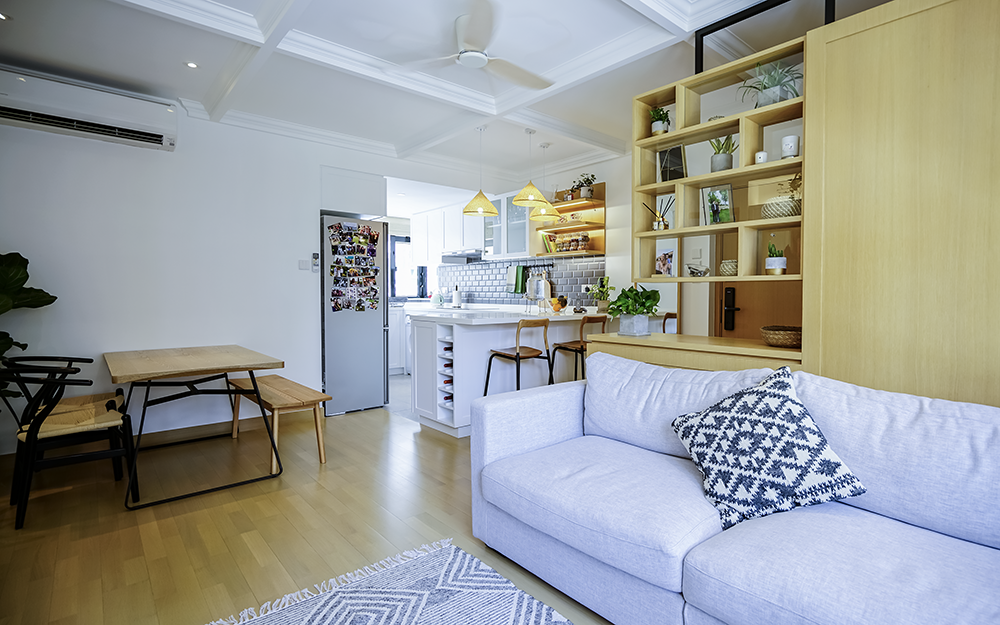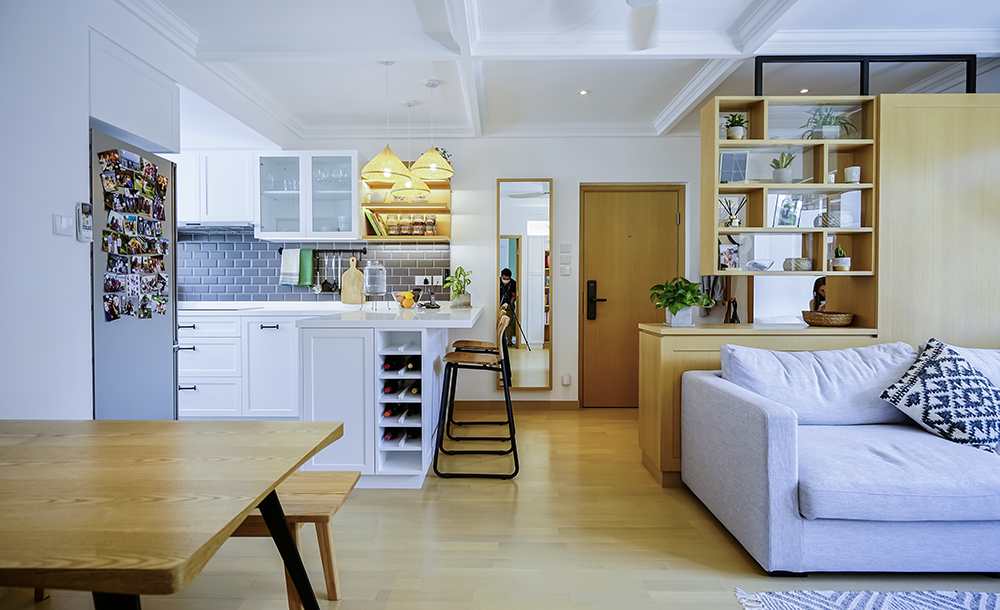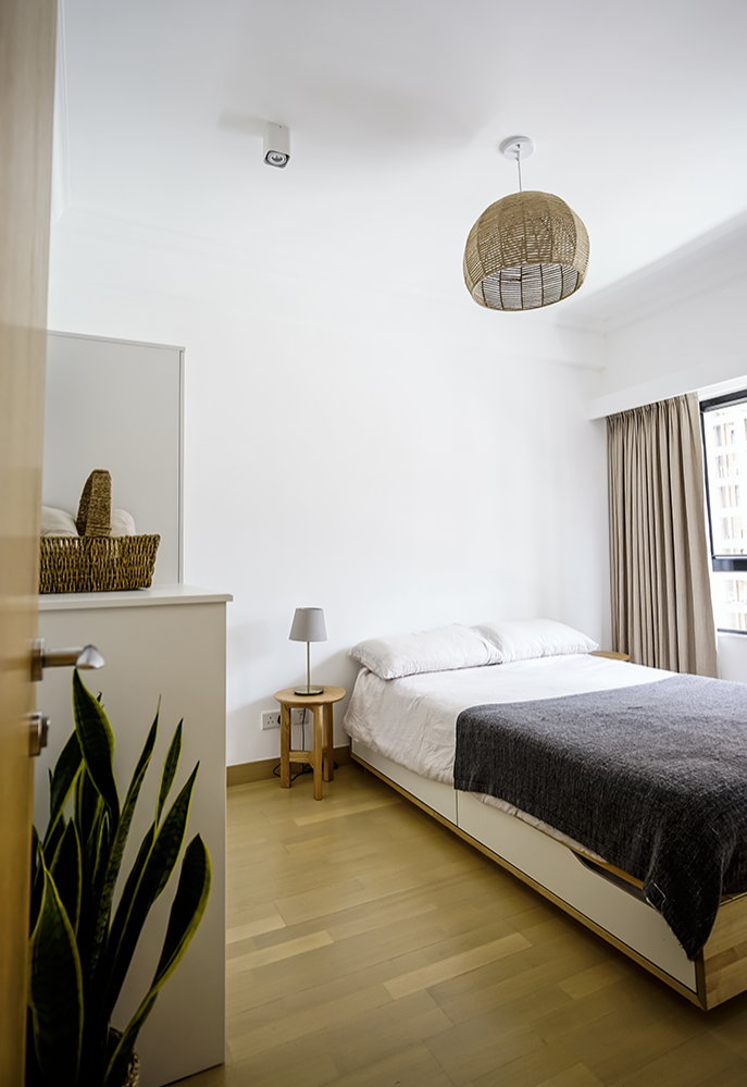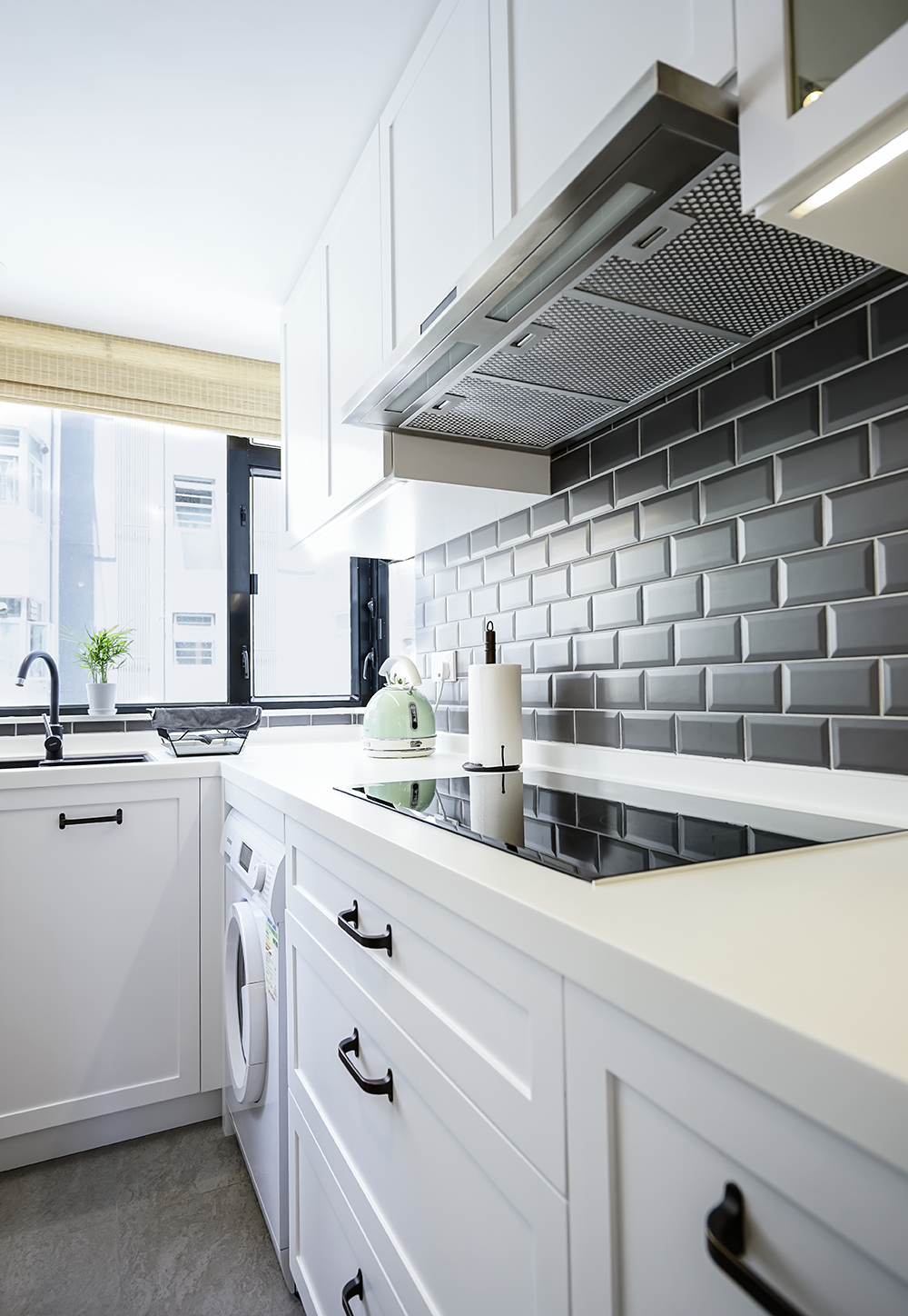 The kitchen is an open design, and the gray brick walls on the wall are used to highlight the effect we want. In the kitchen cabinets, white is used to make the wood cabinets in other places contrast. A bar counter is designed between the open kitchen and the hallway so that customers can enjoy breakfast here or greet friends to chat at this location. There is a full-length mirror on the side of the bar where the light is hidden for guests to see their clothes today before going out.