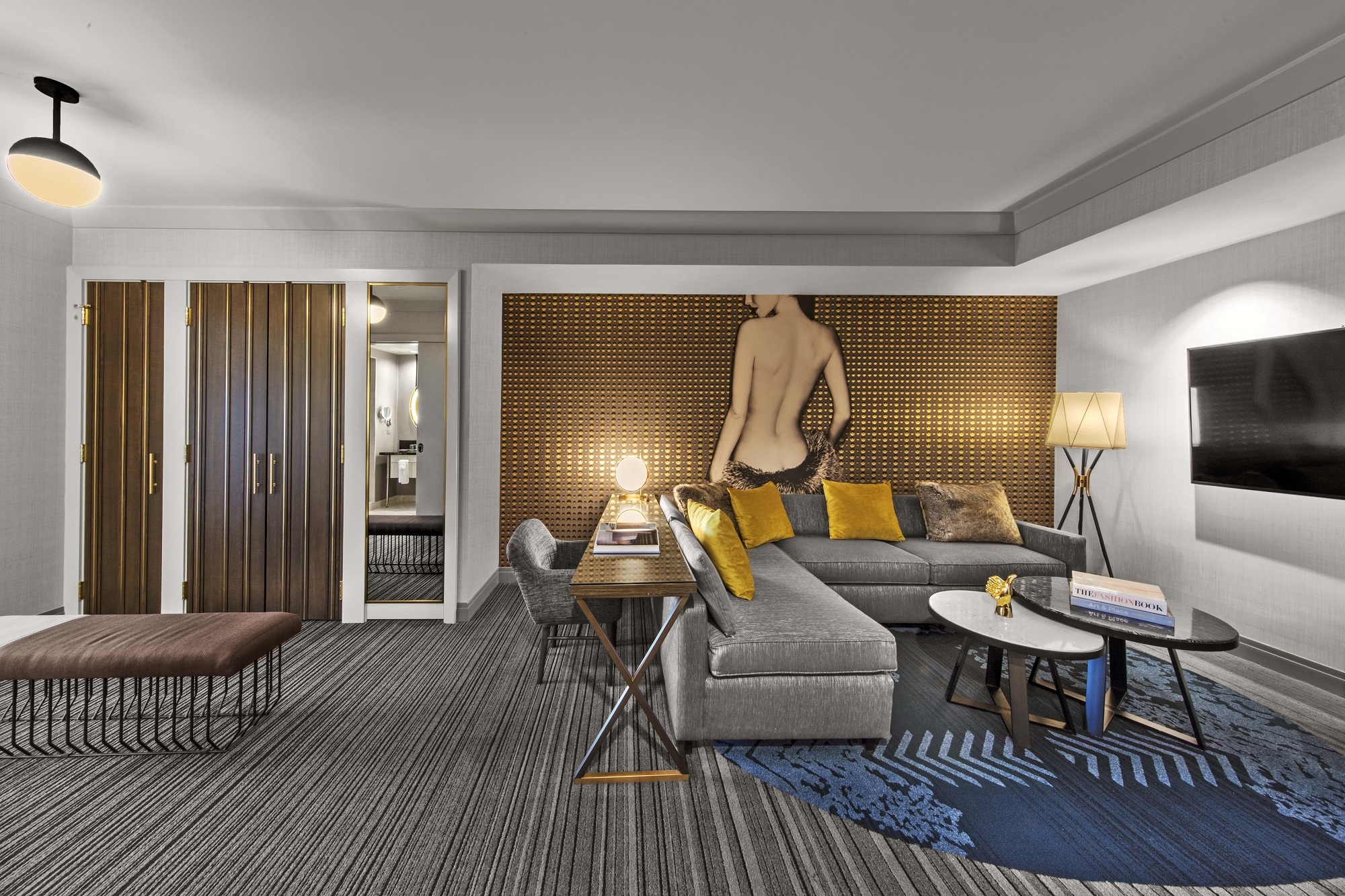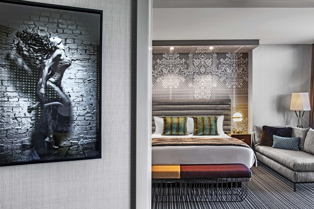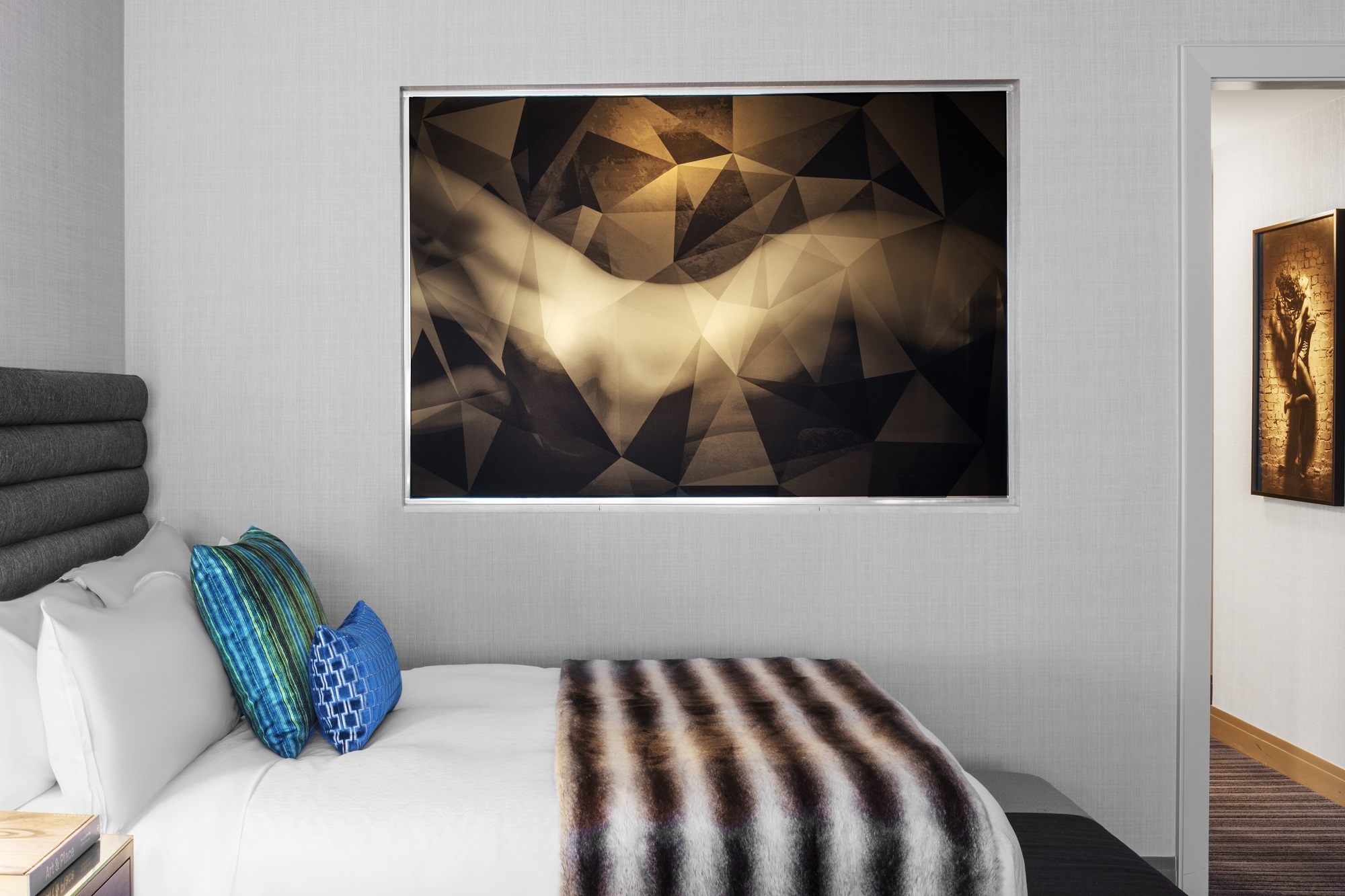 Art played an integral role in the bringing the rooms to life. Each image in the rooms represents a theater stage featuring a select set of players who introduce ideas to guests as to what the hotel's slogan could mean, playing to their fantasies, while leaving them open to interpretation. Our firm employed numerous special techniques to bring edge and sophistication to the art pieces, which in turn elevated the room, giving them both depth and whimsy.