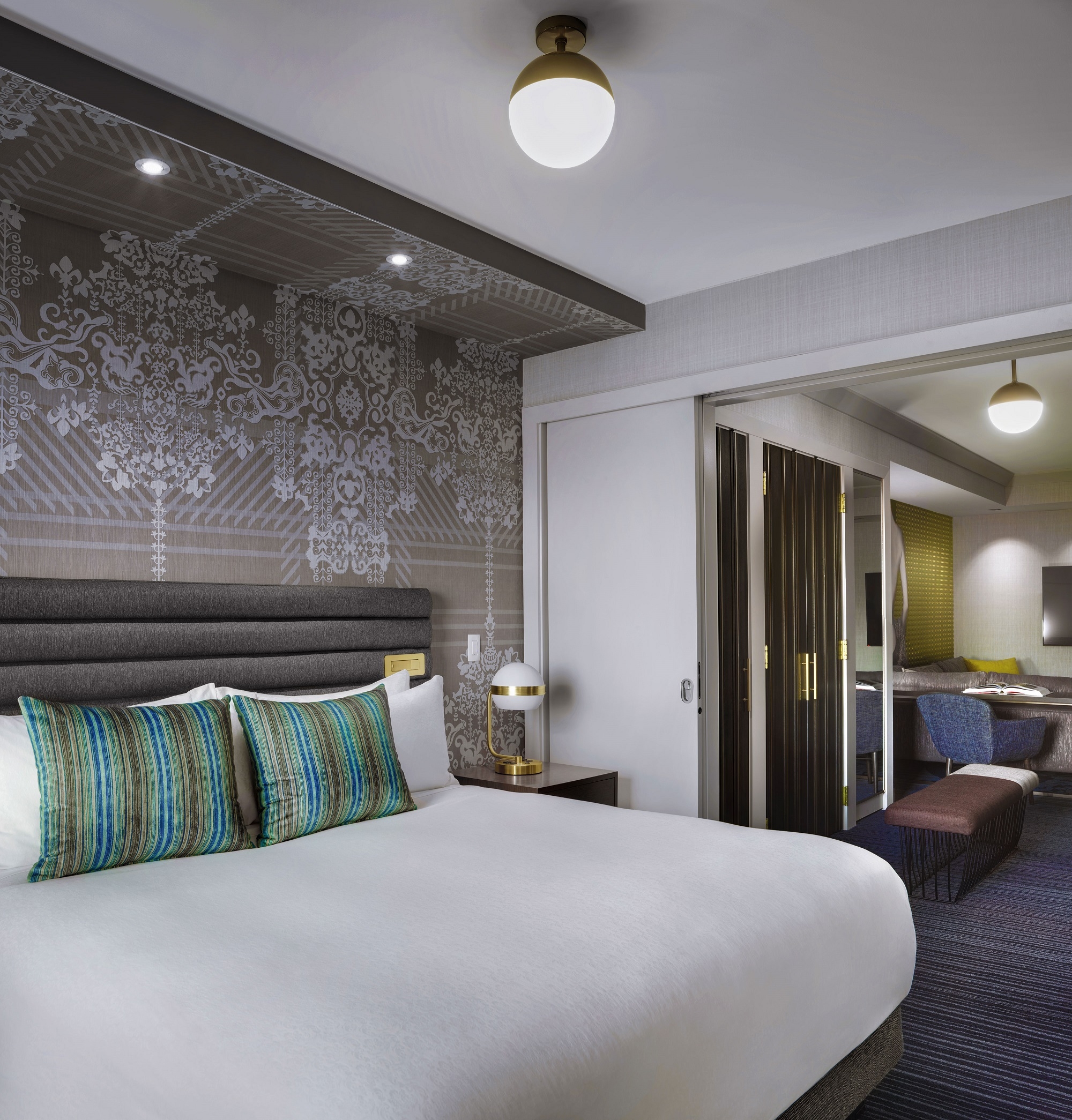 All the pieces were custom made and incorporate bold concepts. The colors used are subtle and sexy; we used a lot of jewel tones to evoke a sense of luxury. The furniture is very sculptural and define the rooms. There is a canopy over the headboards for example, that has a custom drawn damask pattern by V/S and takes up the entire wall, creating a room within a room.