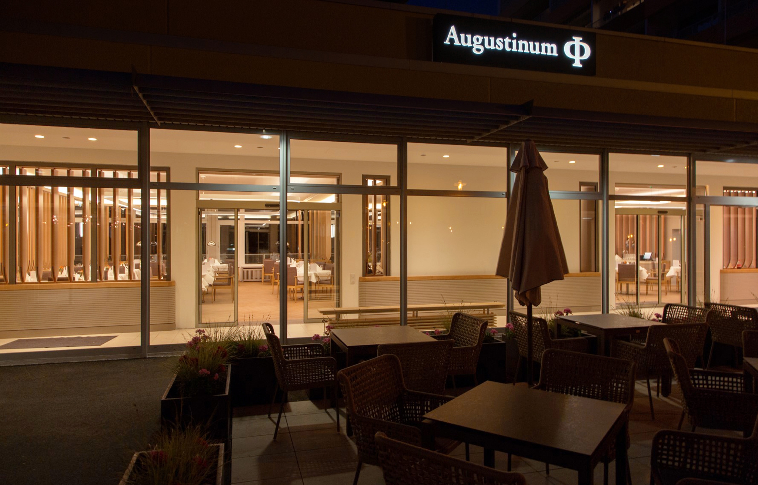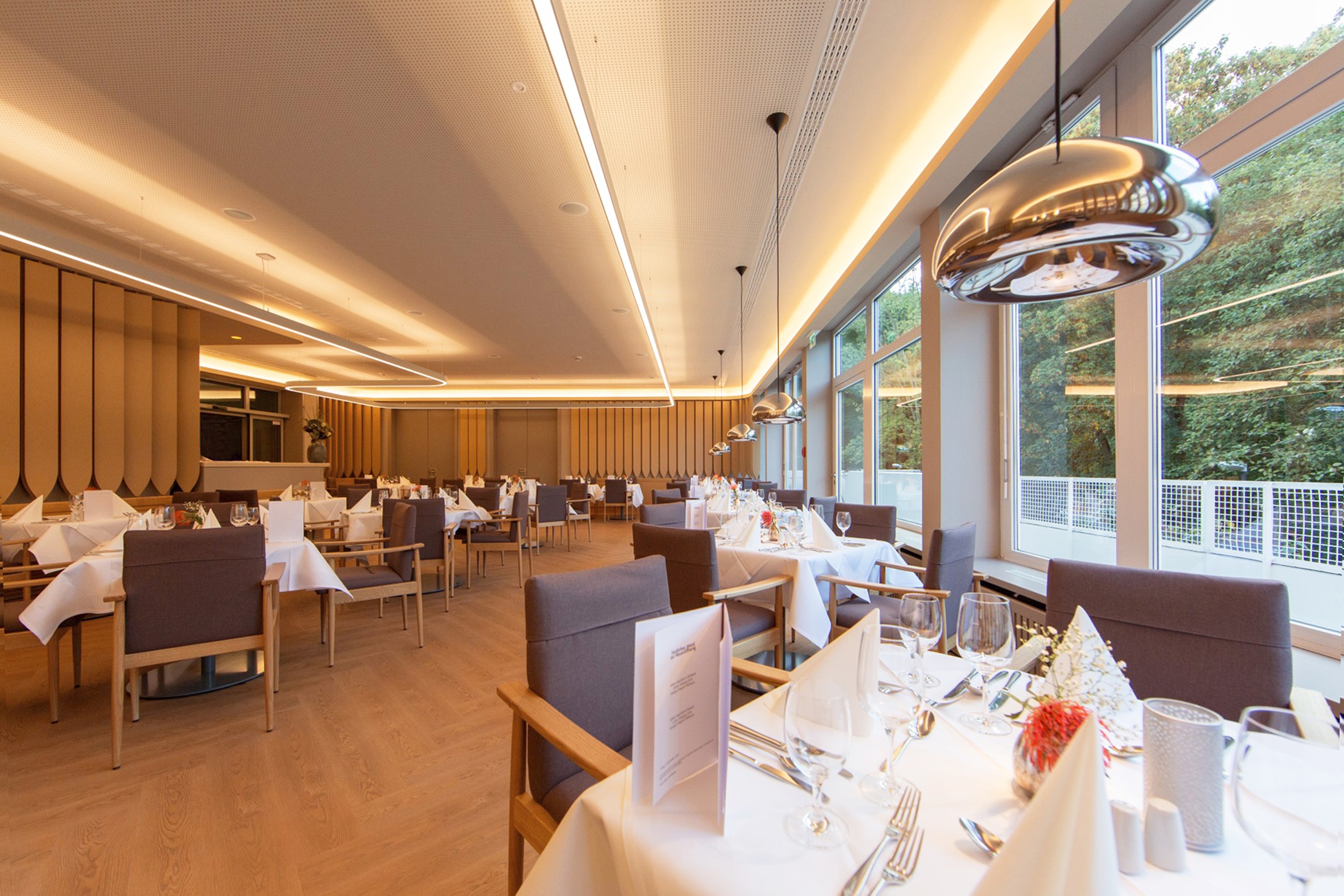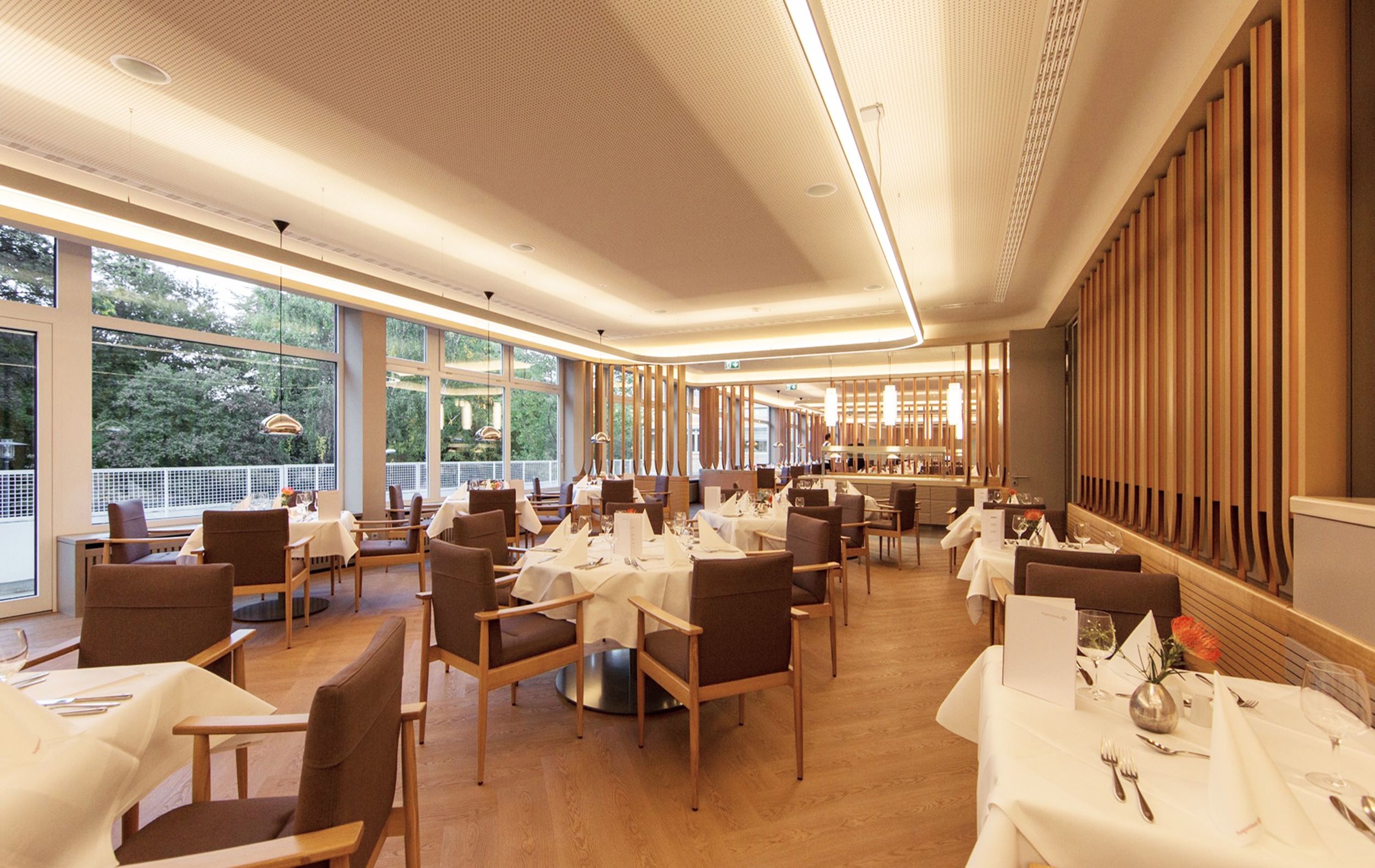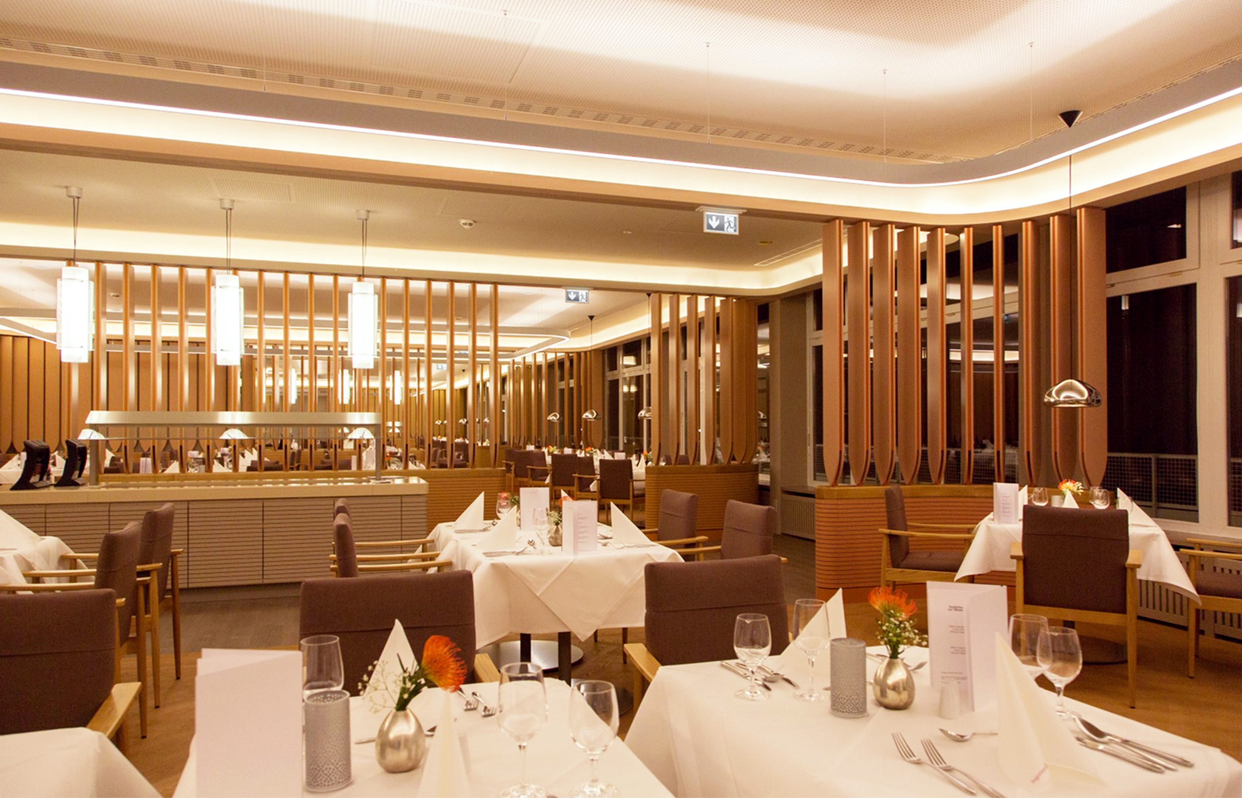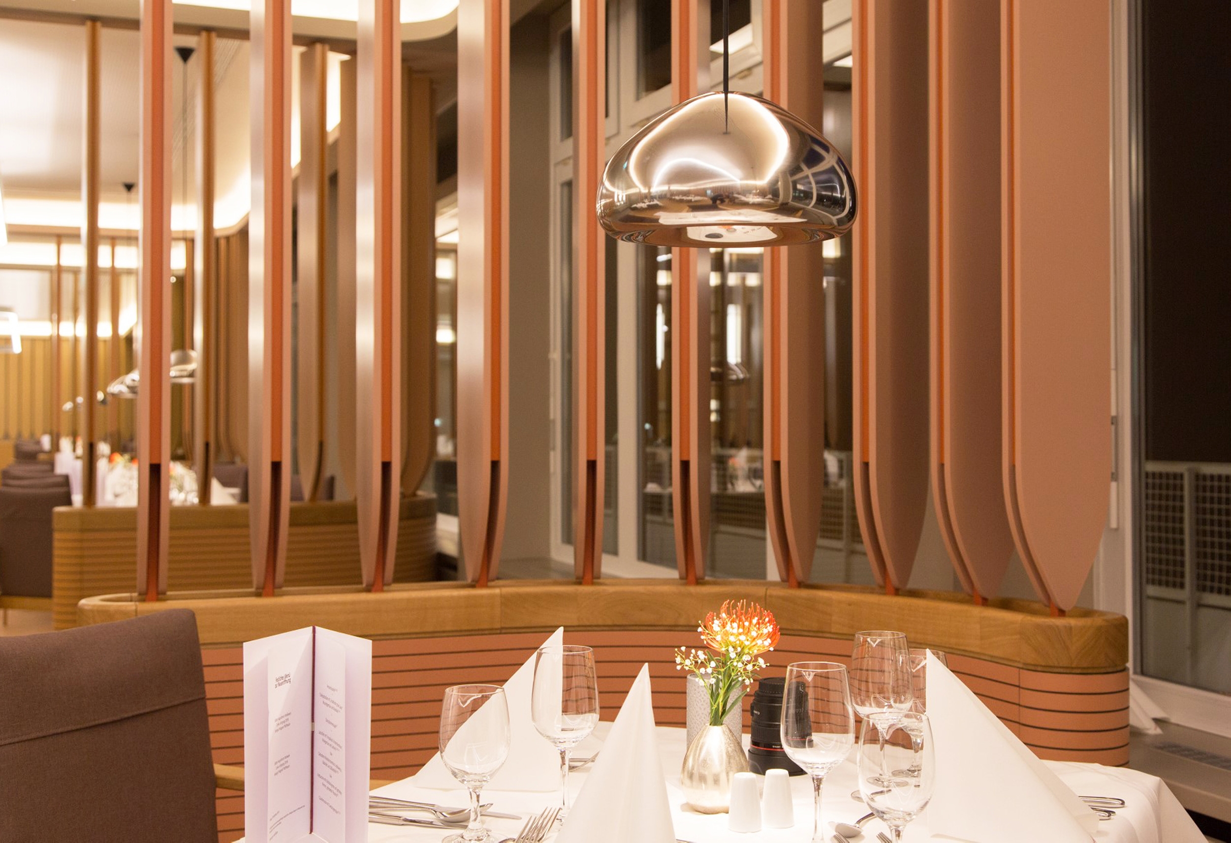 The main theme of the design are the slatted walls. They consist of balustrades with an acoustic surface and a 3D-milled handrail made of oak. With elegant corner roundings, they enclose the three restaurant areas and support the vertical slats. They create both privacy and transparency. Large interior glazing spatially integrates the foyer and corridor and creates spaciousness and, most importantly, brings in more light.
