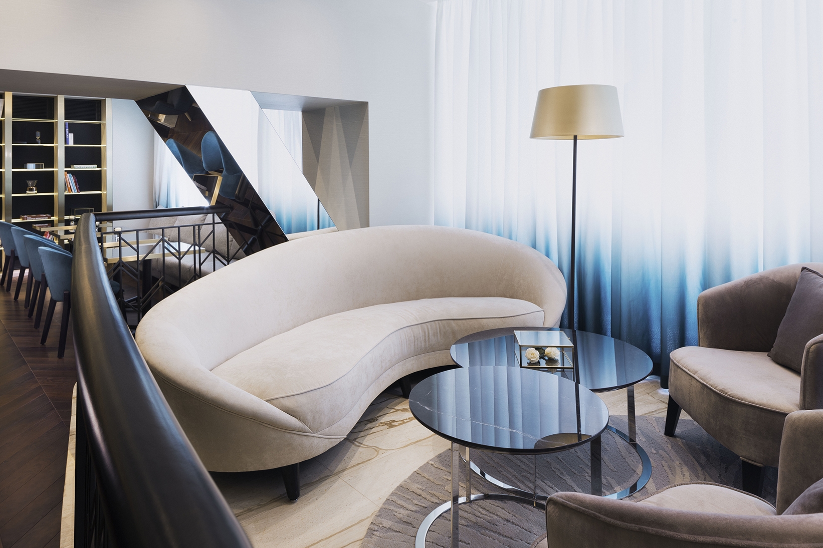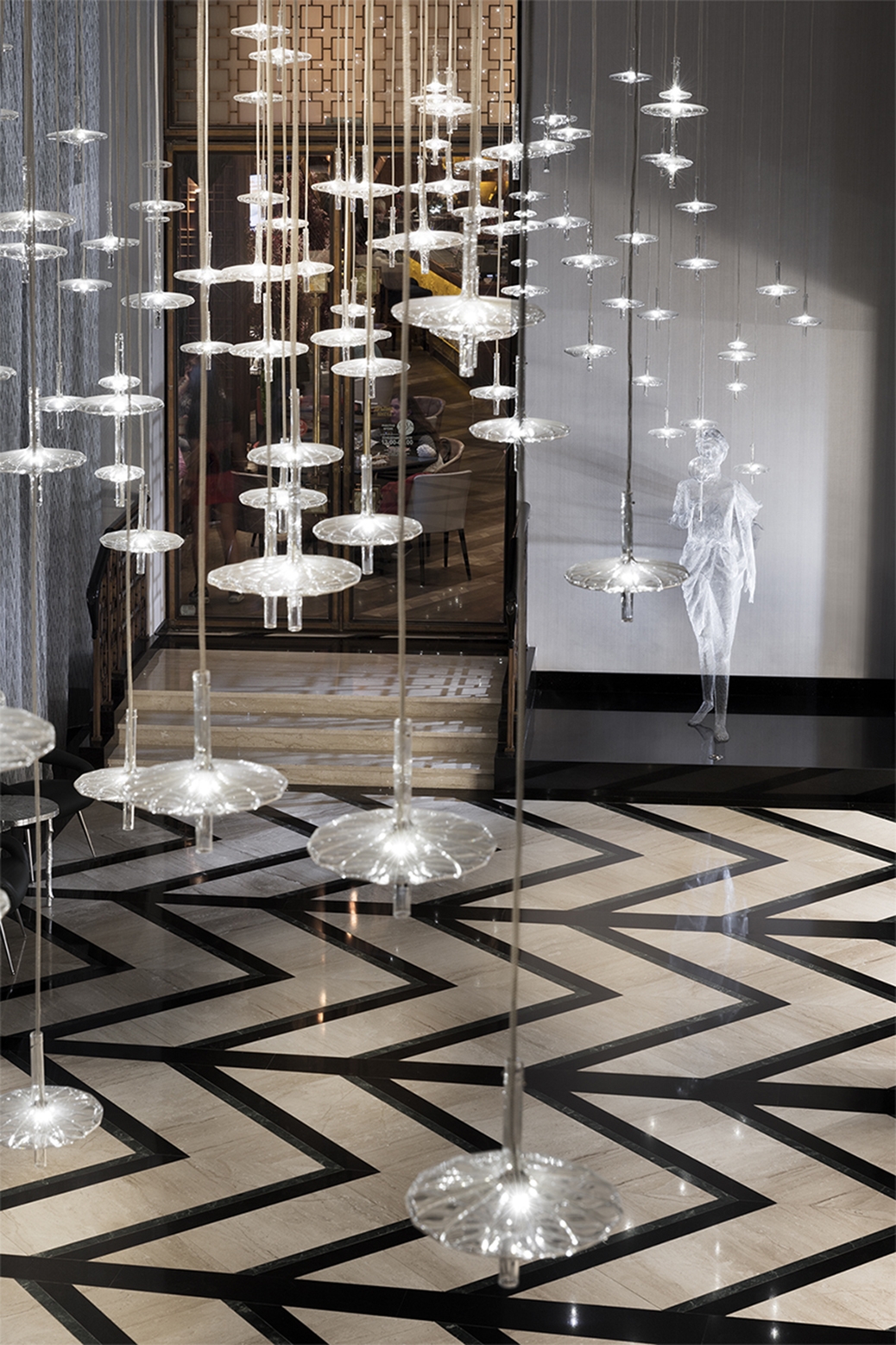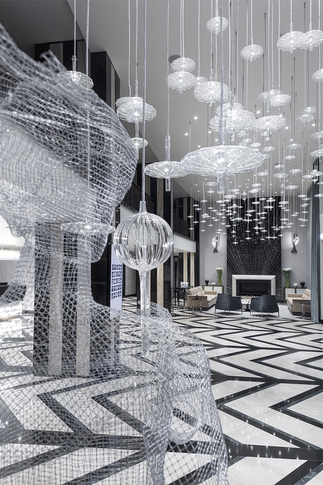 The approach for this project is directed with the scope and depth suggesting this emblematical building for Sofia, situated in one of the most important squares of the city, representing recent history of the country. Alex Kovachev and Studio Idea International direct their focus on the historic meaning of the area, connecting it with the desire of change, hope, youth and free will. The imagination translates that, in the language of interior design, and crates the delicate installation (Harmony or Art and Light), which communicates an emotional veil above the whole foyer of the hotel. The wire sculpture of a girl and the cascade of glass lights, spinning along like soft dandelion petals is a metaphor of harmony and fragility.