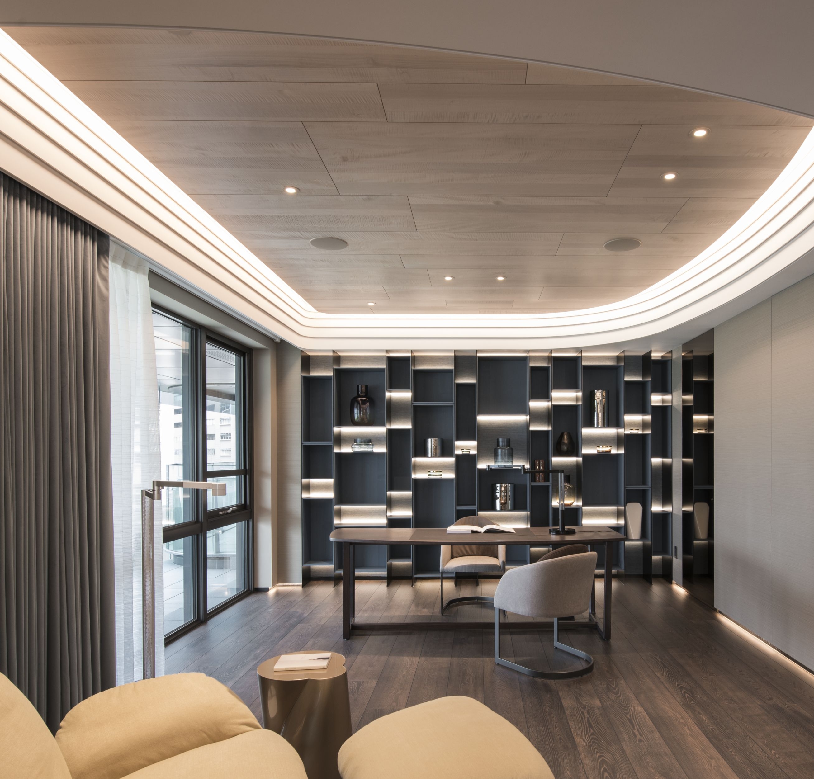 Designer Chen broke up the existing interior rectangular compartmentalized partitions so the open plan's interior walls following the exterior shape design to achieve the idea of internal and external resonance.