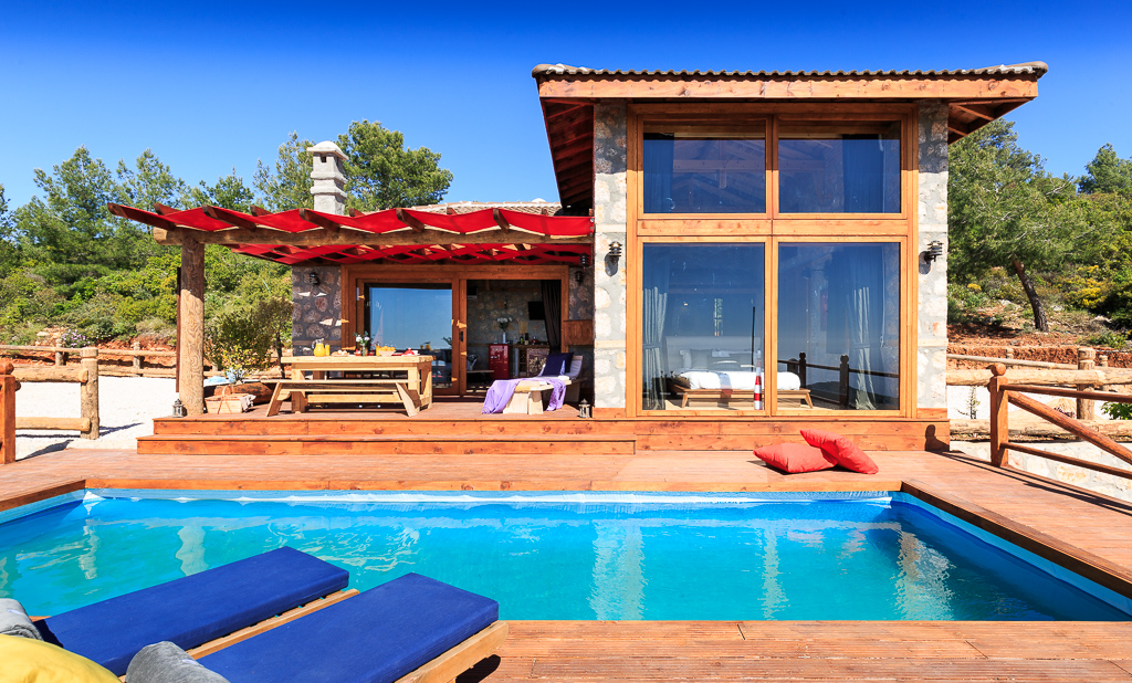 There are lovely private swimming pool villas and shared swimming pool and spacious sun deck overlooking the glorious Patara Beach, and anyone with a penchant for boutique style will love the interiors – an eclectic, Pantone-palette of primary colours against rustic stone.