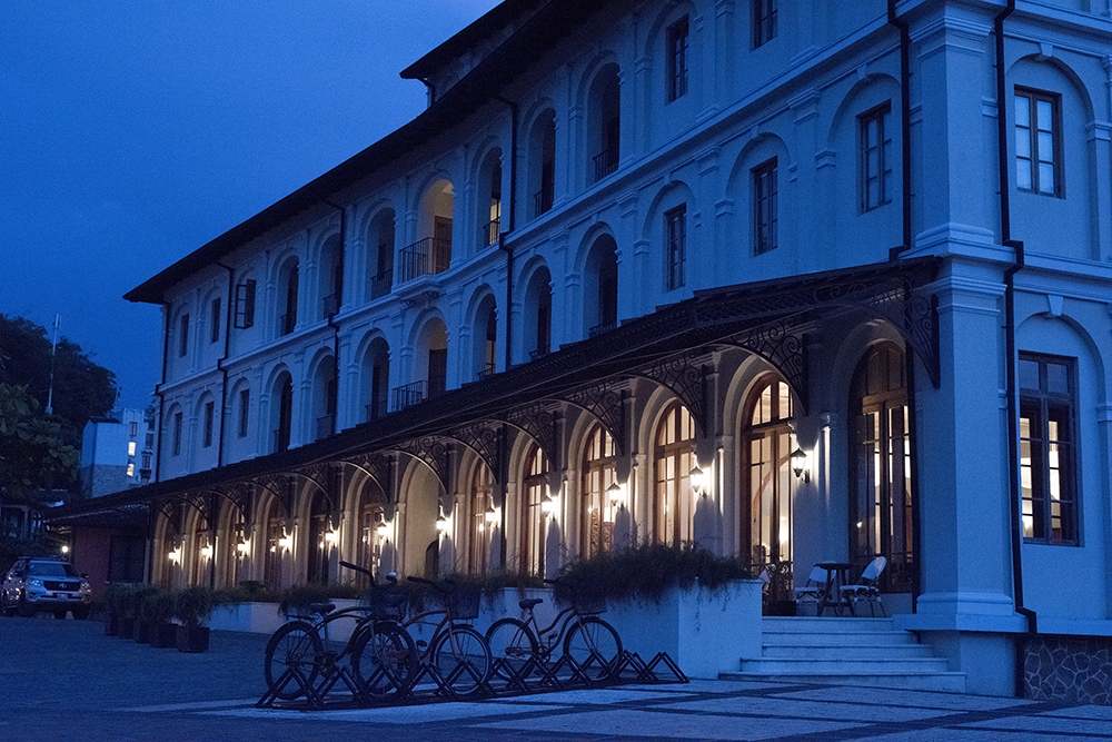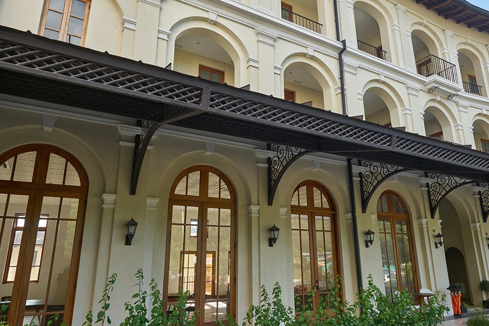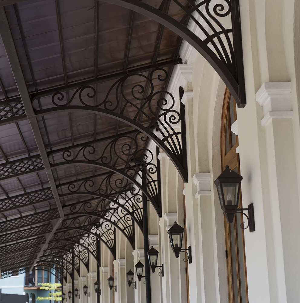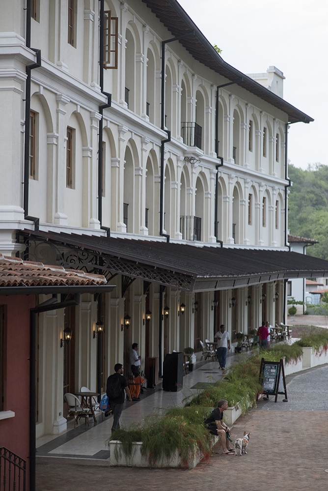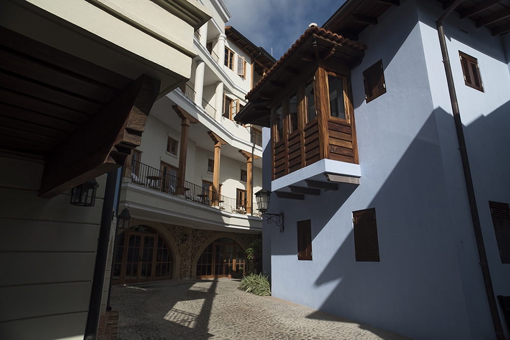Plaza Central Building's construction is all hand made by local craftsmen, still skilled in the building arts. The two long sides of the building are both concave, forming a bow tie plan. The East Elevation welcomes visitors as the gateway to the resort.