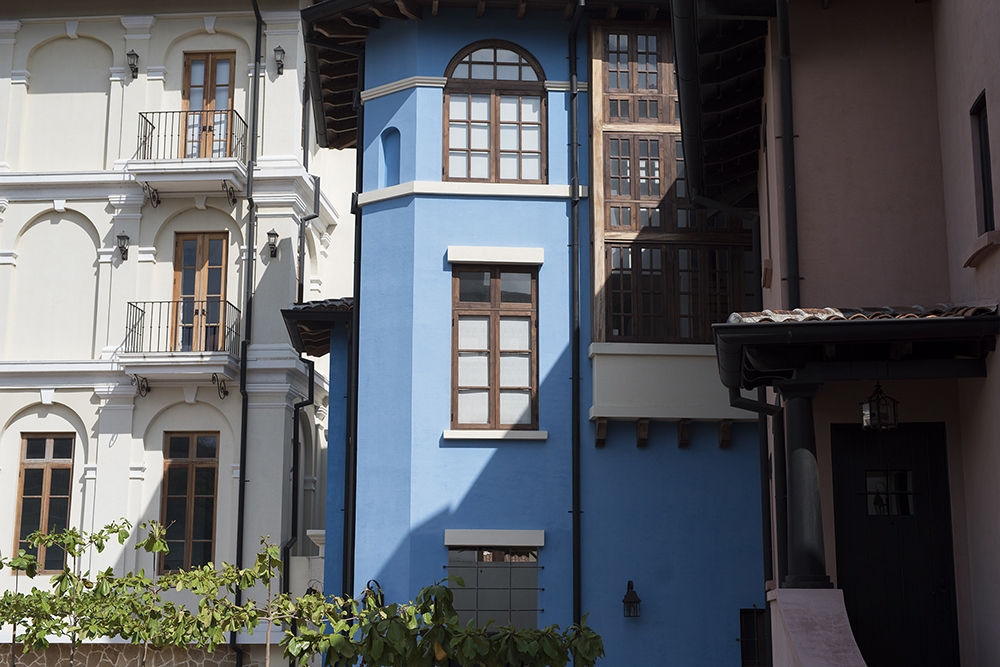 The West, Pacific-facing, Elevation abuts a skinny twisting street. The facade articulates into what seem separate “buildings,” which add to the intimate discovery of the narrow street, lined with shops.