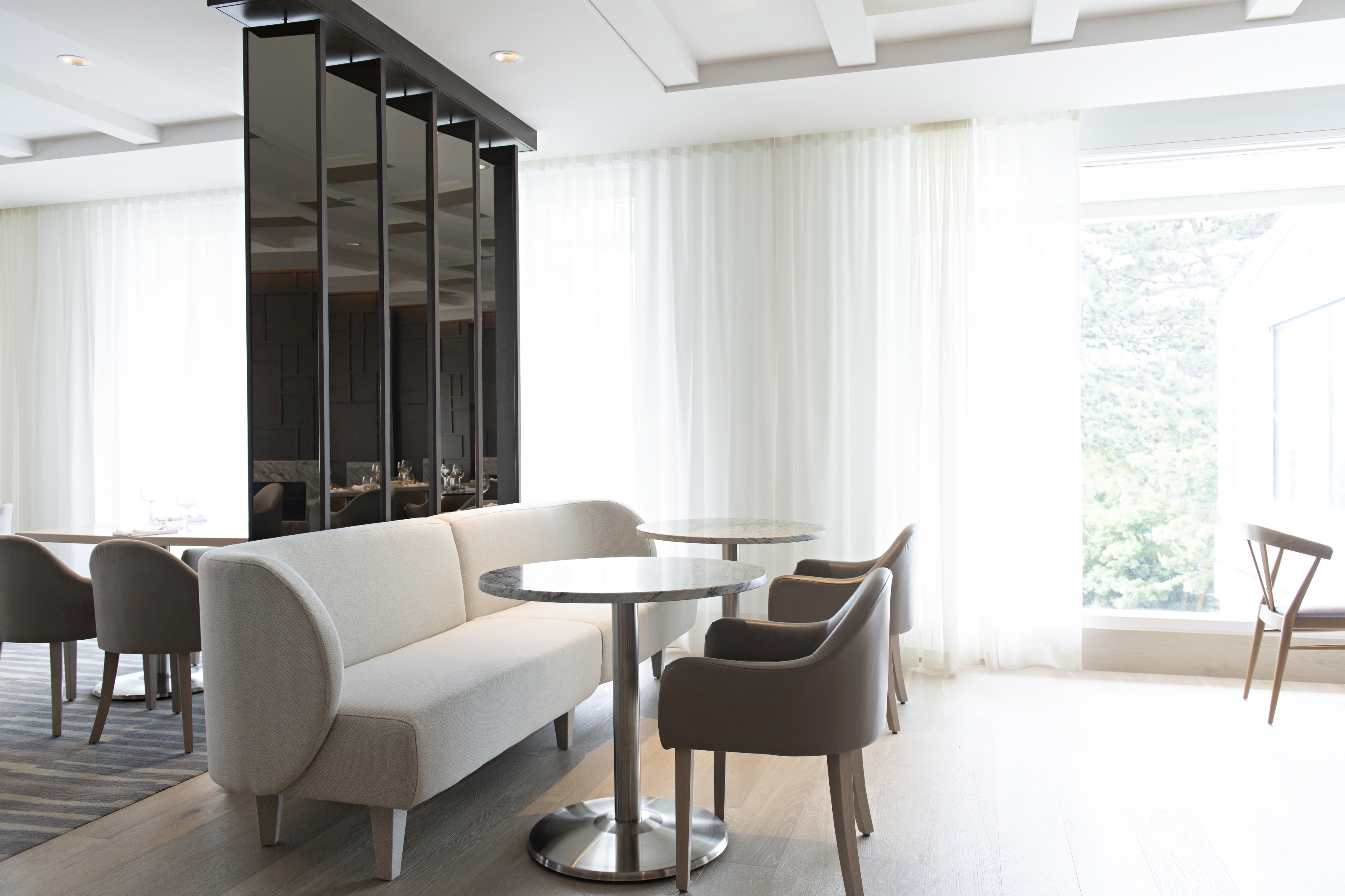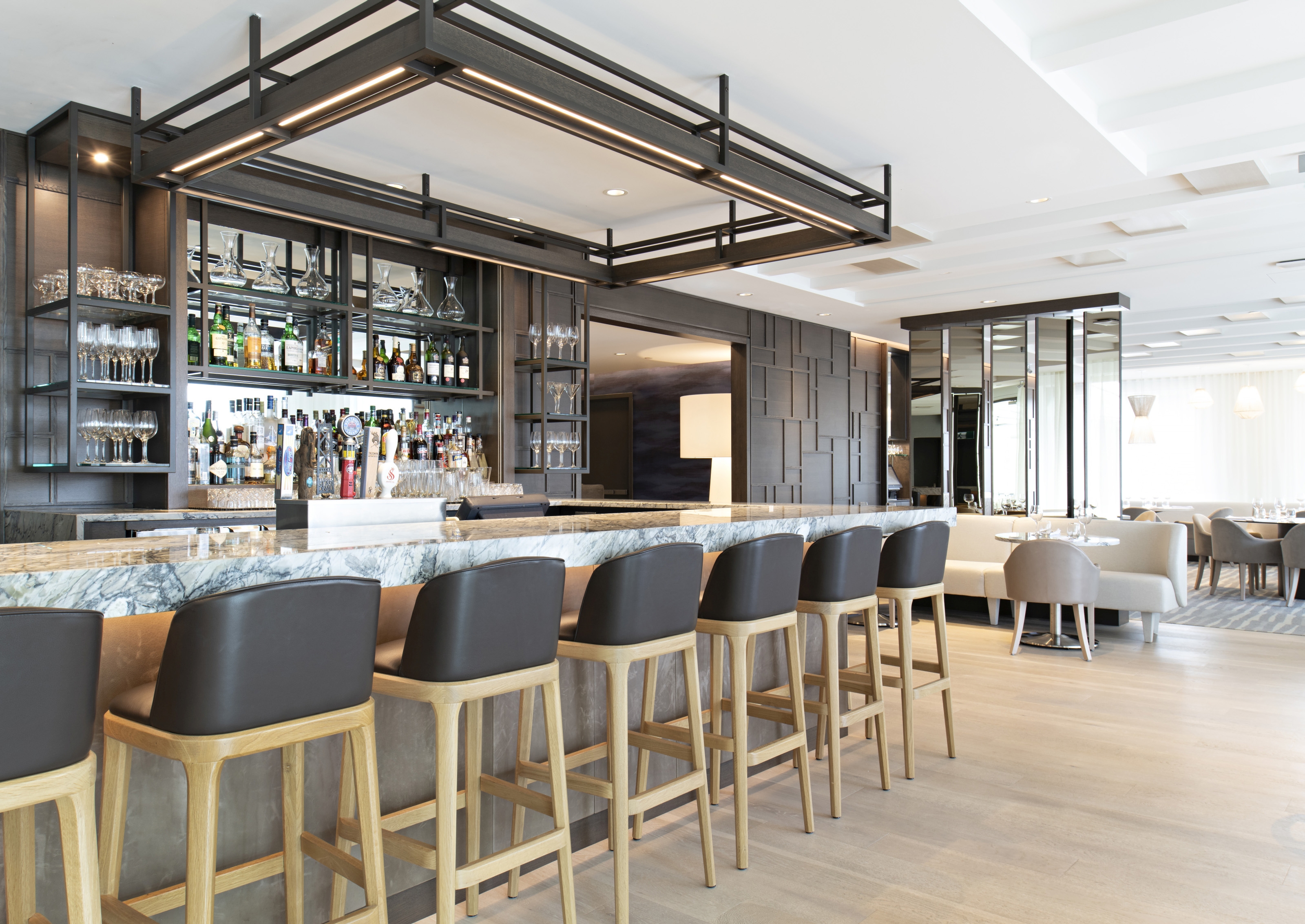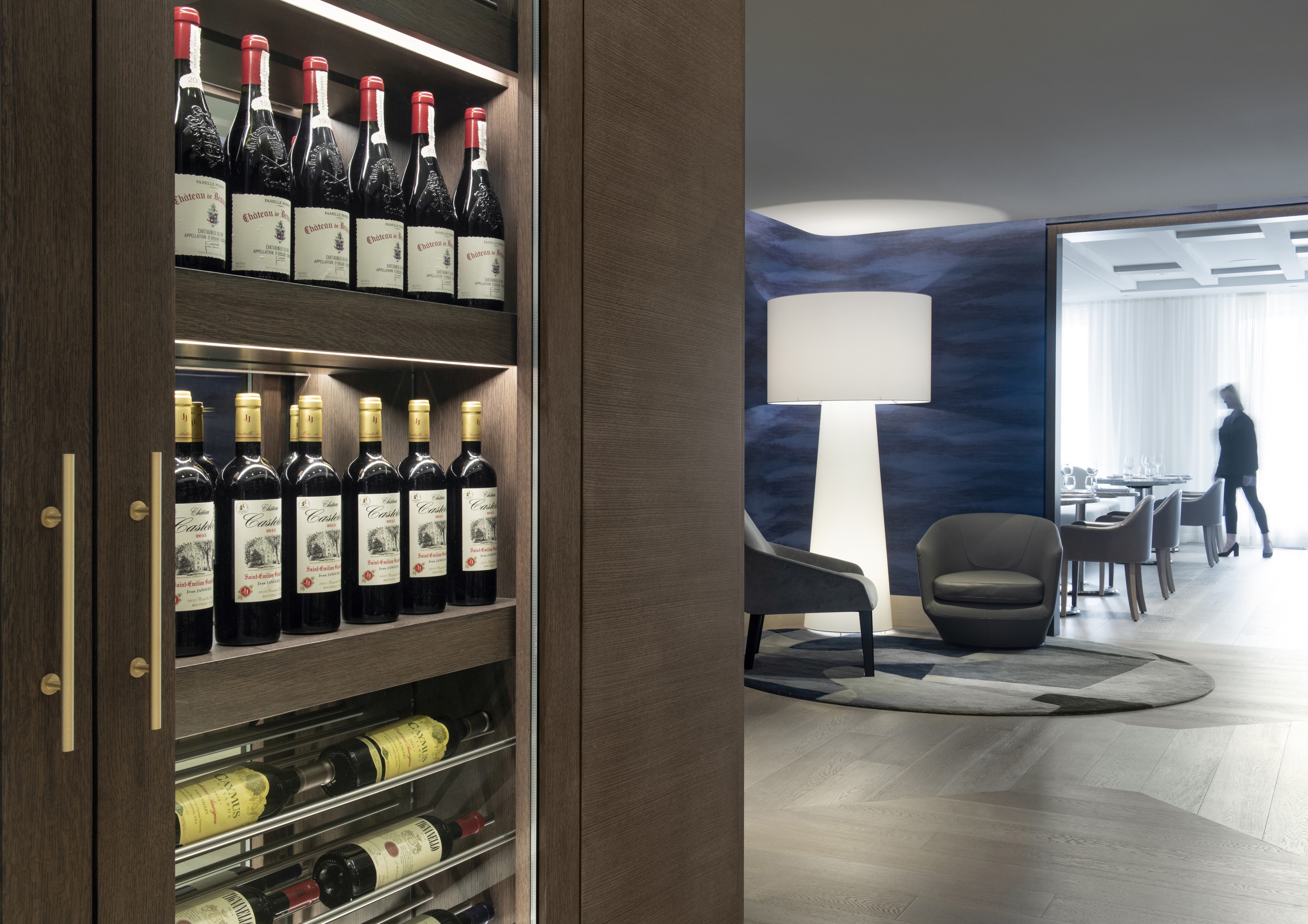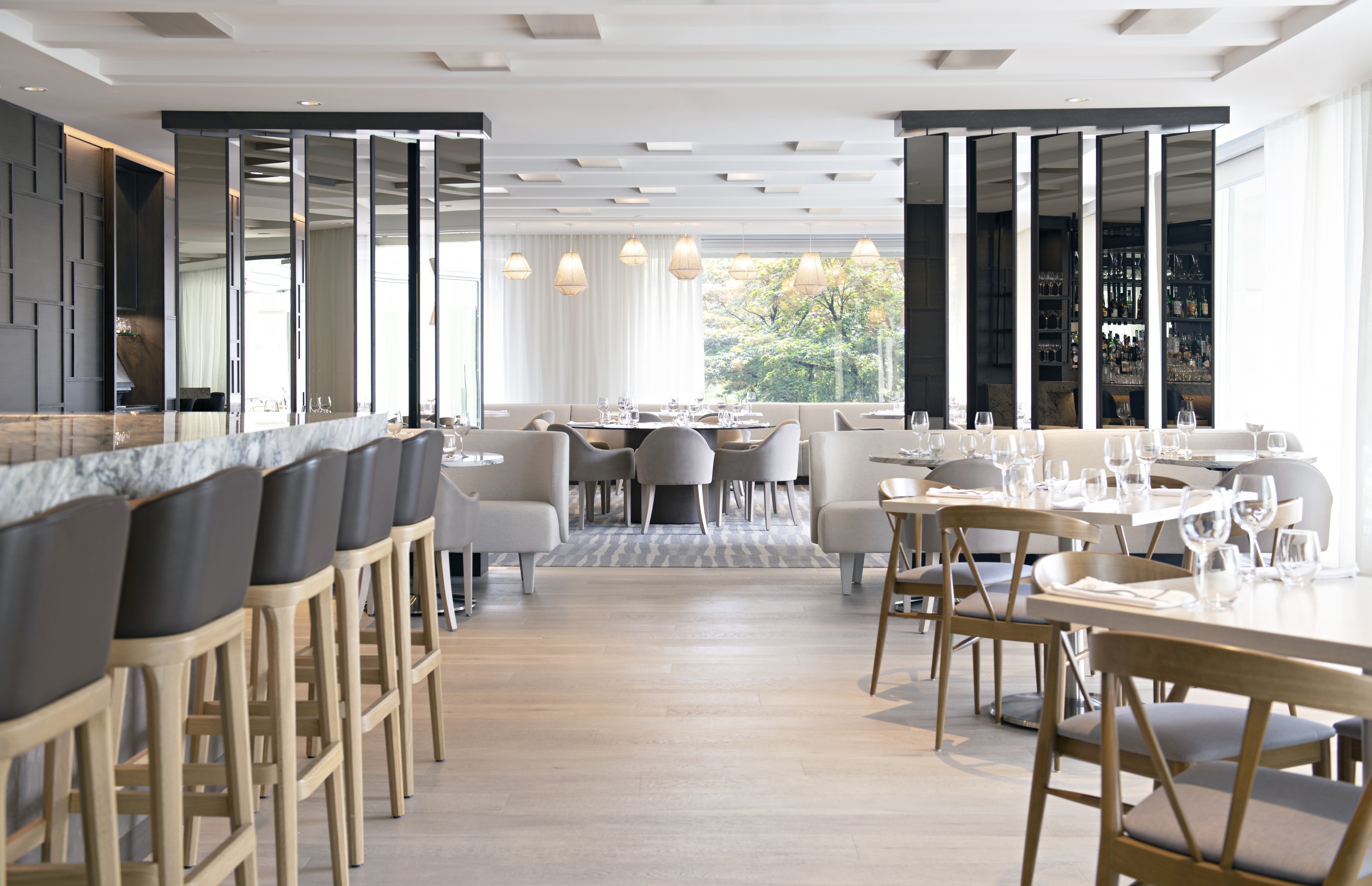 Wine walls, pivoting wood/mirror panels, and materiality changes, subtly divide the space to create intimacy and sense of place. The new central bar location acts as the heart.