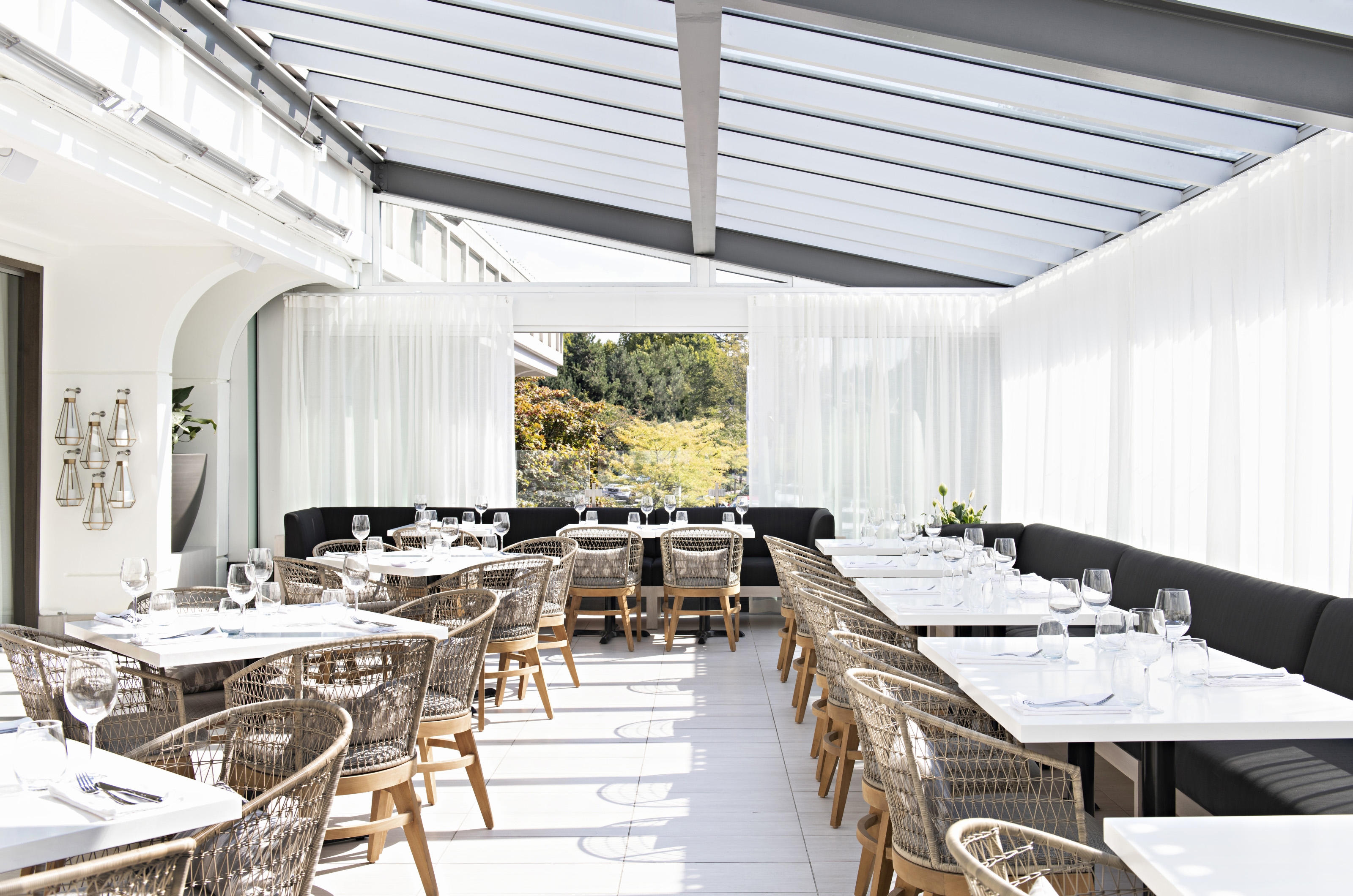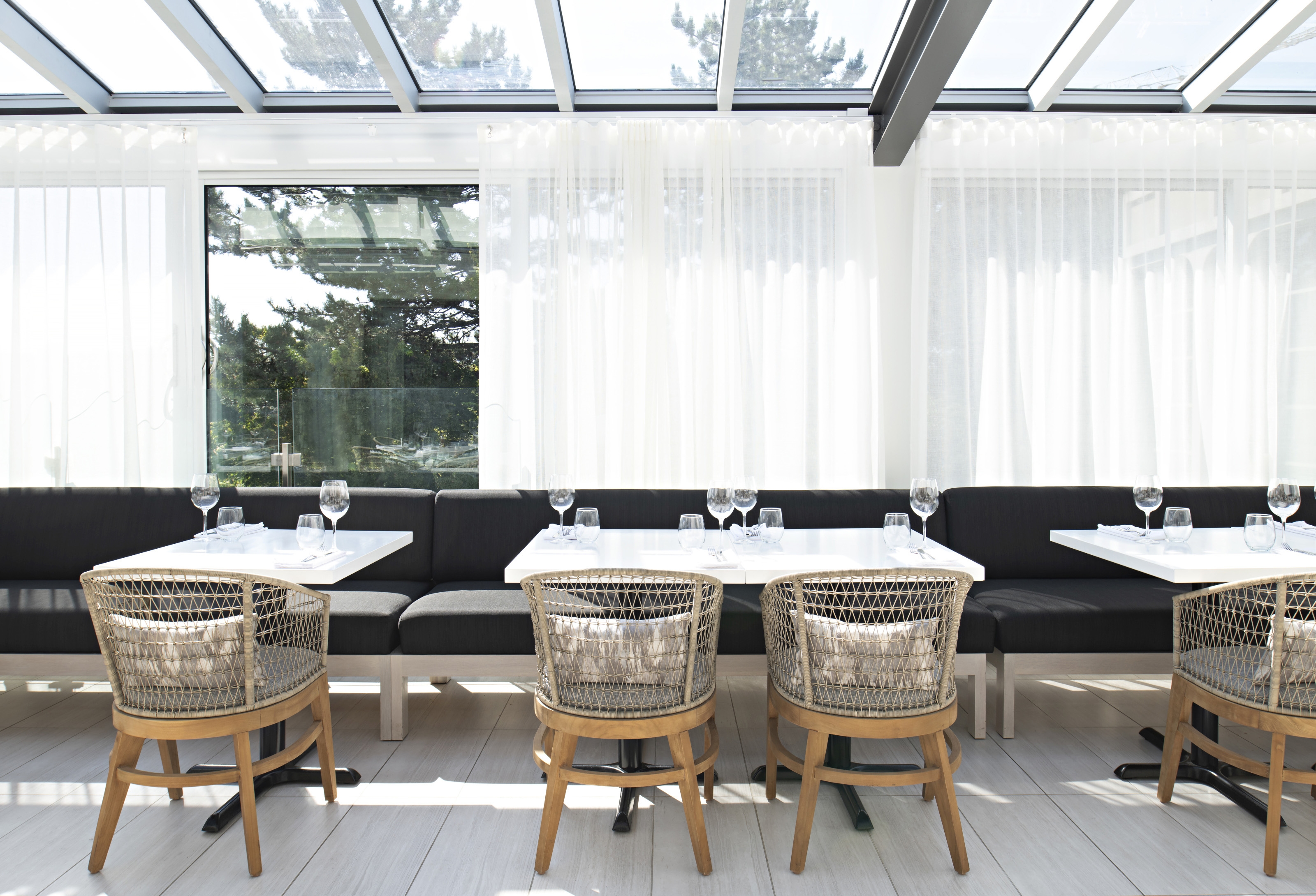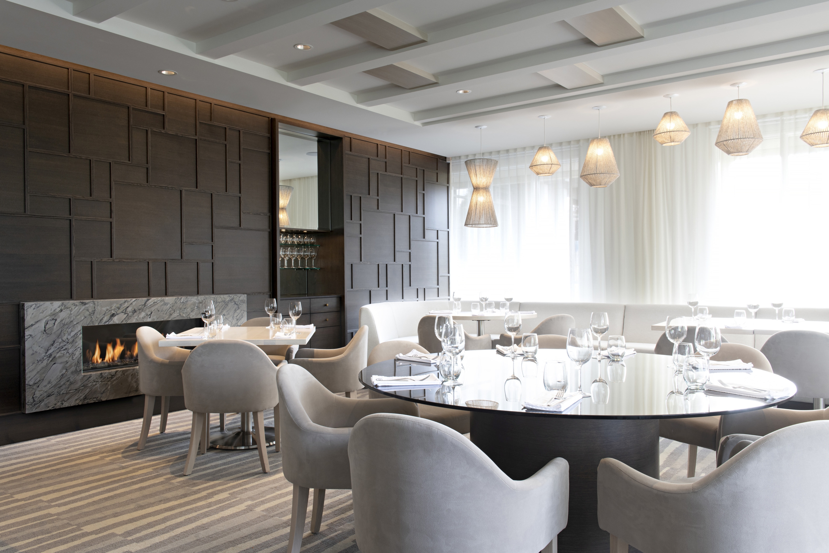 Inspired by the mid-century building architecture and ‘80’s era blonde interiors, the South and west glazing was given a counterpoint of dark wood panels; balancing a fresh ambience with depth. The central fireplace draws diners to the flame.