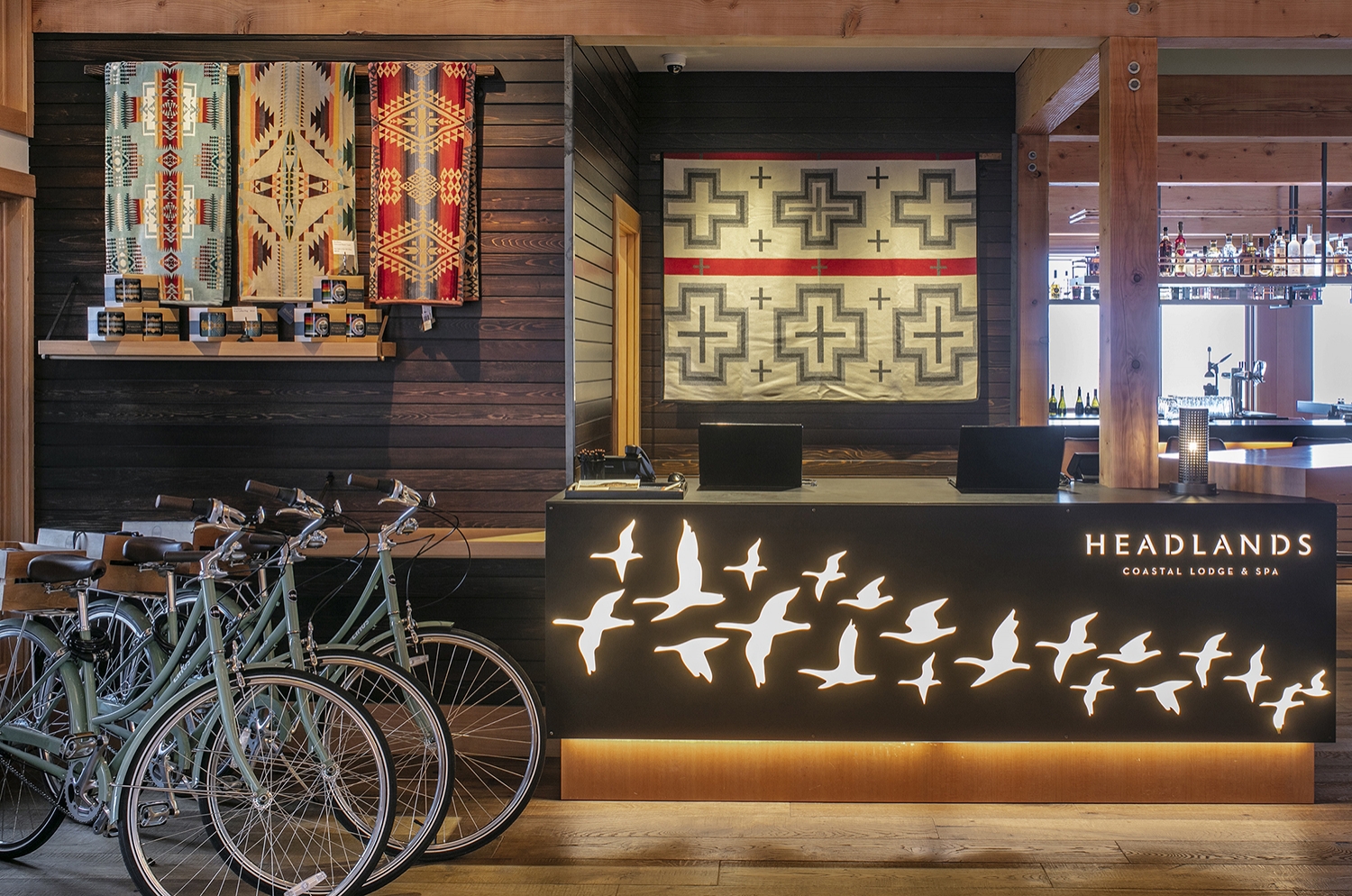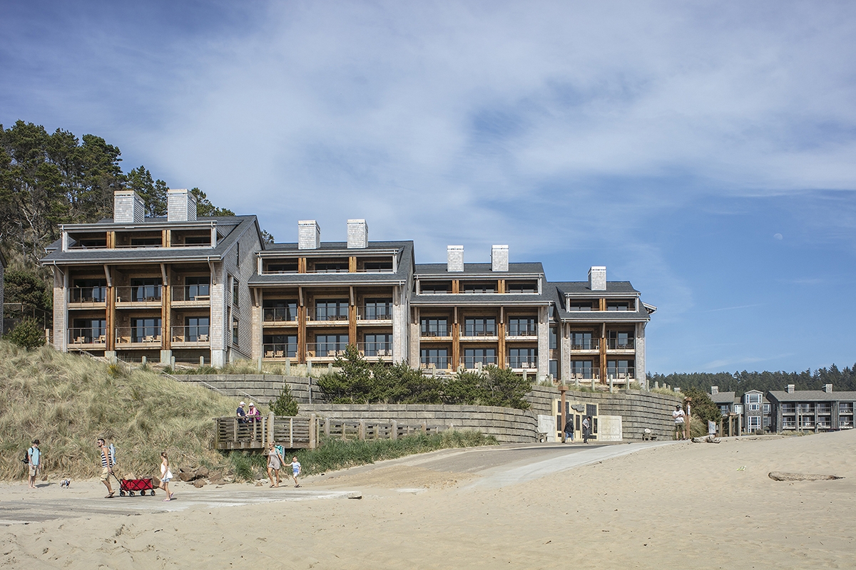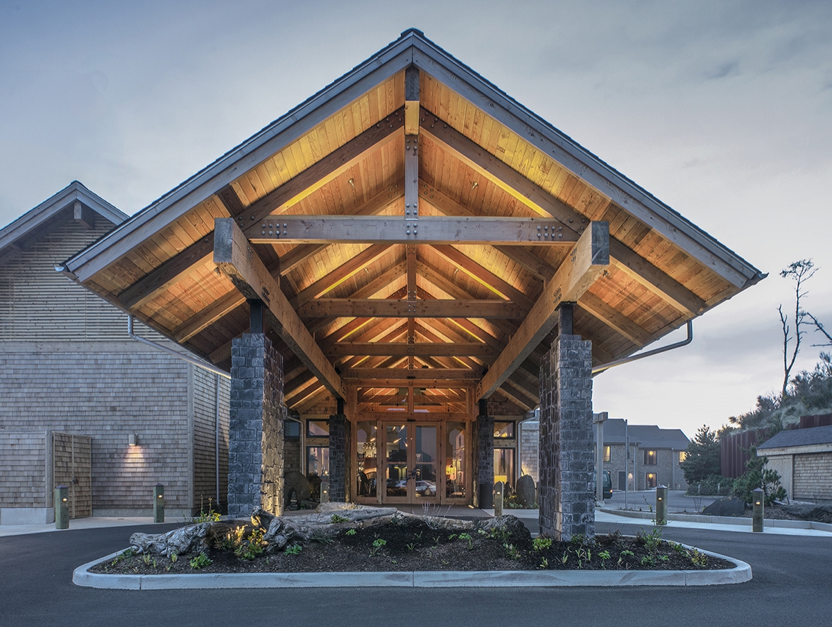 When guests arrive, they are led up a meandering cedar walkway into a dramatic gabled entrance that continues through the lobby. The liberal use of wood and dark stone, complimented by local artwork and Pendleton fabrics, creates a lodge-like feeling throughout. Cedar and steel beams frame ocean views from each of the 33 guest rooms. Amenities include an ocean-view bar and restaurant; various serene, fire-lit nooks; and a luxurious fitness and day spa.