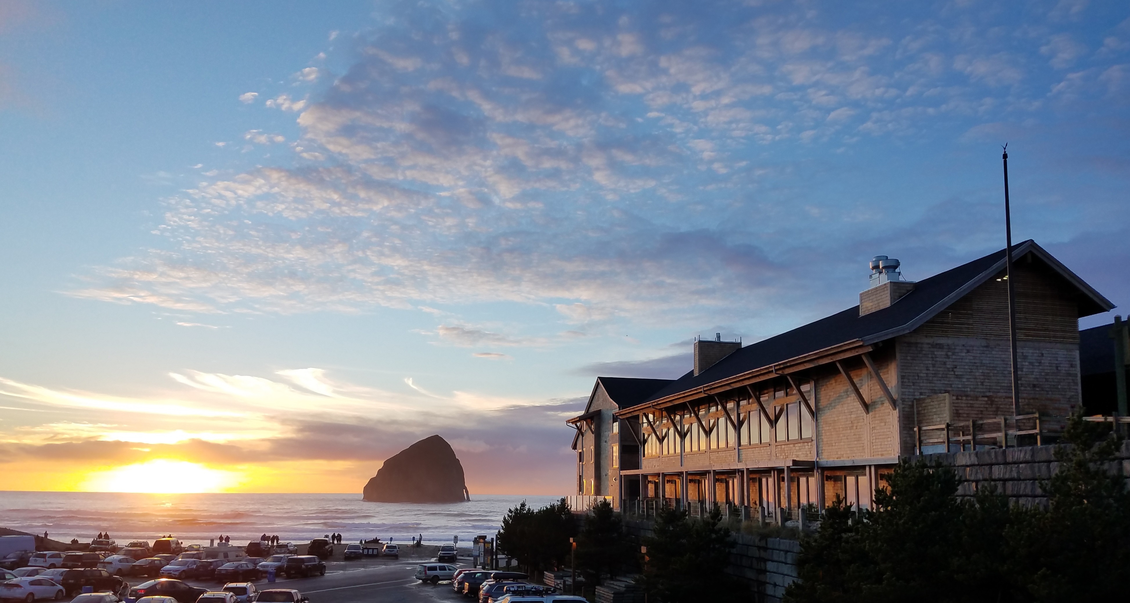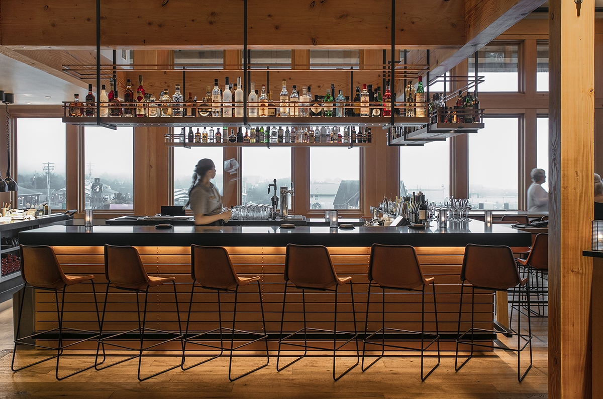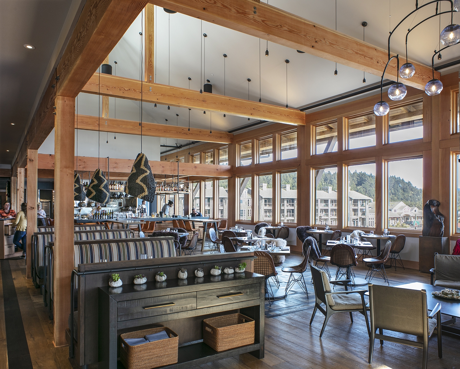 When guests arrive, they are led up a meandering cedar walkway into a dramatic gabled entrance that continues through the lobby. The liberal use of wood and dark stone, complimented by local artwork and Pendleton fabrics, creates a lodge-like feeling throughout. Cedar and steel beams frame ocean views from each of the 33 guest rooms. Amenities include an ocean-view bar and restaurant; various serene, fire-lit nooks; and a luxurious fitness and day spa.