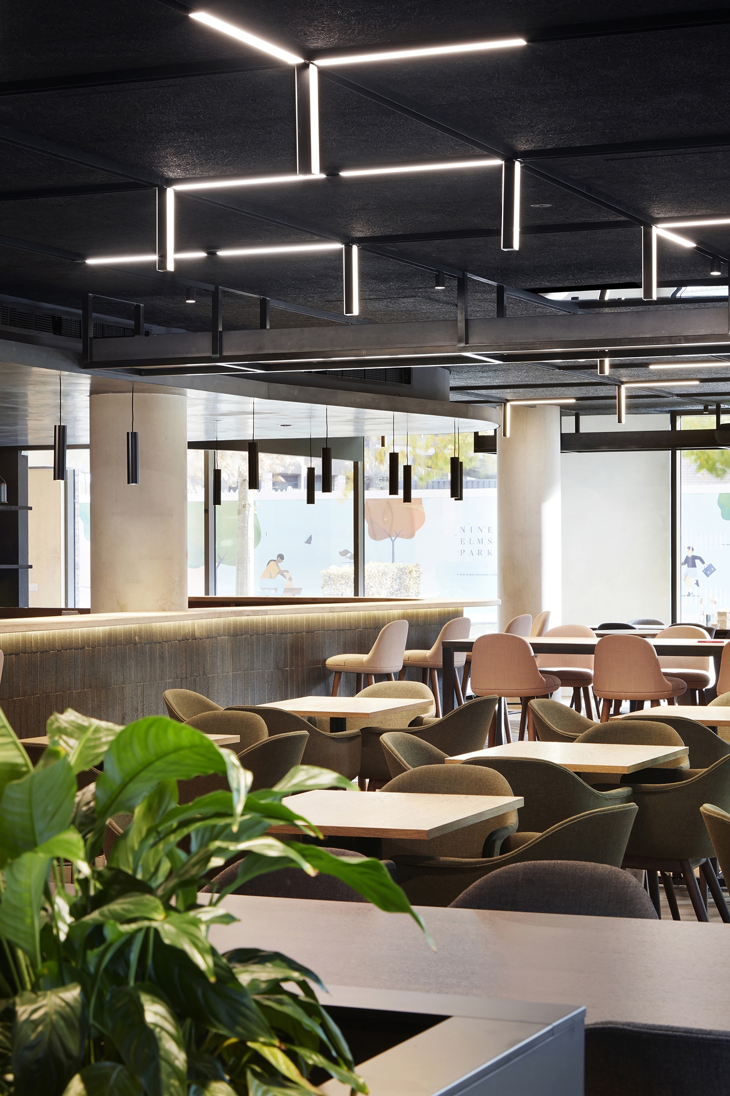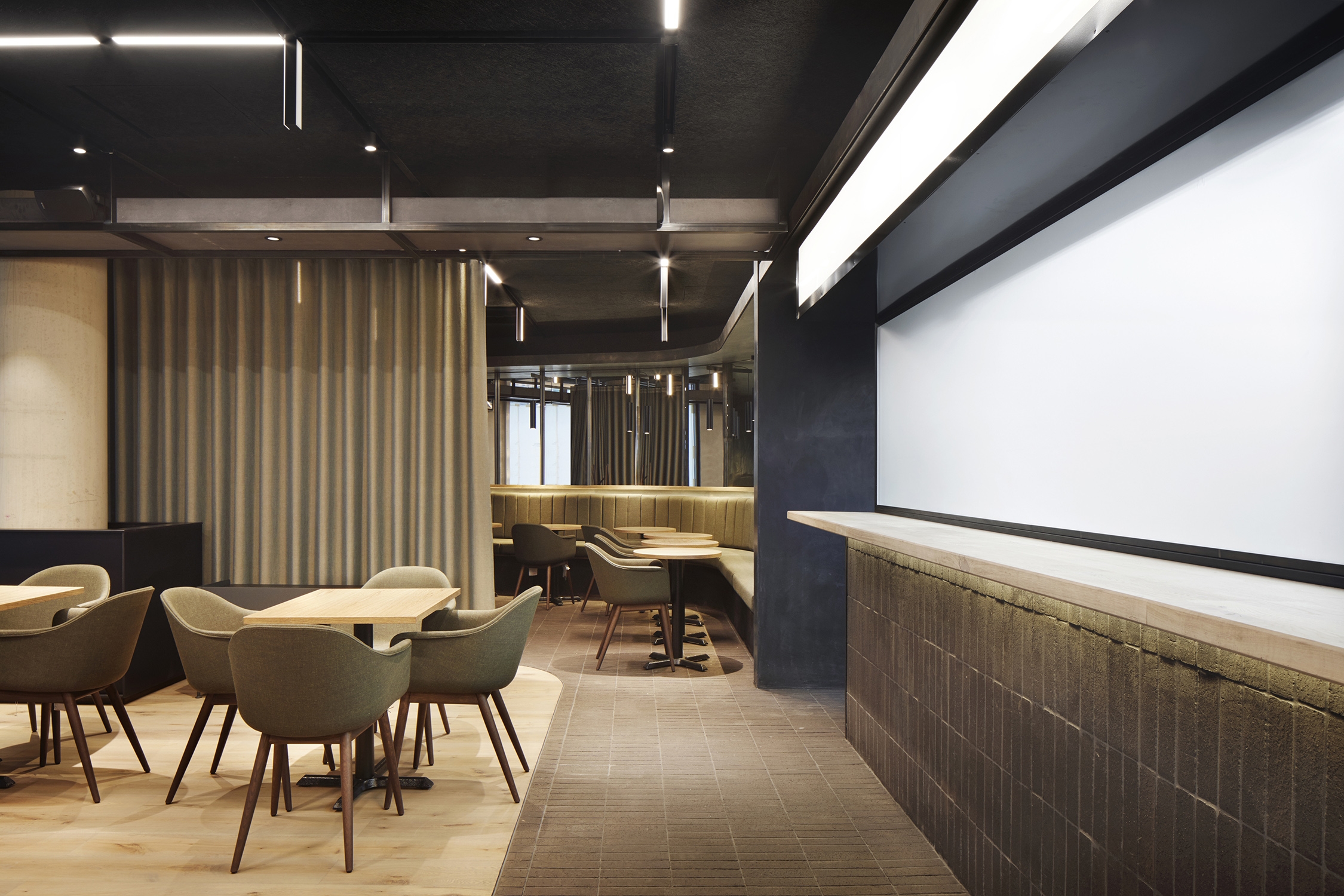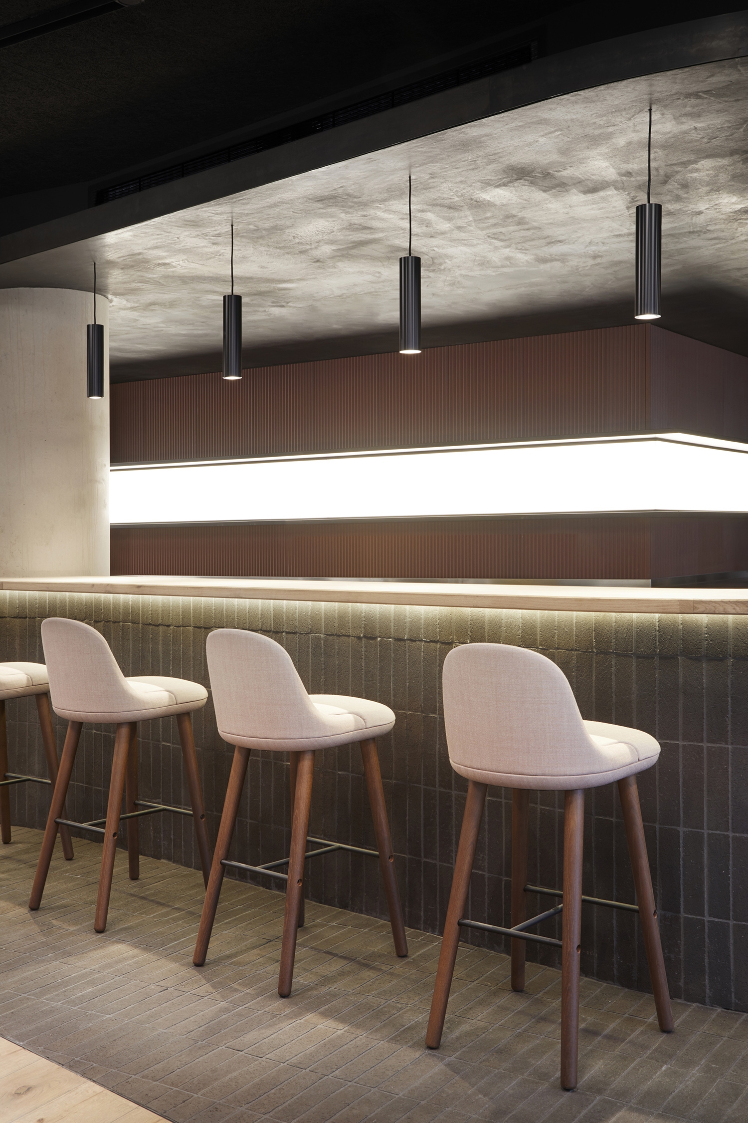 The material language of the space draws inspiration from hard and soft boundaries that are typically juxtaposed within the urban realm: the design is characterised by hard surfaces such as brick, blackened steel and polished plaster set against softer fabrics, planting and warm oak linings throughout.
