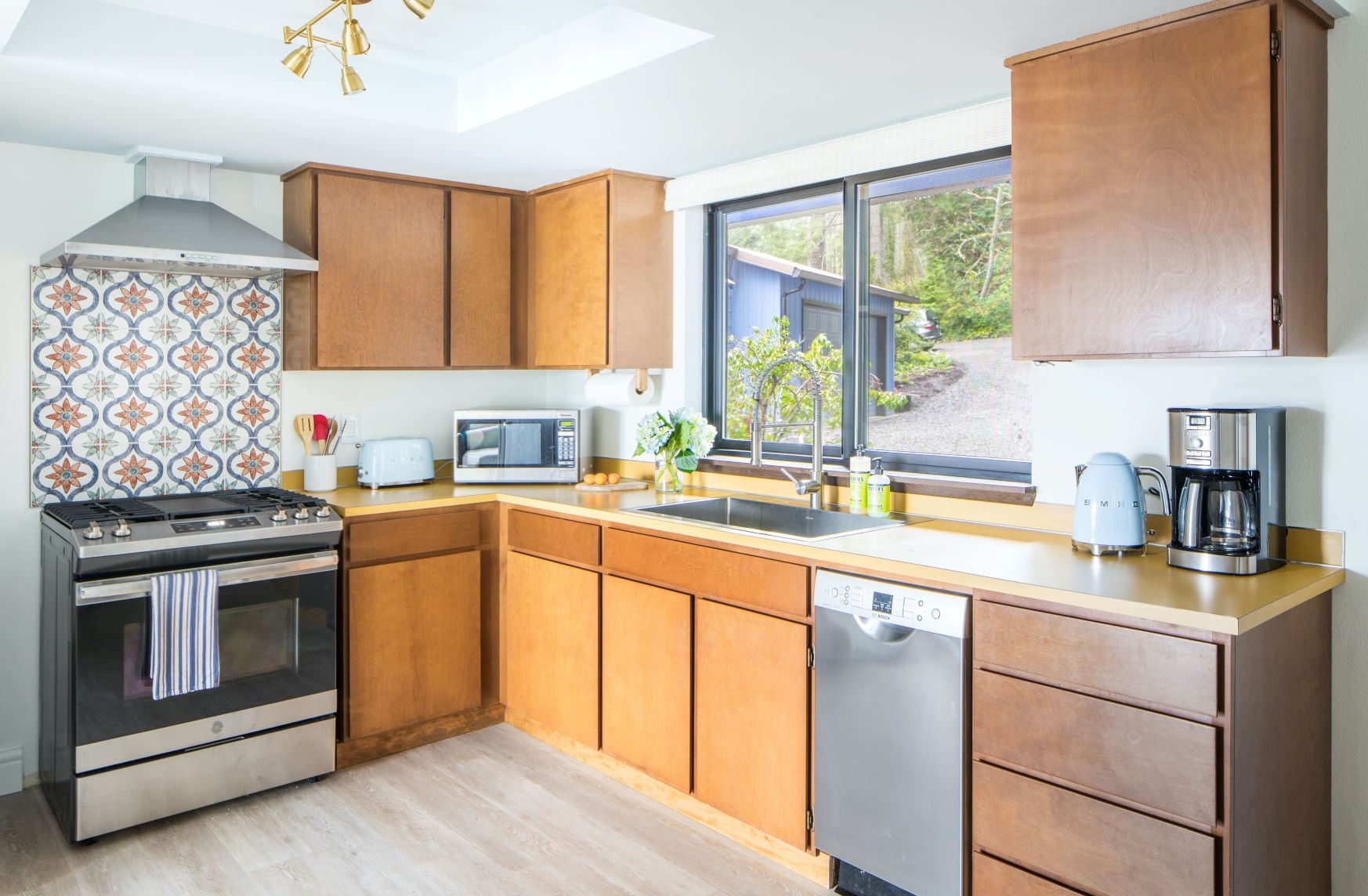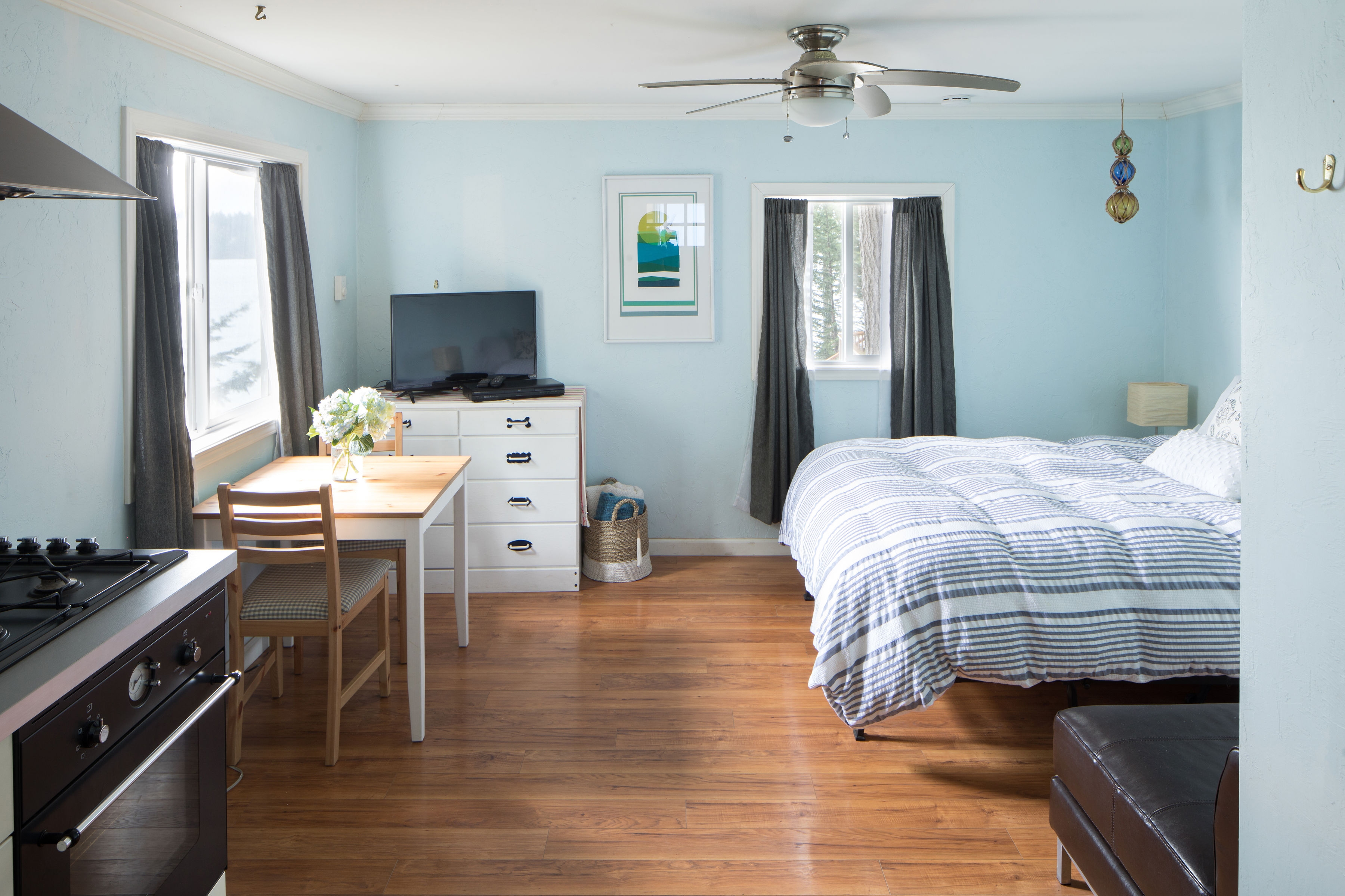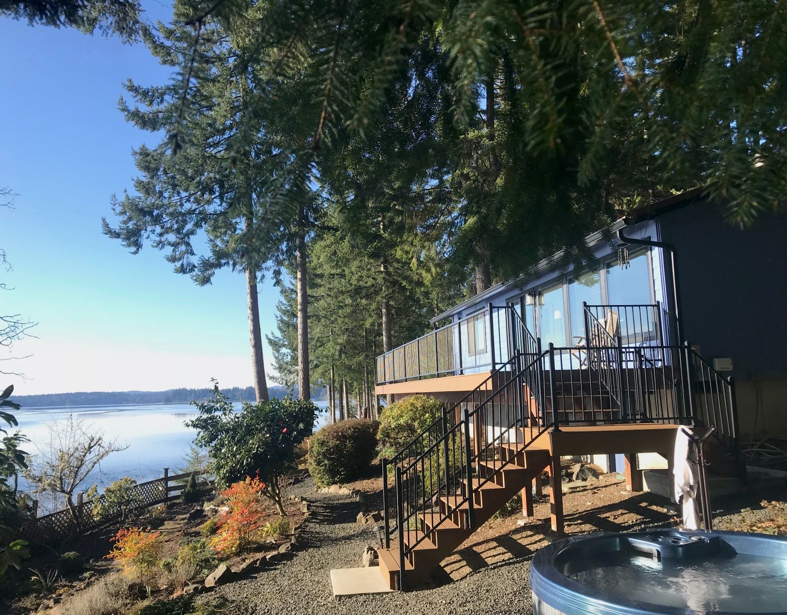 Main house features include luxury sustainable plank flooring, stainless steel kitchen appliances, wood-burning fireplace, hotel-grade beds & linens, lush rugs, bold art, comfortable furnishings, and lots of cozy blankets & pillows, all within sight of Mount Rainier. The large attached deck has space for lounging and outdoor eating. Down a few steps to the garden you’ll find a hot tub shaded by old-growth Douglas Fir trees. Wander through the garden of native plants, or head to the beach to kayak, spot seals swimming, or wade in the bay. The studio cottage is a sweet space for 2, with a full kitchen, tiled shower, sleeping and living area, and an adjacent patio with bay views.