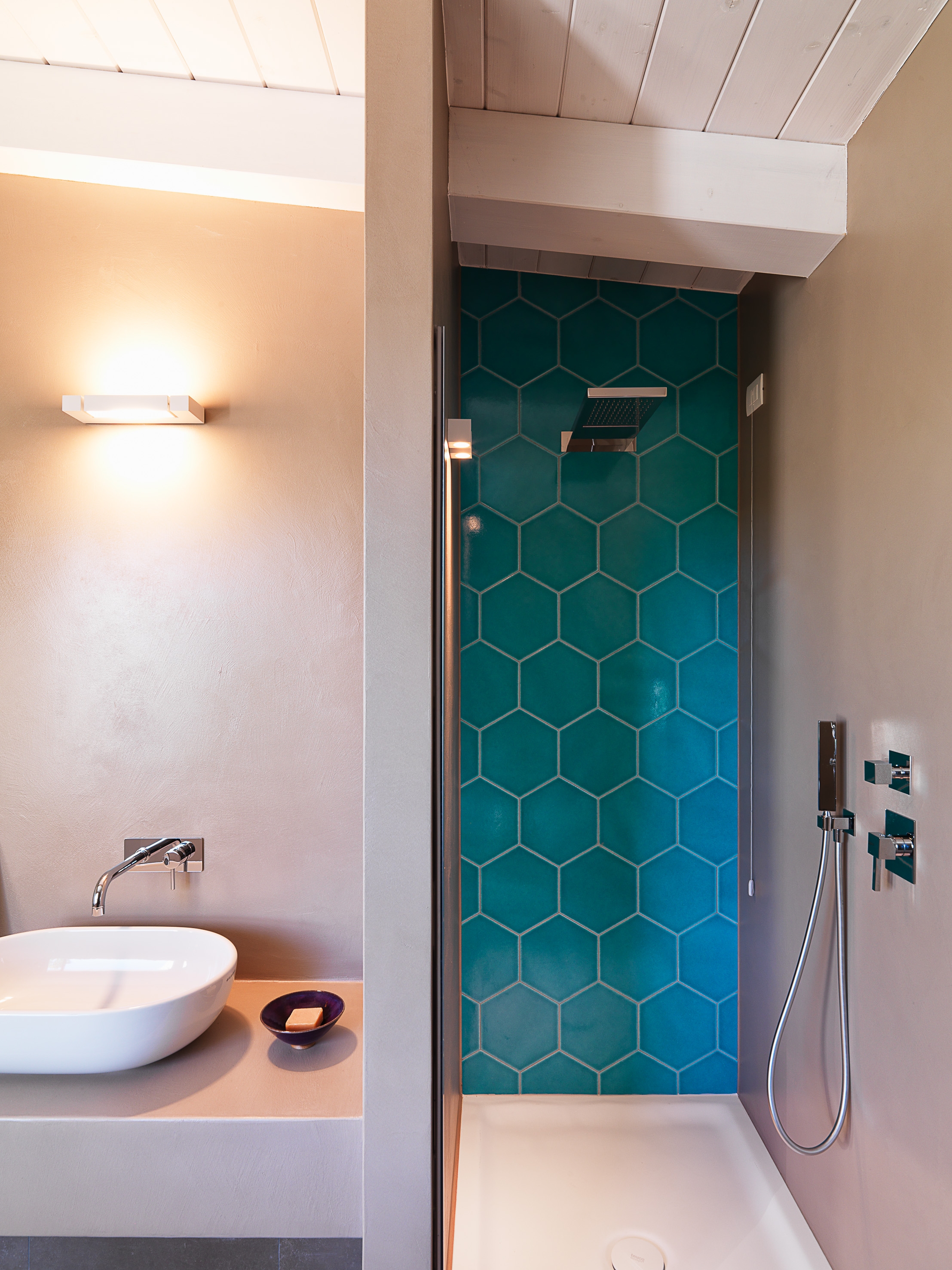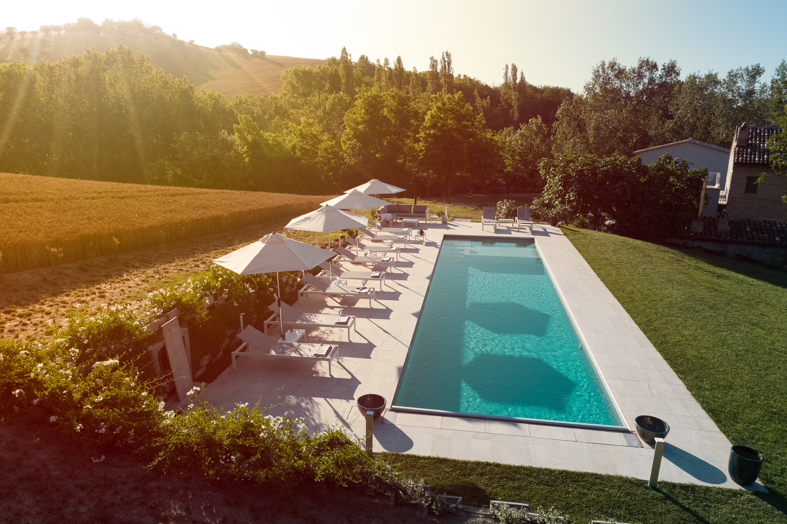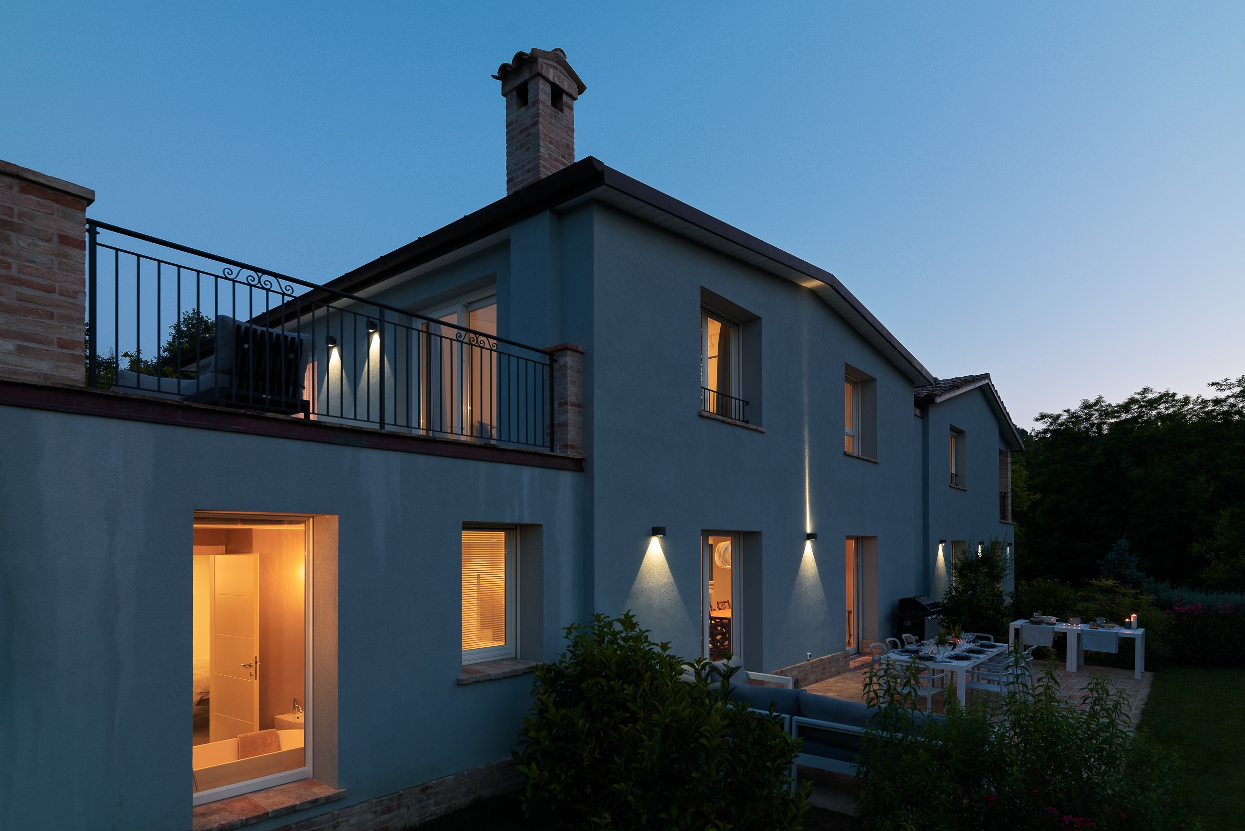 Villa Rivo sits among rolling farmed hills close to the hilltop medieval village of Montottone in the central Italian region of Le Marche. The architects were struck by the seasonal changes of the surrounding farmlands shifting between the lush greens of spring and the golden summer that they chose to create large windows in the bedrooms and bathrooms to frame the views and create strong connections between the indoors and outdoors. Subject to strict seismic and aesthetic planning restrictions the villa occupies the footprint and volume of the old barns and animal sheds that together with the neighboring 1850’s farmhouse (which serves as the owners private family home) were a working farm up until the 1960’s. To contrast the two buildings the decision was taken to clad the house in greyish/blue tinted thermal insulation inspired by the original colors still extant on the outdoor pizza oven. Flexibility was a key design consideration to meet the functional needs of creating a space that could hosts groups of up to 10 people for both pure house rental and also yoga / wellness retreats & culinary courses and also to act as a home for the owners' Asian art and antique collection.