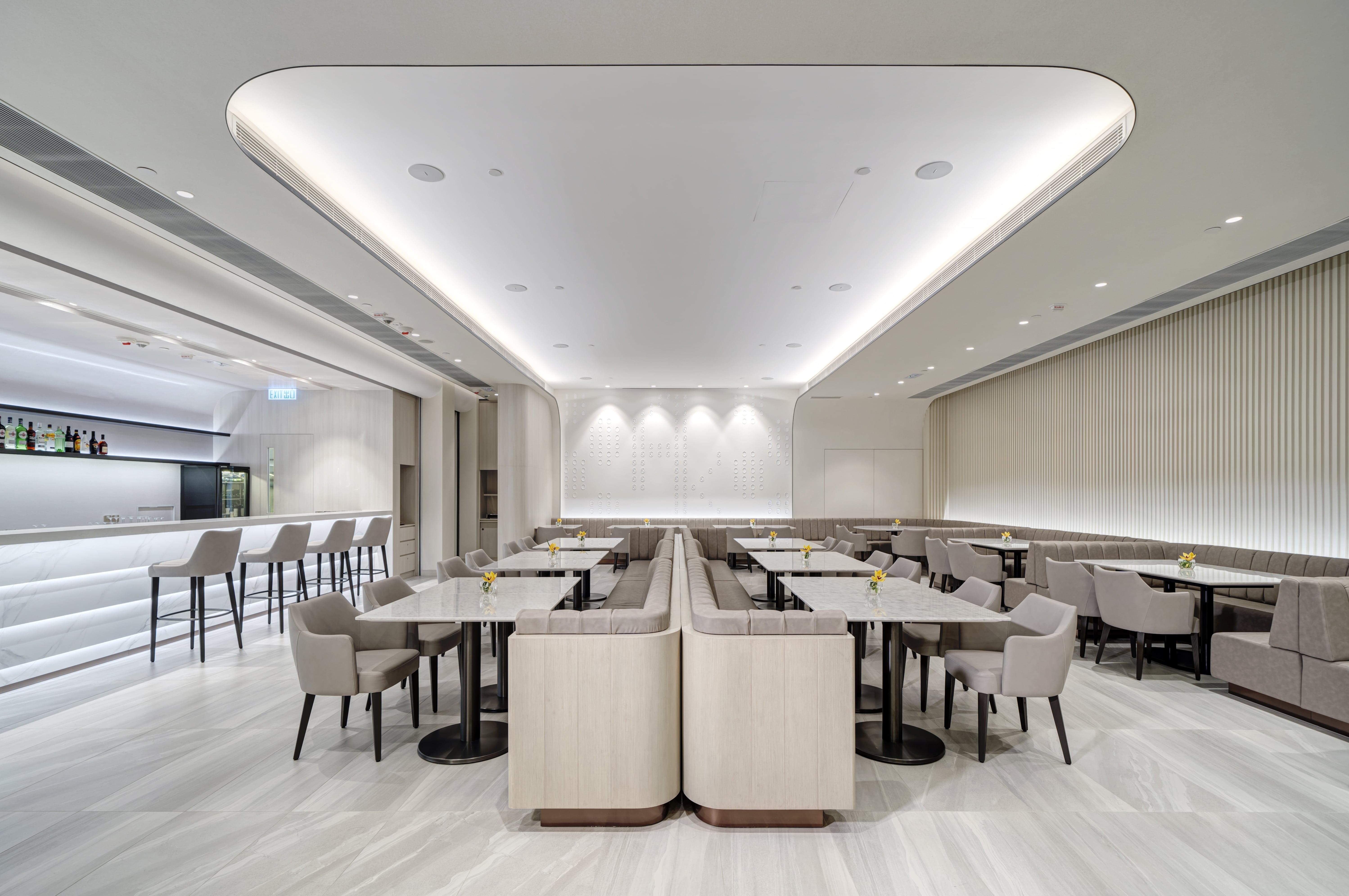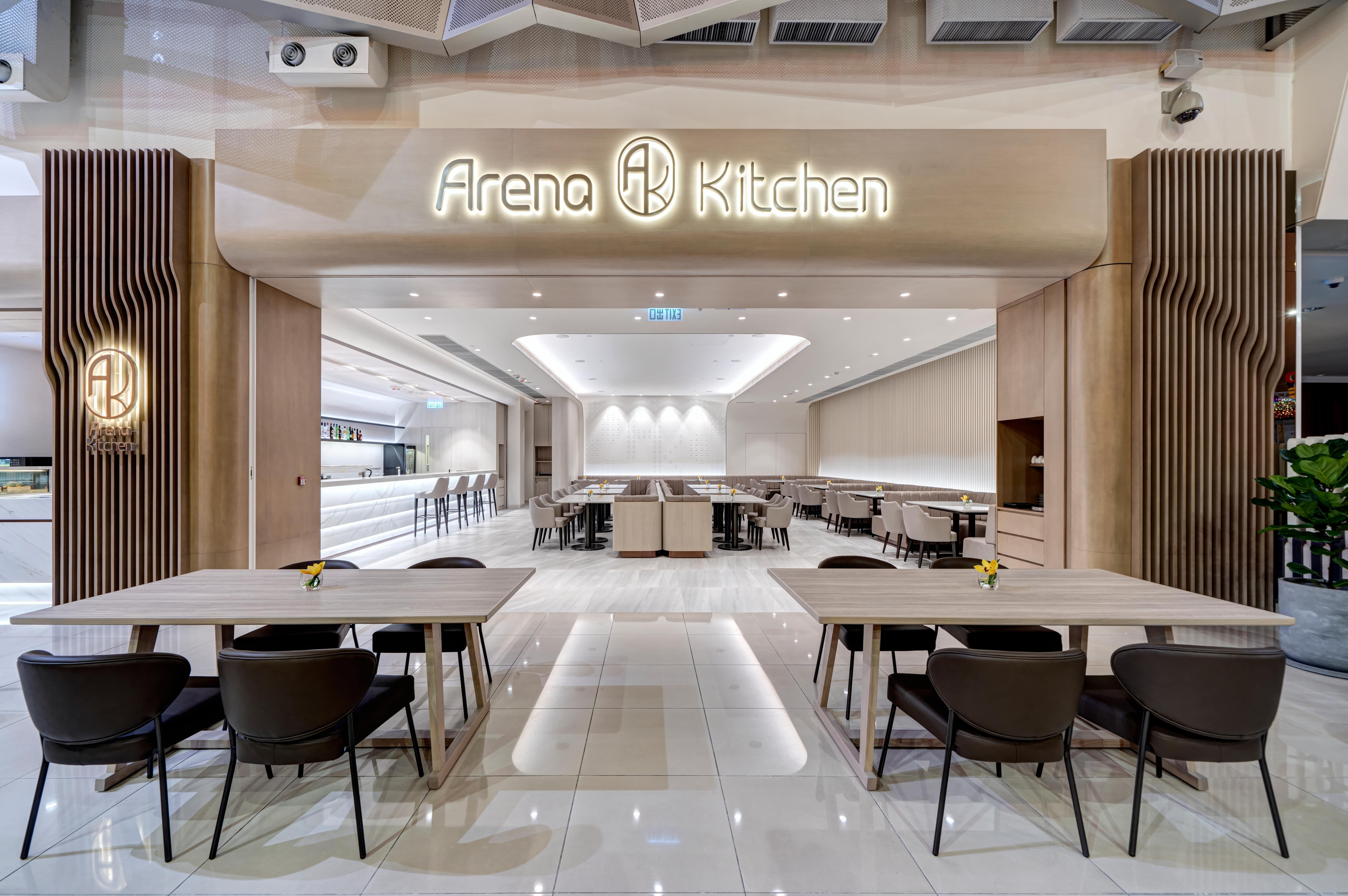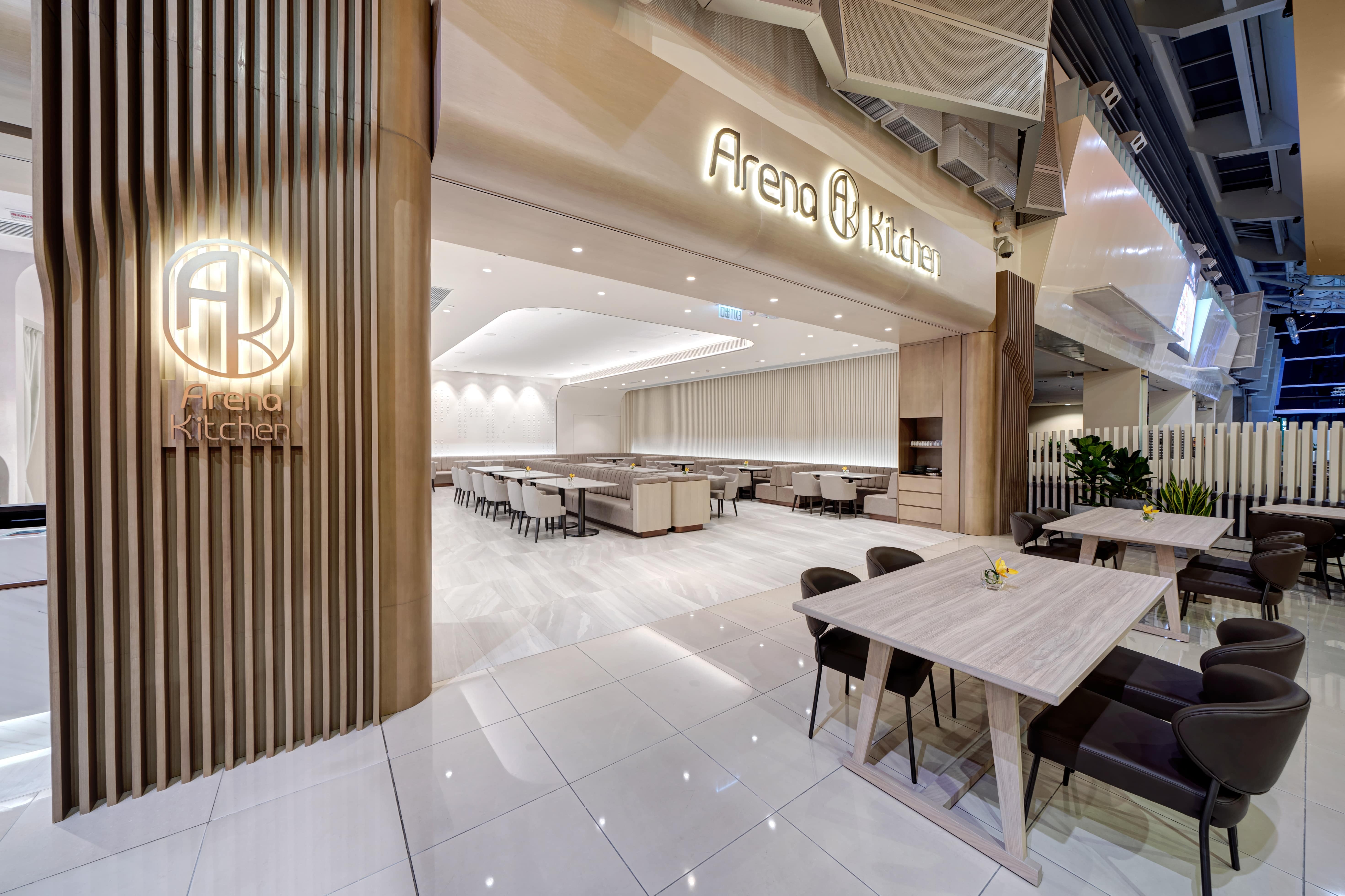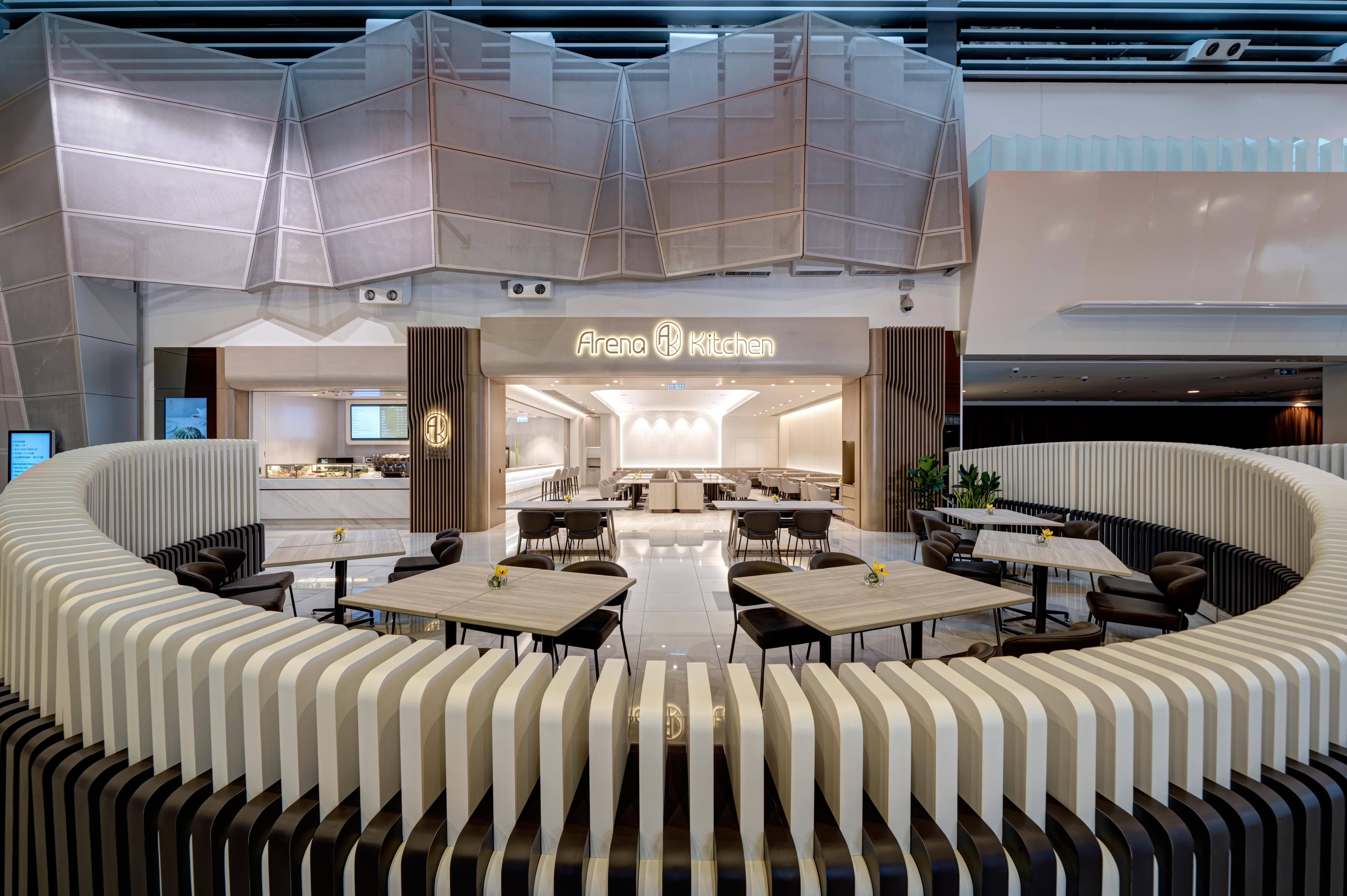 Located in AsiaWorld-Expo, Hong Kong’s go-to venue for gigs and expos, Arena Kitchen is the meeting place for work and leisure. NOVUS was tasked with transforming the dated restaurant into a multipurpose dining venue bearing a visual twist. Inspired by the surrounding sea view, organic waves and curves have been applied throughout the design in a neutral palette to capitalise its versatility. The restaurant is divided into two areas: an intimate dining/bar area and an outdoor cafe space with a takeaway counter. The dining area is lit up by LED lights that change throughout the day to mimic natural light, highlighting its multi-level ceiling that flows naturally into a projection wall that doubles as a feature wall. Movable furniture, with touches of wood veneer finishing, leather and marble tabletops, add warmth and promote fluidity between the areas. The bar area features a 3m counter with faux marble finishing for a seamless feel and complements the flowy display shelf. A wave-like partition takes centre stage in the open area, and like the rest of the furniture, is movable and can be rearranged throughout the day to serve different dining and social experiences.