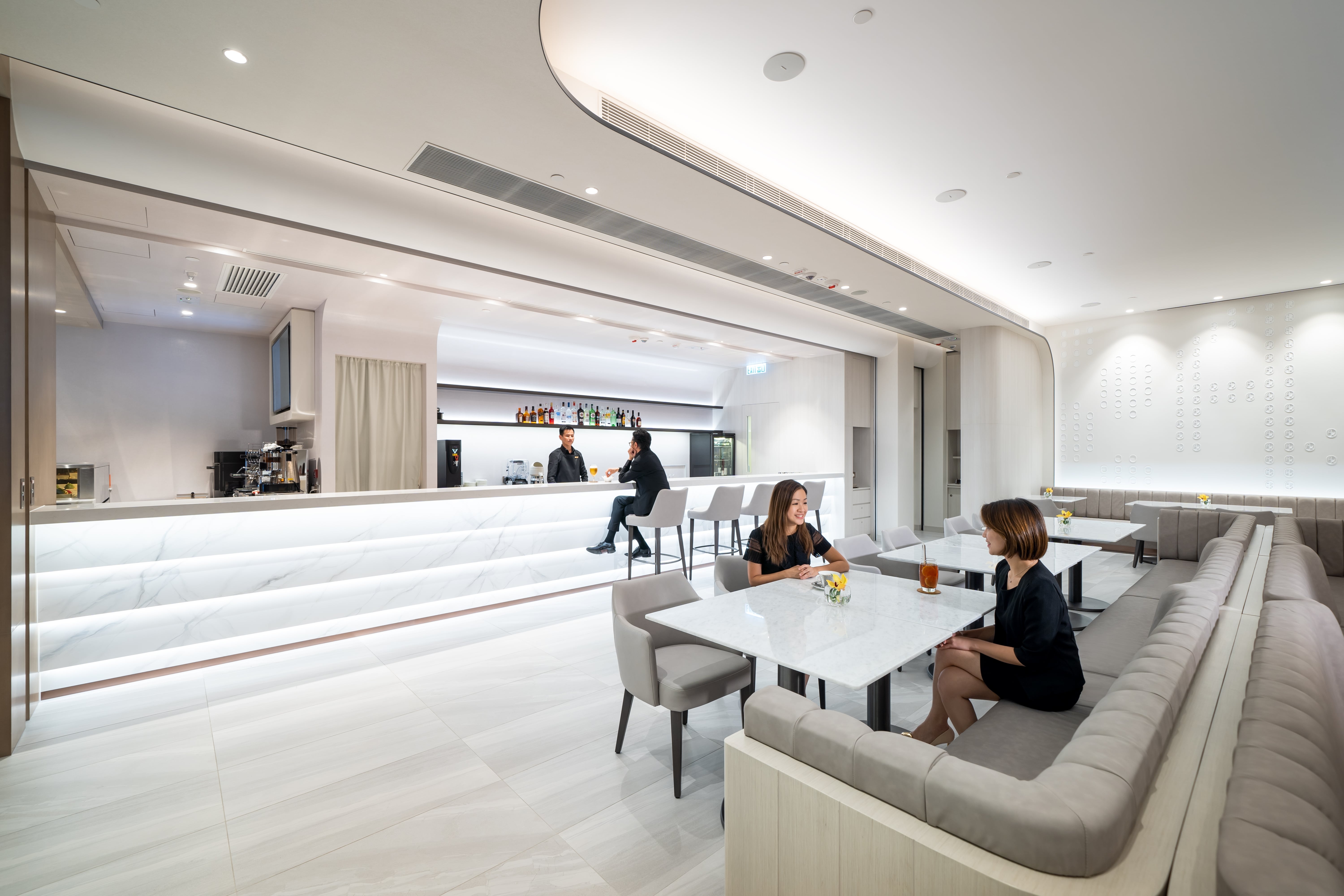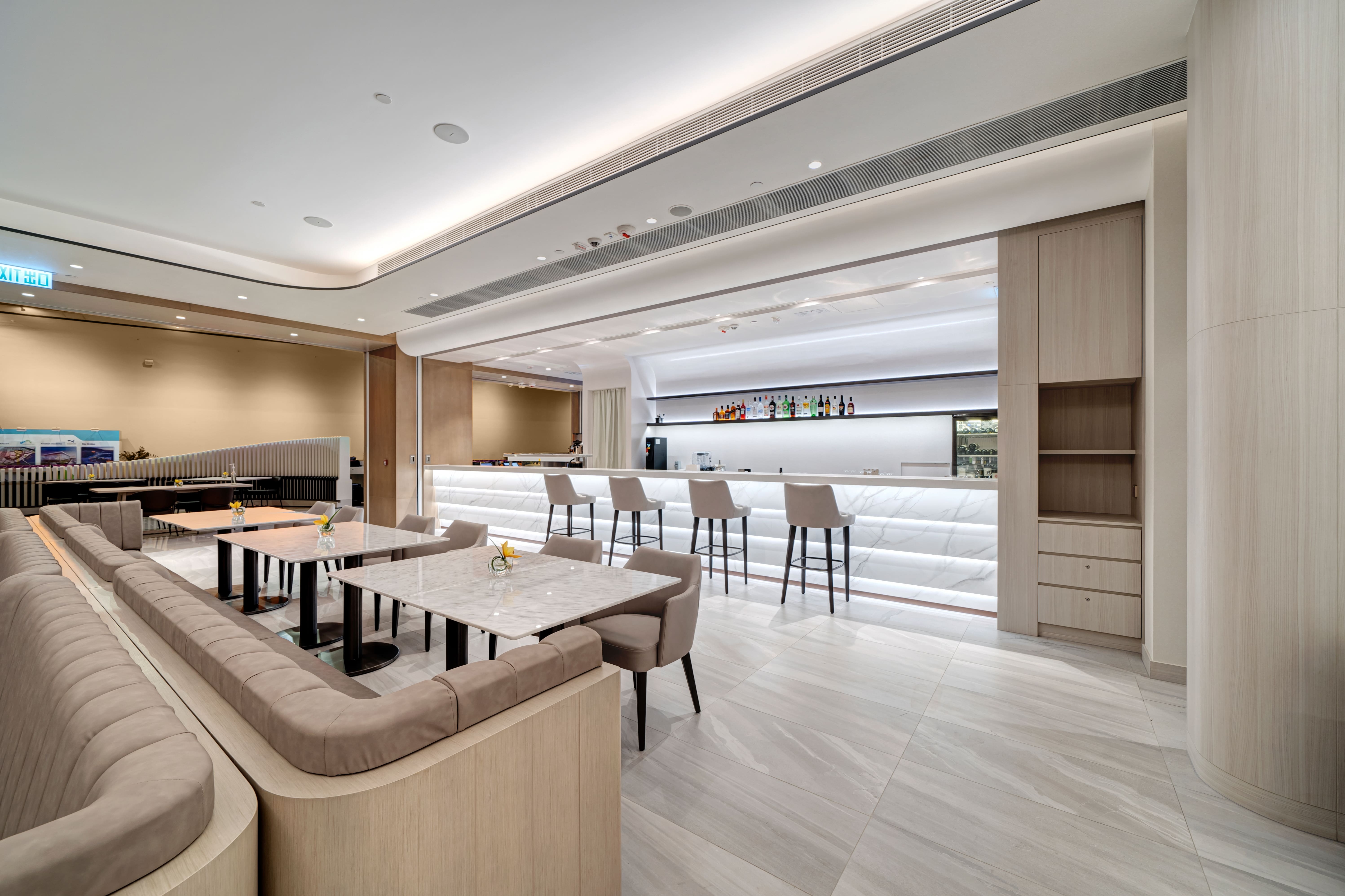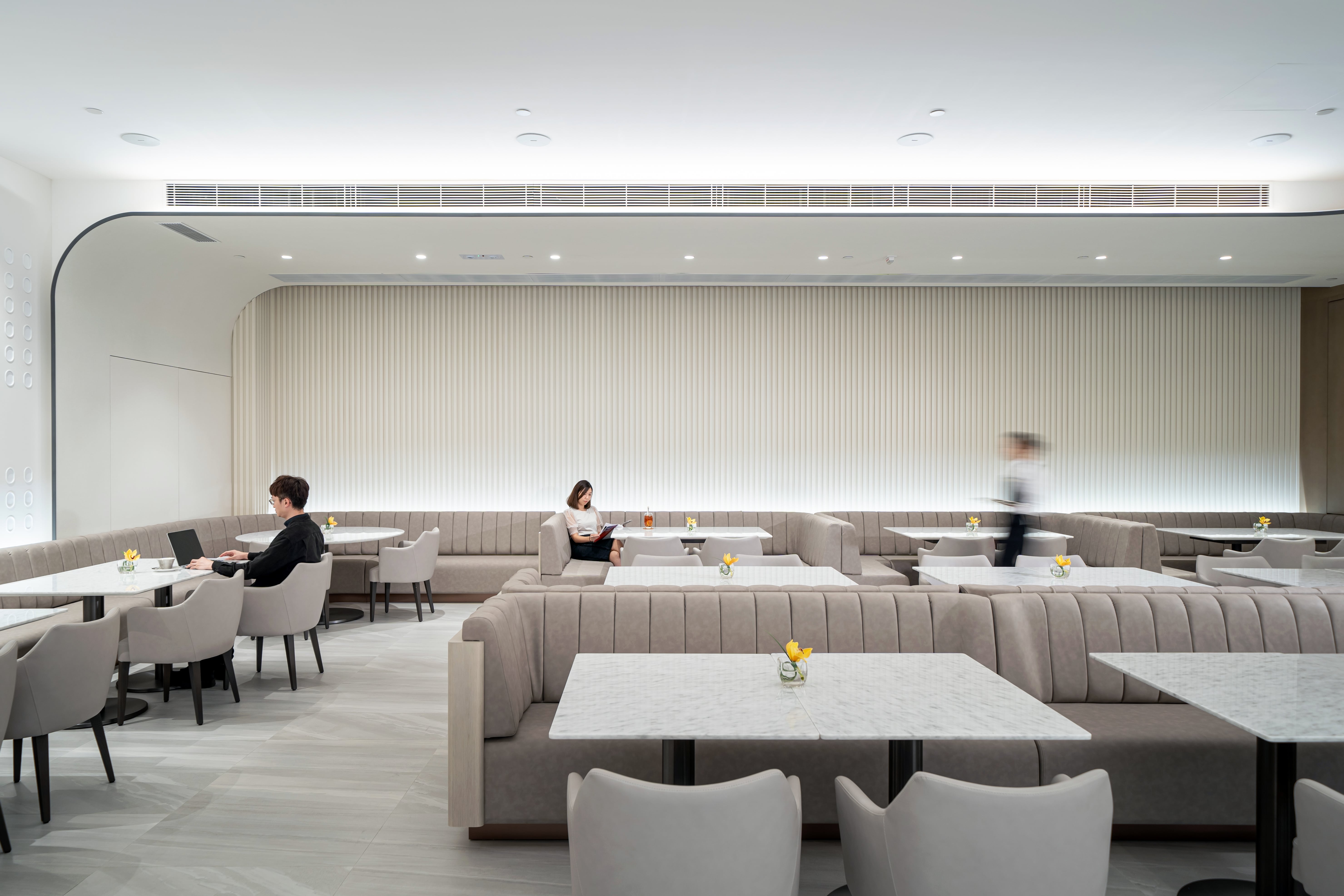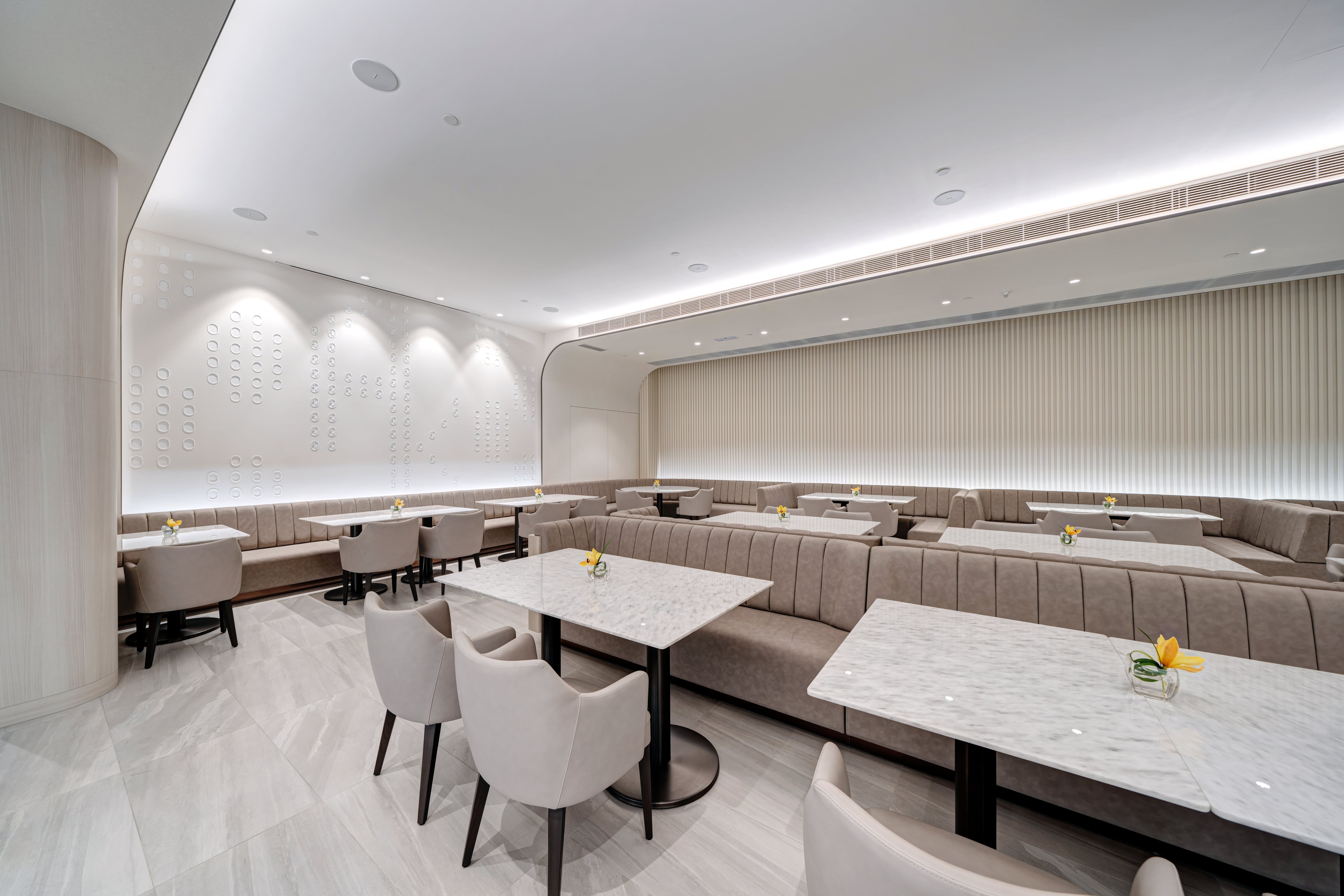 Located in AsiaWorld-Expo, Hong Kong’s go-to venue for gigs and expos, Arena Kitchen is the meeting place for work and leisure. NOVUS was tasked with transforming the dated restaurant into a multipurpose dining venue bearing a visual twist. Inspired by the surrounding sea view, organic waves and curves have been applied throughout the design in a neutral palette to capitalise its versatility. The restaurant is divided into two areas: an intimate dining/bar area and an outdoor cafe space with a takeaway counter. The dining area is lit up by LED lights that change throughout the day to mimic natural light, highlighting its multi-level ceiling that flows naturally into a projection wall that doubles as a feature wall. Movable furniture, with touches of wood veneer finishing, leather and marble tabletops, add warmth and promote fluidity between the areas. The bar area features a 3m counter with faux marble finishing for a seamless feel and complements the flowy display shelf. A wave-like partition takes centre stage in the open area, and like the rest of the furniture, is movable and can be rearranged throughout the day to serve different dining and social experiences.