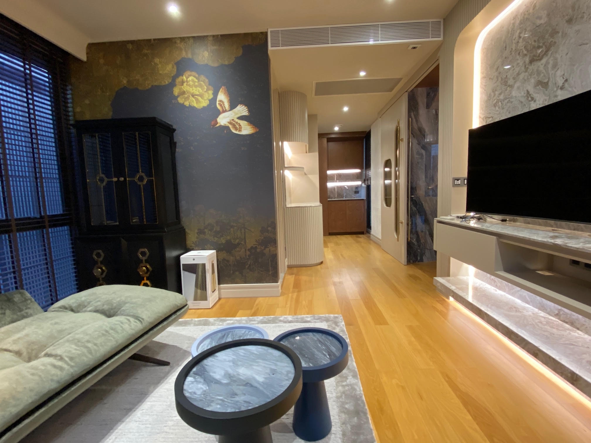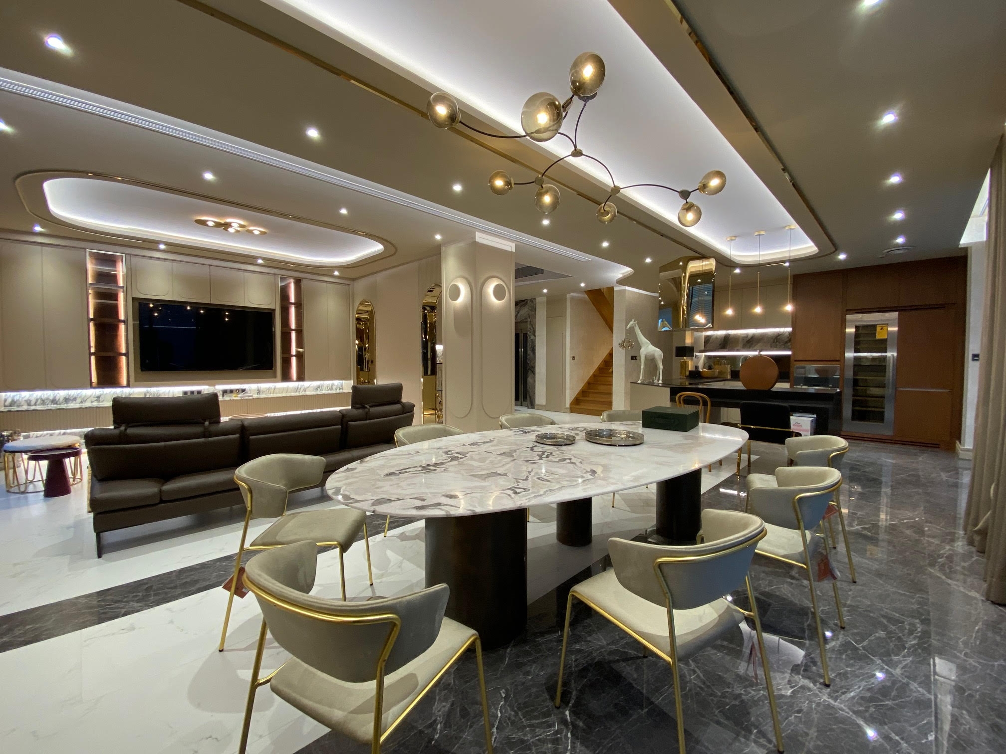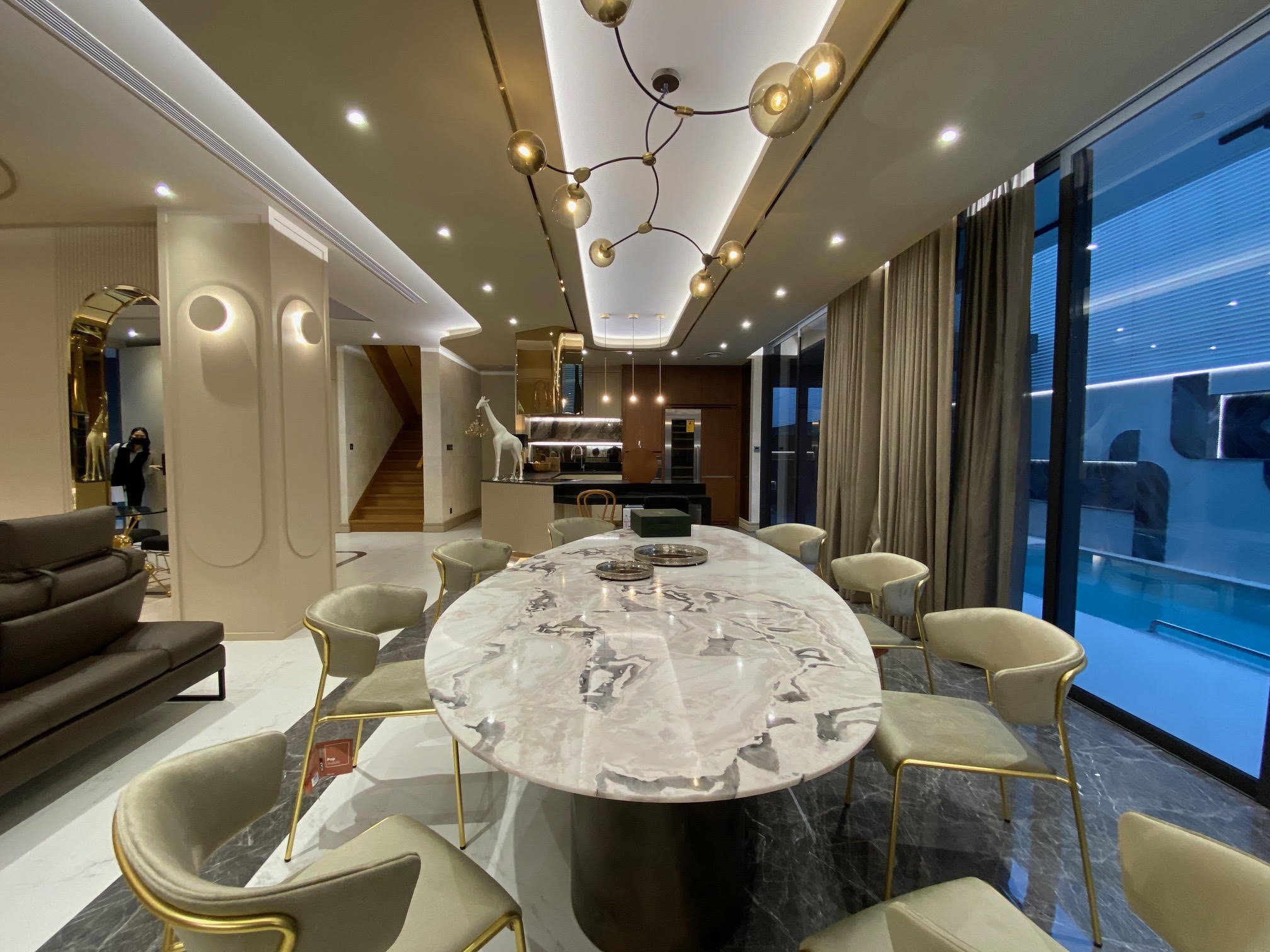 In which the house has a living room, pantry area, kitchen room, guest room, lounge room and 3 bedroom . We talk about the smoothness of the decoration, emphasizing the geometric form, which the customer wants to add more curves inside the space and glossy material , but the designers pefer the texture like craft work, so it fits perfectly with the combination of materials such as matte and glossy tiles, rose gold stainless steel, matte furniture spray paint As well as marble that matches the color of furniture, as well as wall paper with a craft-like texture, the designer calls this event "simply east luxury style".