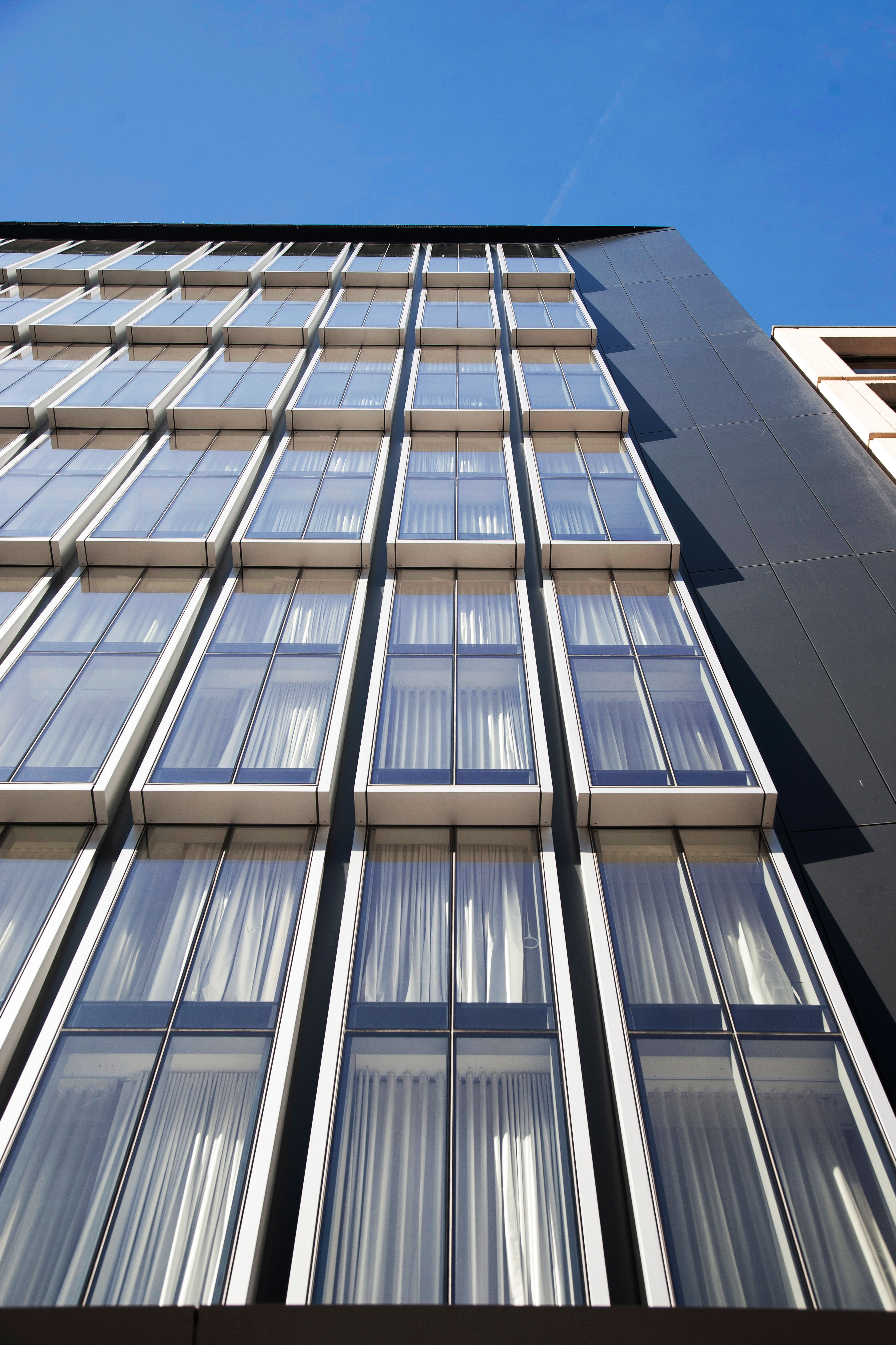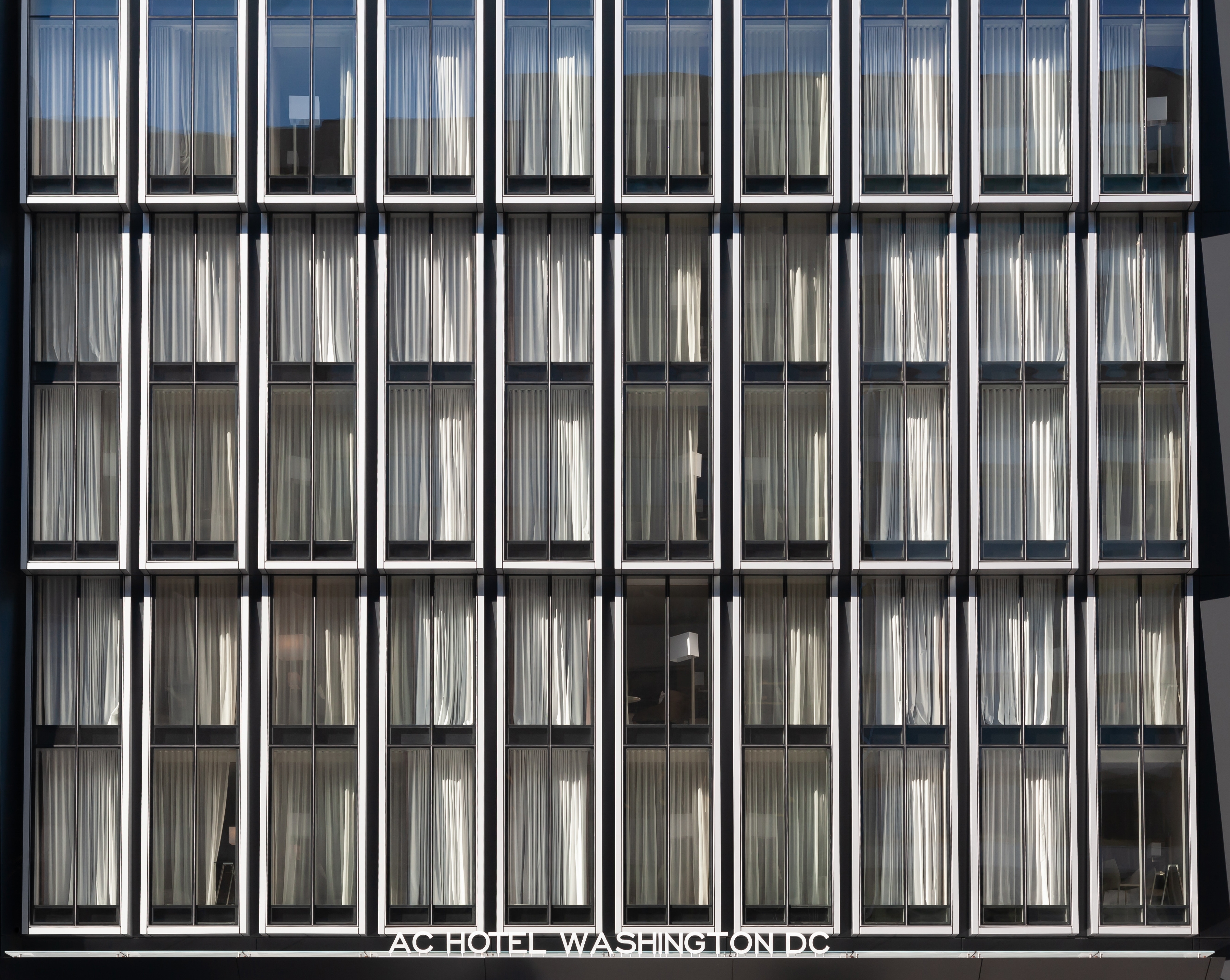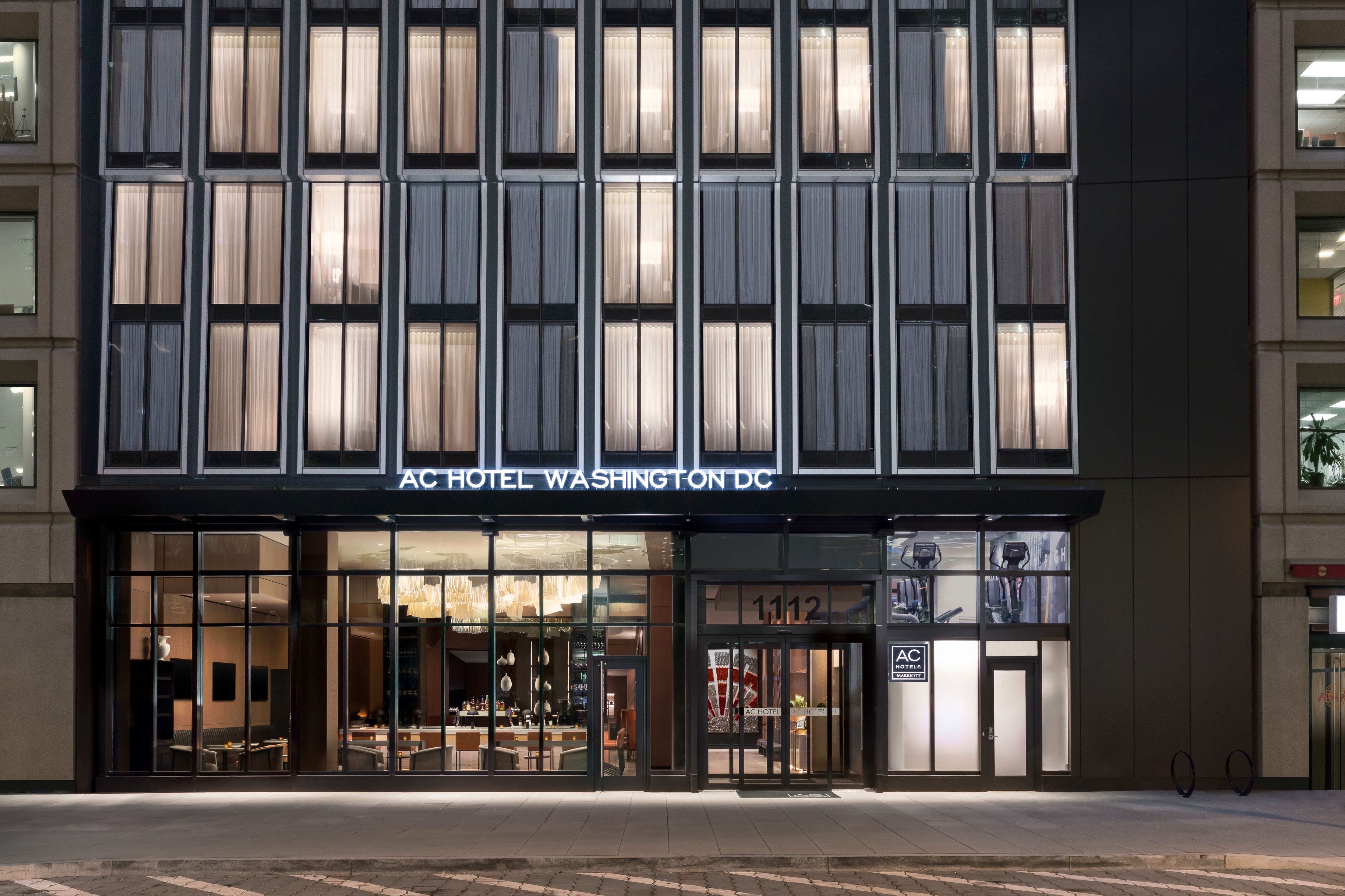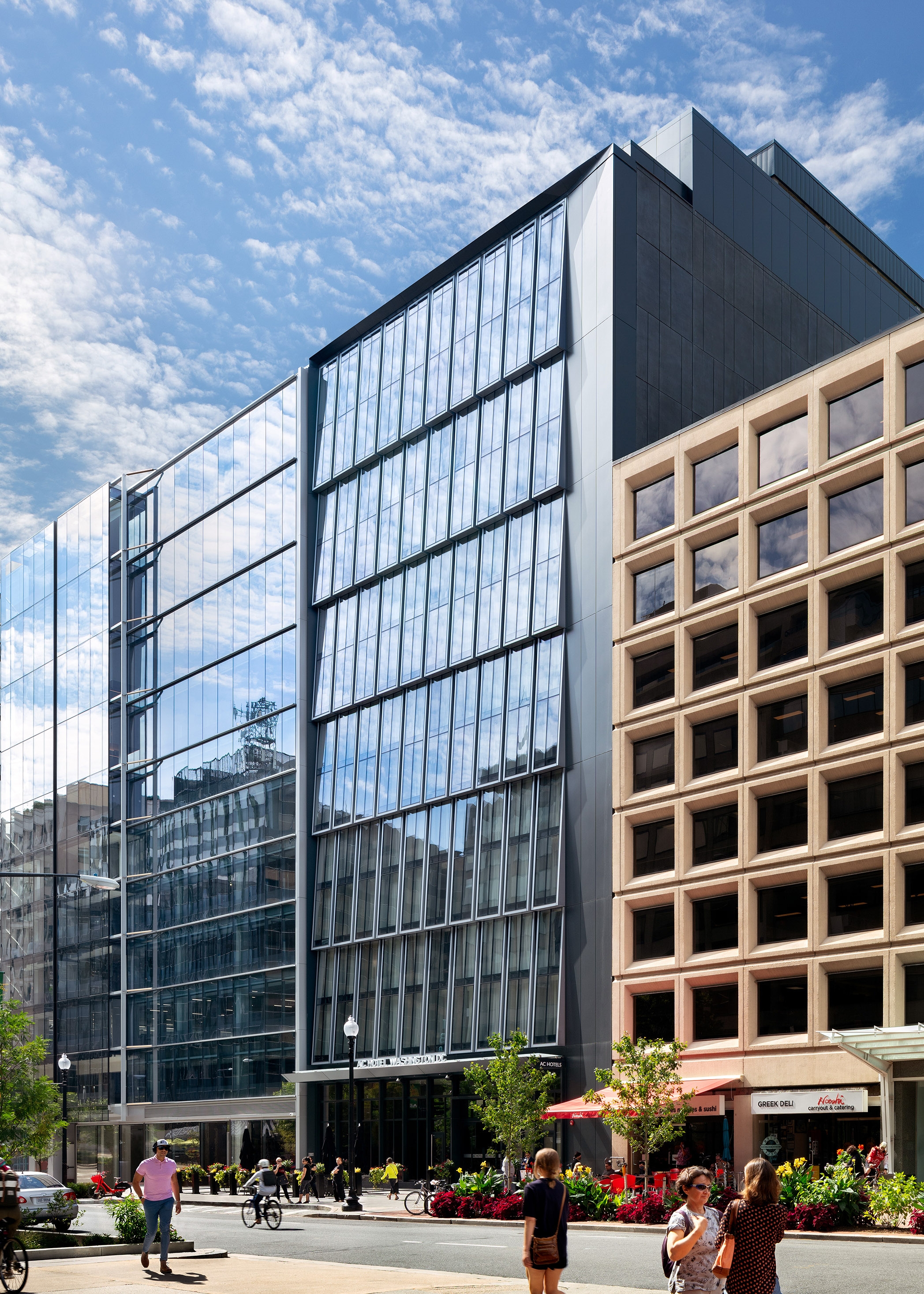 The AC Hotel is a 219 key luxury hotel located in the Golden Triangle Business District near Dupont Circle with 106,000 square feet of guest rooms and amenities. At fourteen stories high and located on a narrow rectangular site, the project serves as a vibrant addition to the rich history of 19th Street. The building’s main façade features a shingled curtain wall system on a two-story module to create a delicate textural expression for the public right of way while also providing daylighting and spectacular views for the adjacent guest rooms. The building’s overall C-shape and closed court creates an efficient floor plate while completing the mid-block urban wall, a difficult arrangement on such a narrow site. On the ground floor, an open-plan lobby and lounge engages the bustling sidewalk with full height glass storefronts and outdoor seating. The closed court also allows for guest rooms throughout the building to have access to natural views and light in addition to conference programming. The project is tracking for LEED Silver with significant energy savings and stormwater innovations, reducing its carbon footprint substantially while building for resiliency.