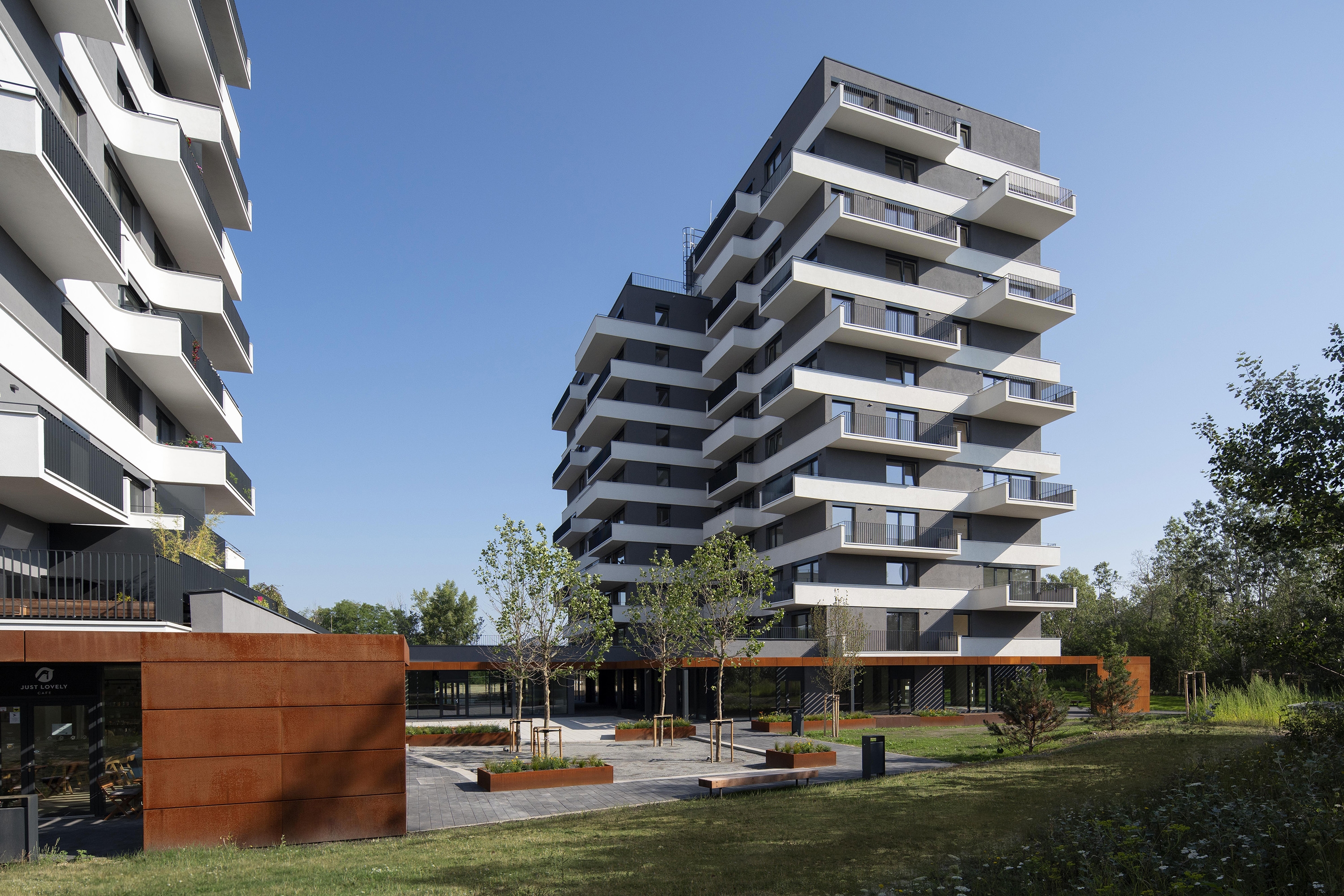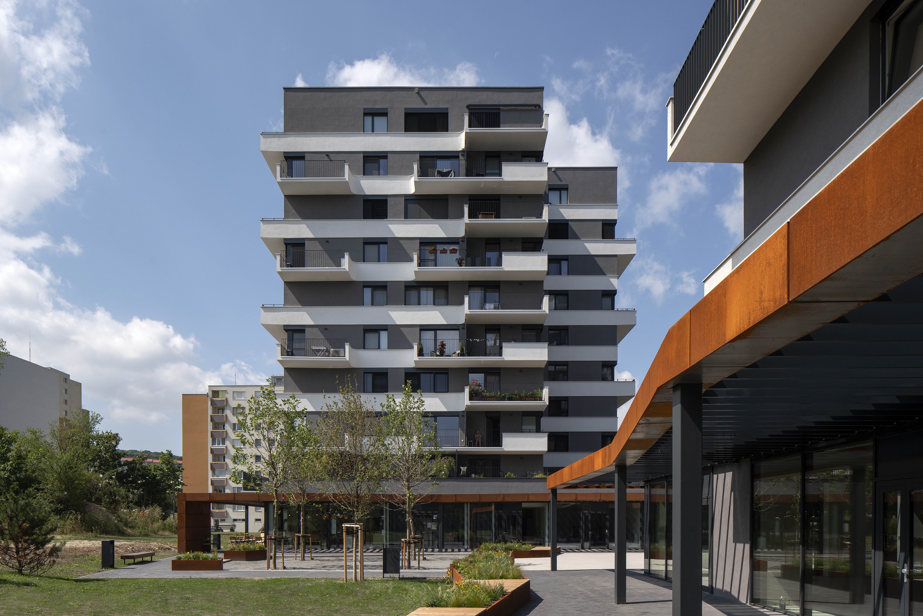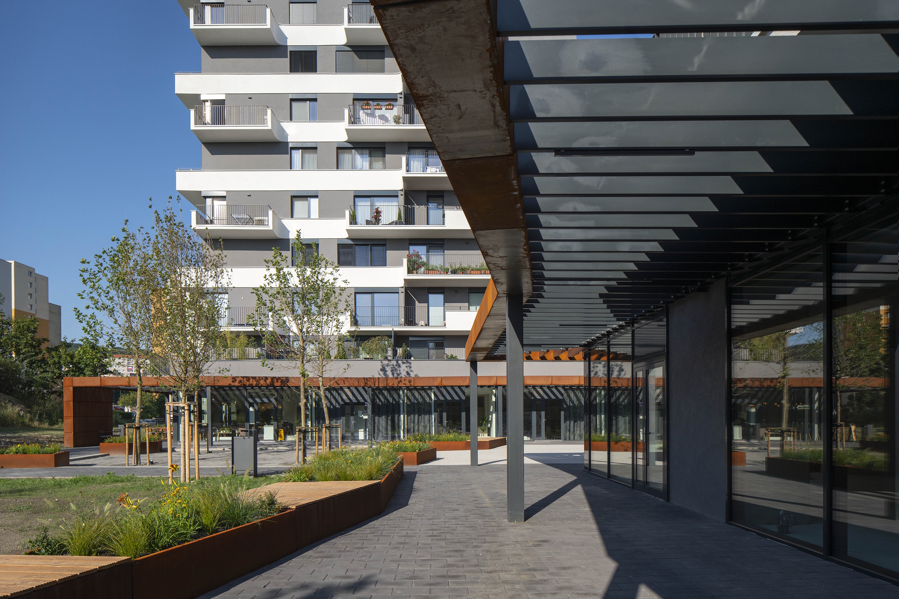 The proposal Pekna vyhliadka offers a concept of two detached apartment buildings which are connected by the public facilities on the ground floor and share the underground parking areas. The distinctive steel pergola with the corten cladding has been designed to architecturally highlight the first floor public space and simultaneously it provides the necessary shading and protects from overheating the shopping facilities. Generous cantilevered balconies on the above floors provide the space for the vertical gardens to create the concept of the vertical terrace houses.
