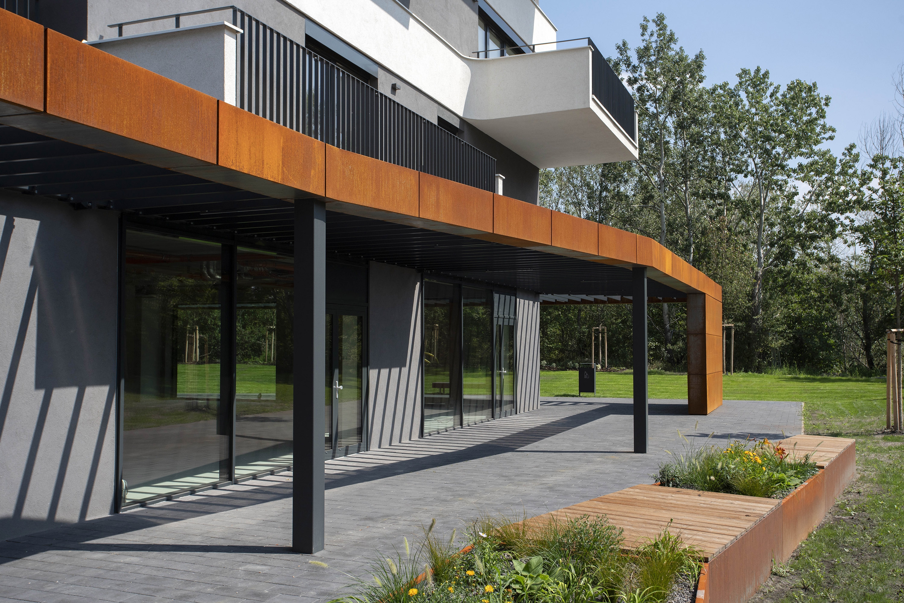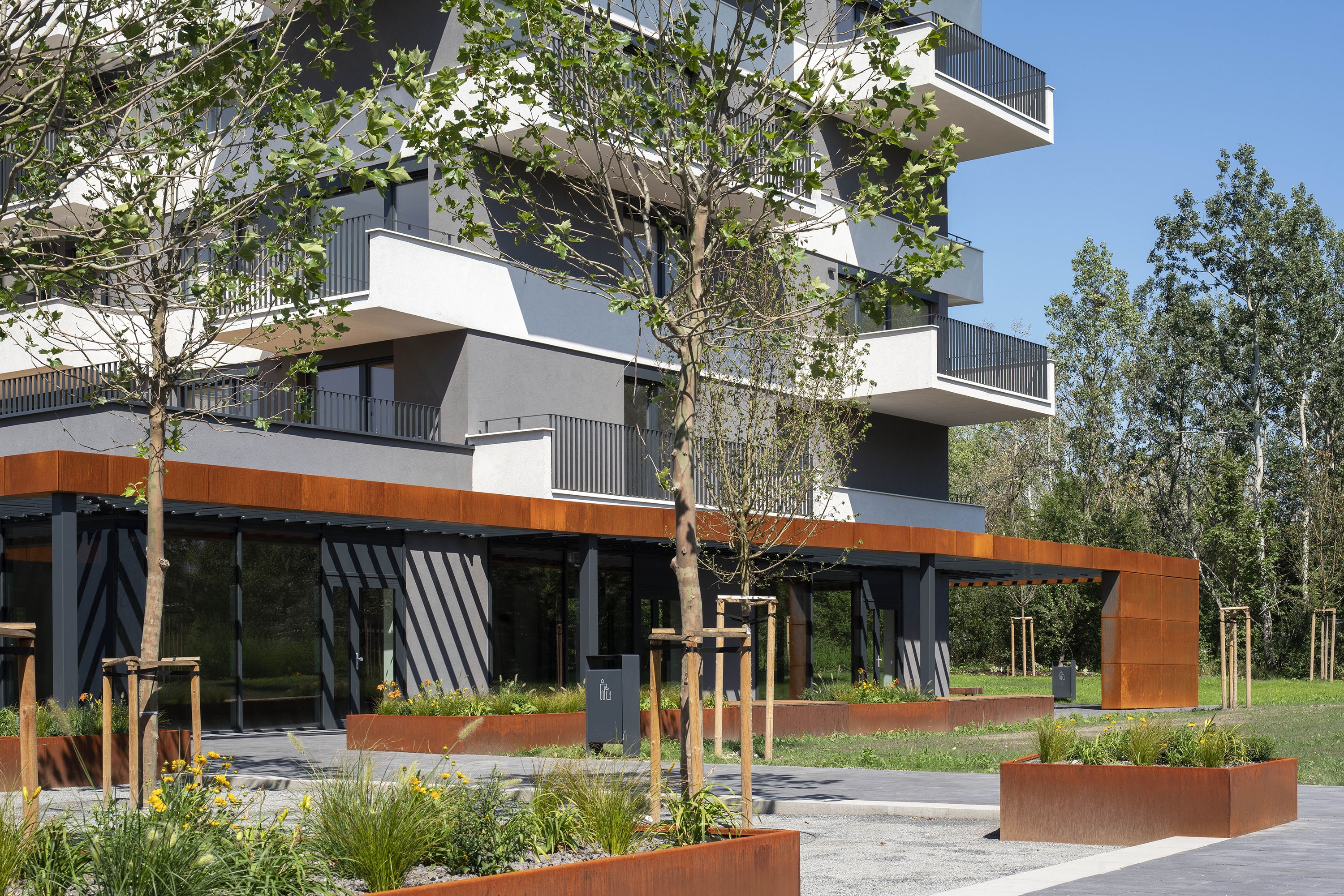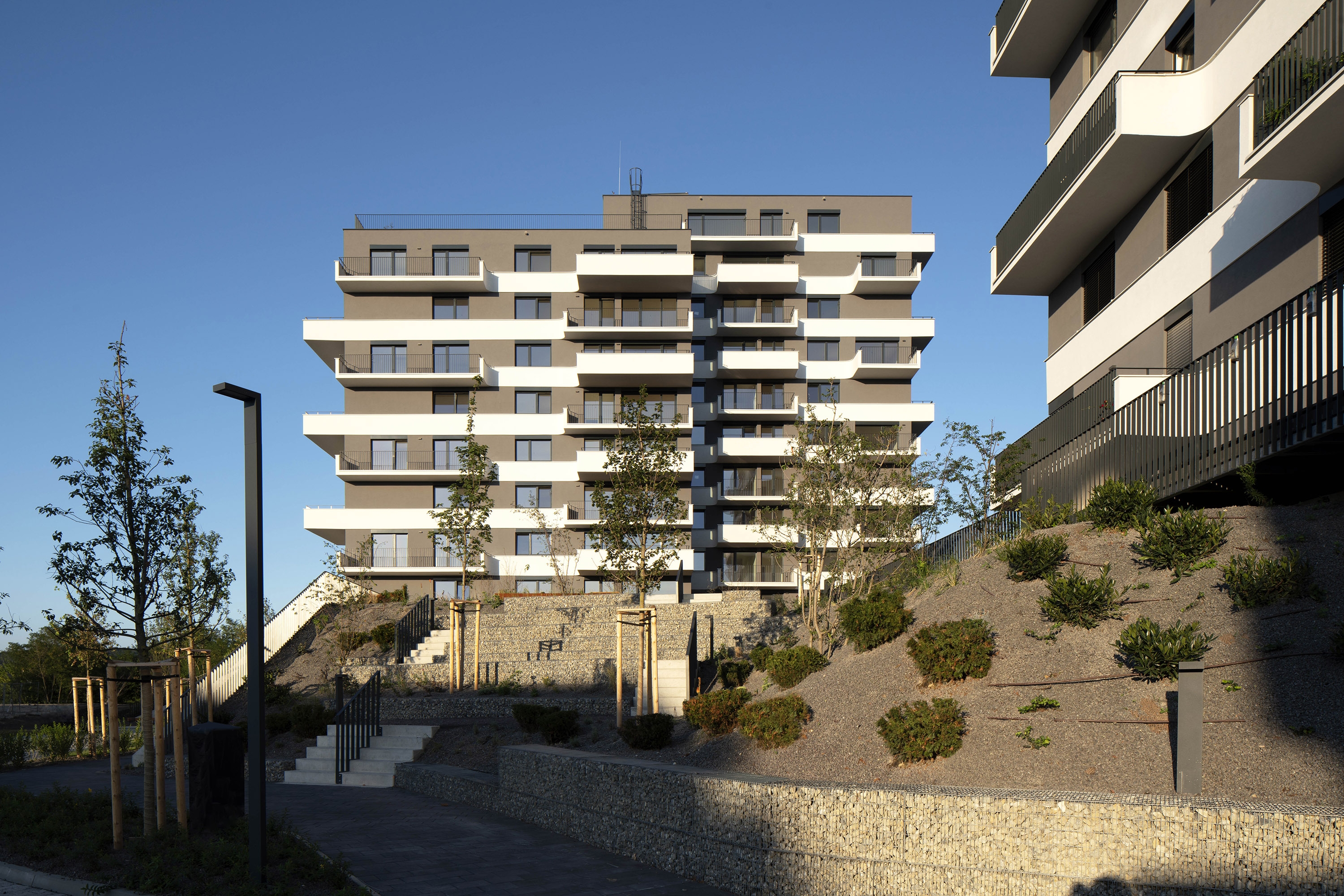 The proposal Pekna vyhliadka offers a concept of two detached apartment buildings which are connected by the public facilities on the ground floor and share the underground parking areas. The distinctive steel pergola with the corten cladding has been designed to architecturally highlight the first floor public space and simultaneously it provides the necessary shading and protects from overheating the shopping facilities. Generous cantilevered balconies on the above floors provide the space for the vertical gardens to create the concept of the vertical terrace houses.