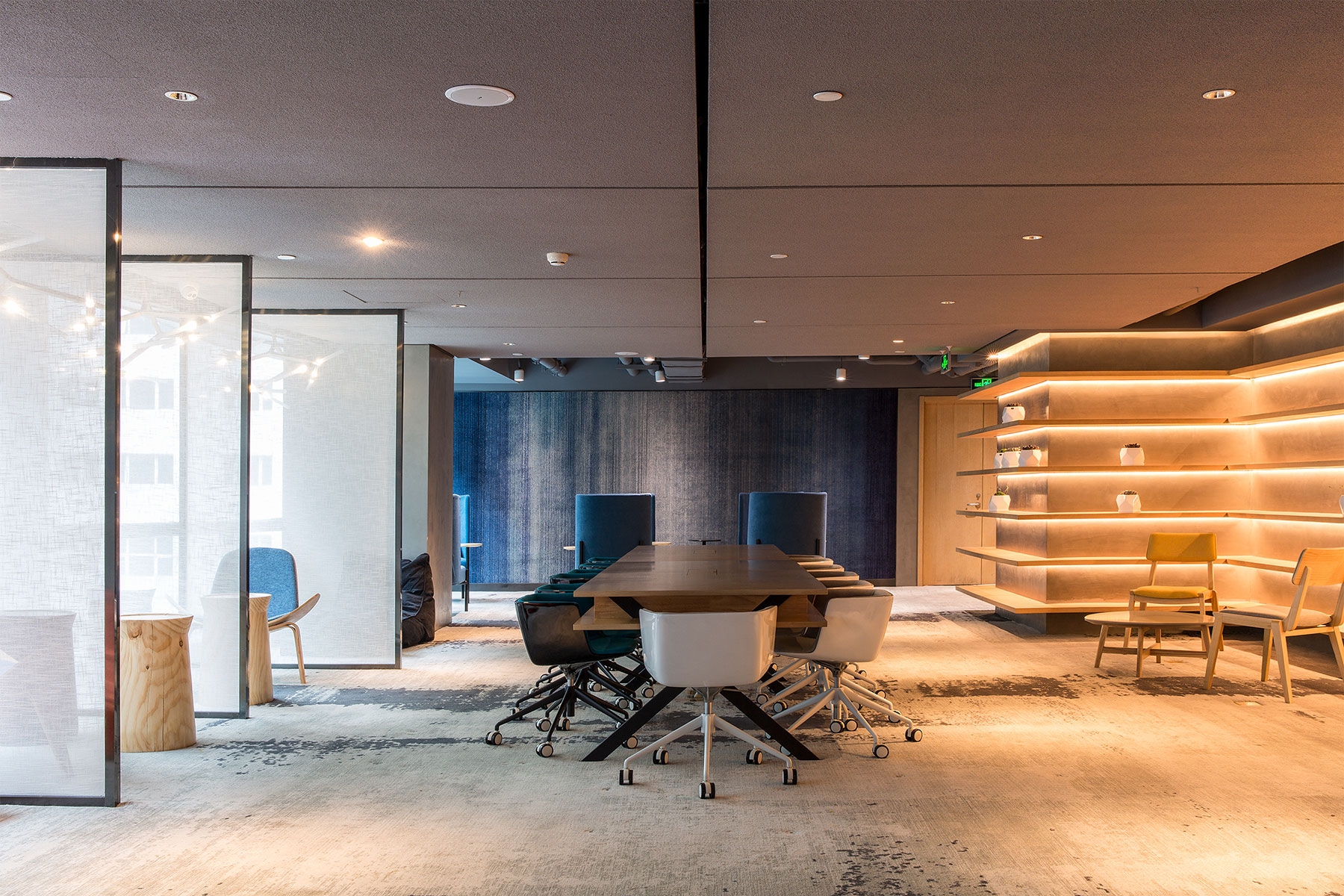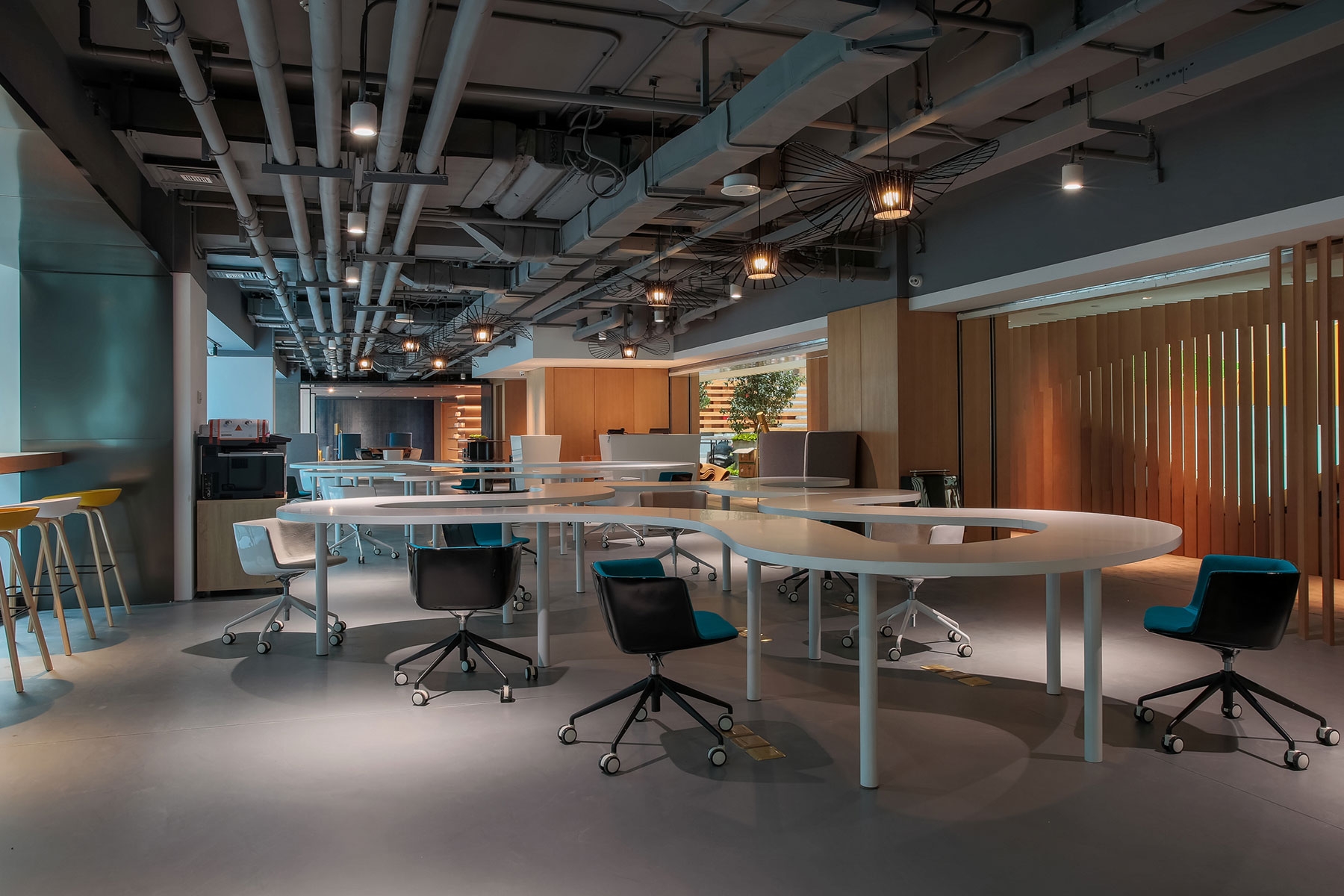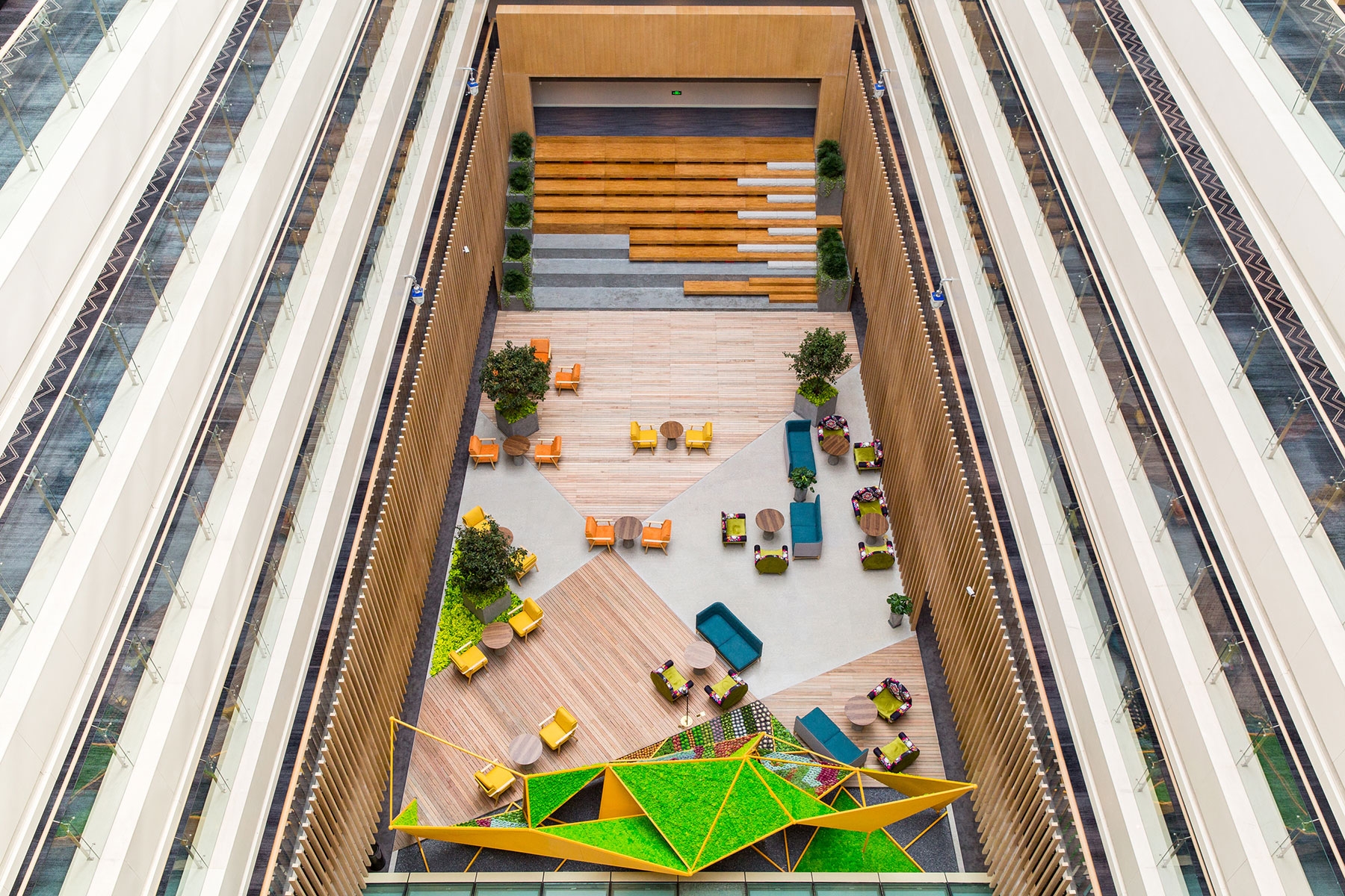 A large staircase is brought into the atrium to connect the first floor to the second floor with the guesthouses and to serve as a grandstand for events. The shared office concept was introduced by the removal of the original dining bar; it has been added with a library, meeting rooms, and movable office seats to meet the rest and light business needs of the guests.