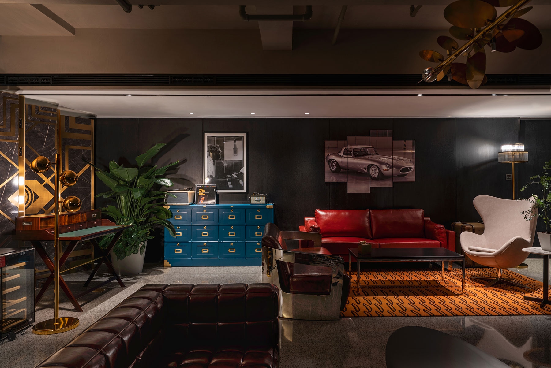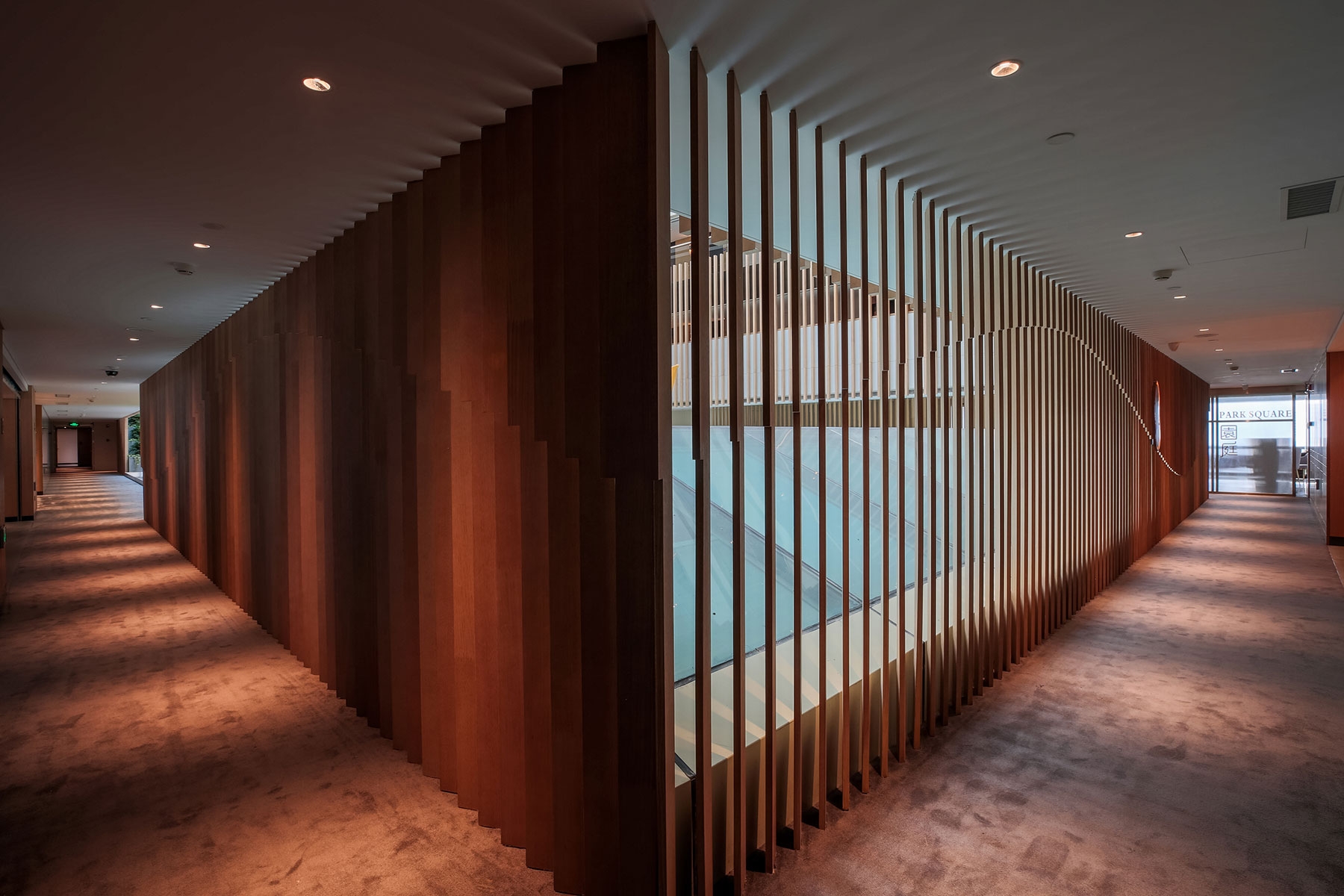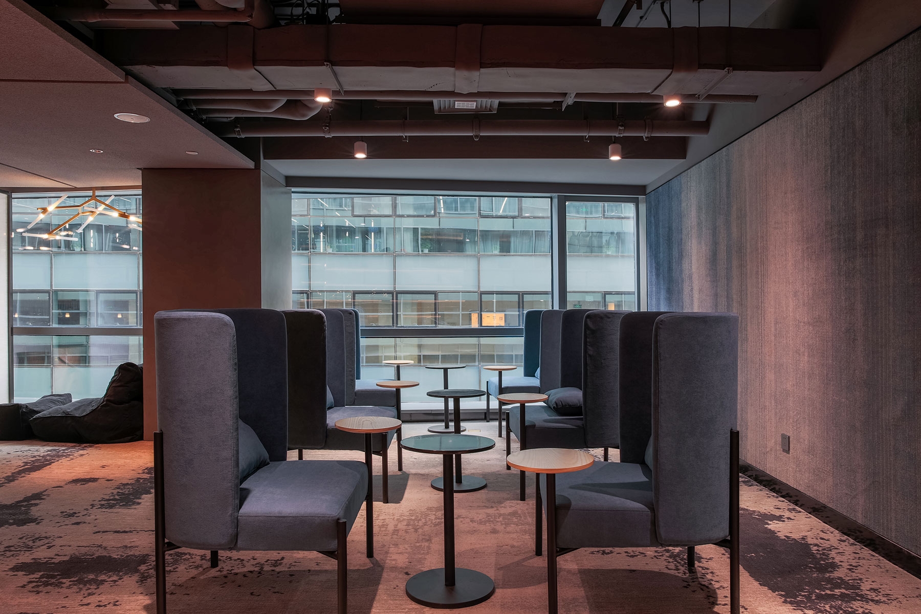 A large staircase is brought into the atrium to connect the first floor to the second floor with the guesthouses and to serve as a grandstand for events. The shared office concept was introduced by the removal of the original dining bar; it has been added with a library, meeting rooms, and movable office seats to meet the rest and light business needs of the guests.