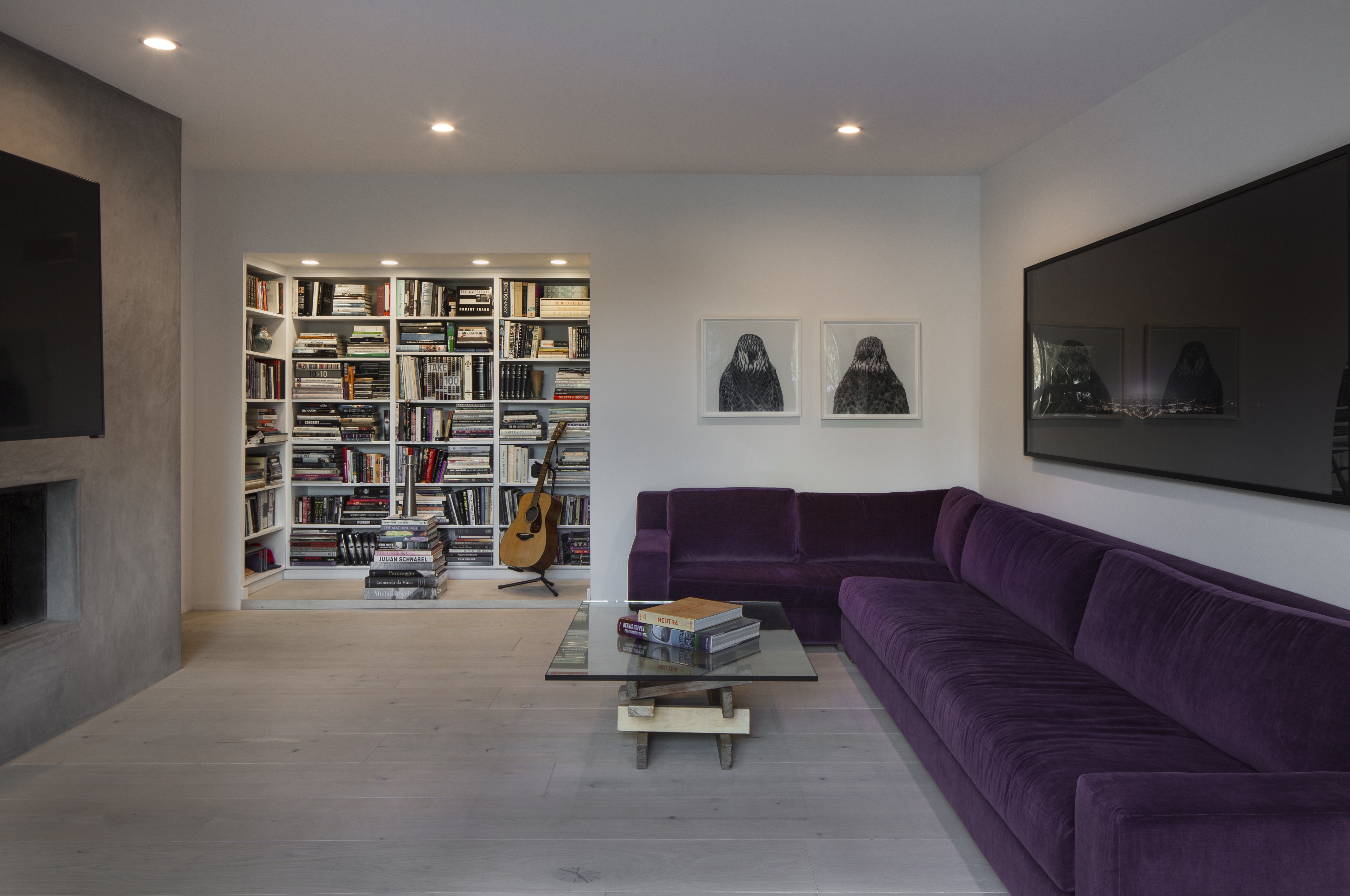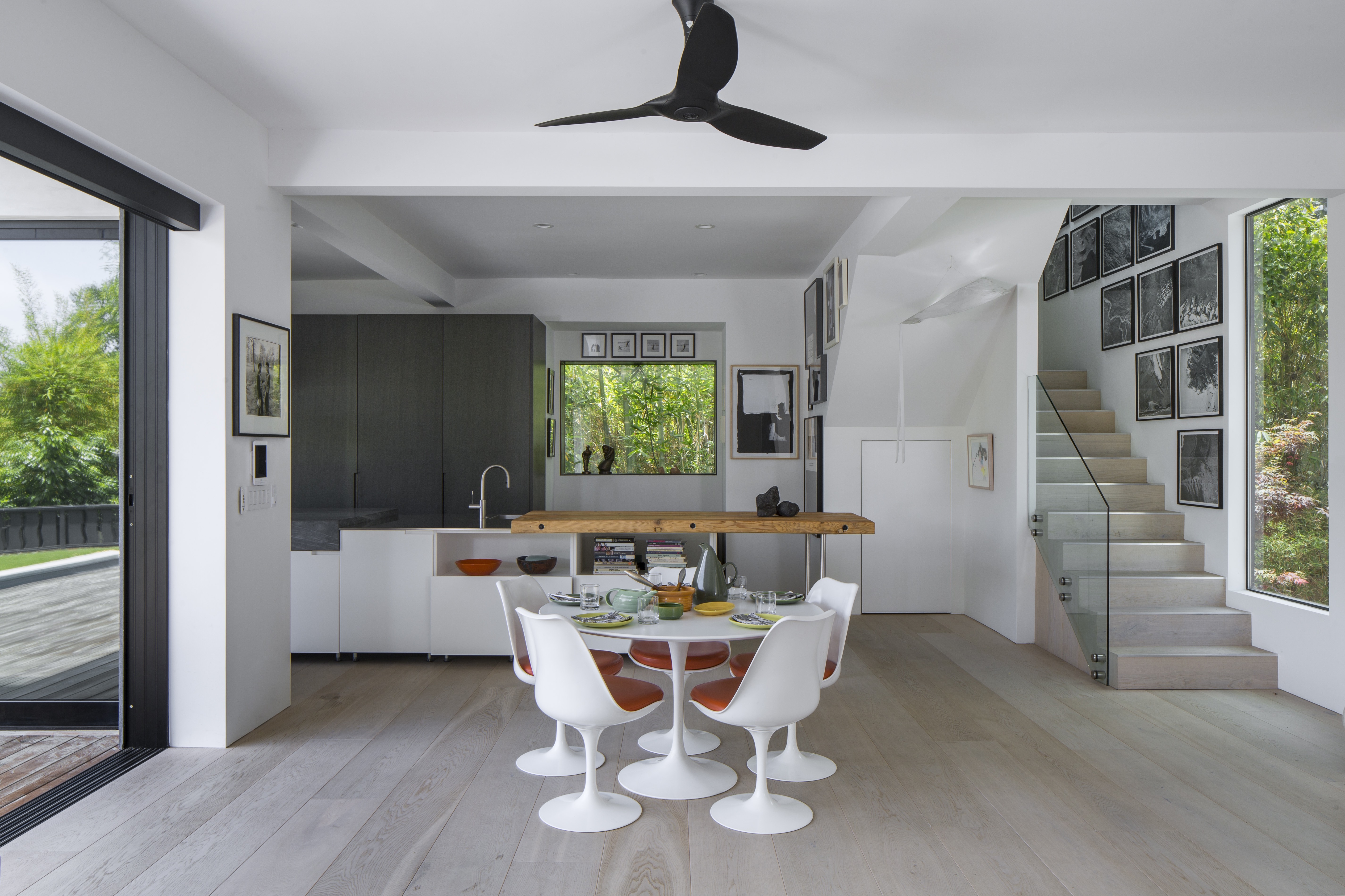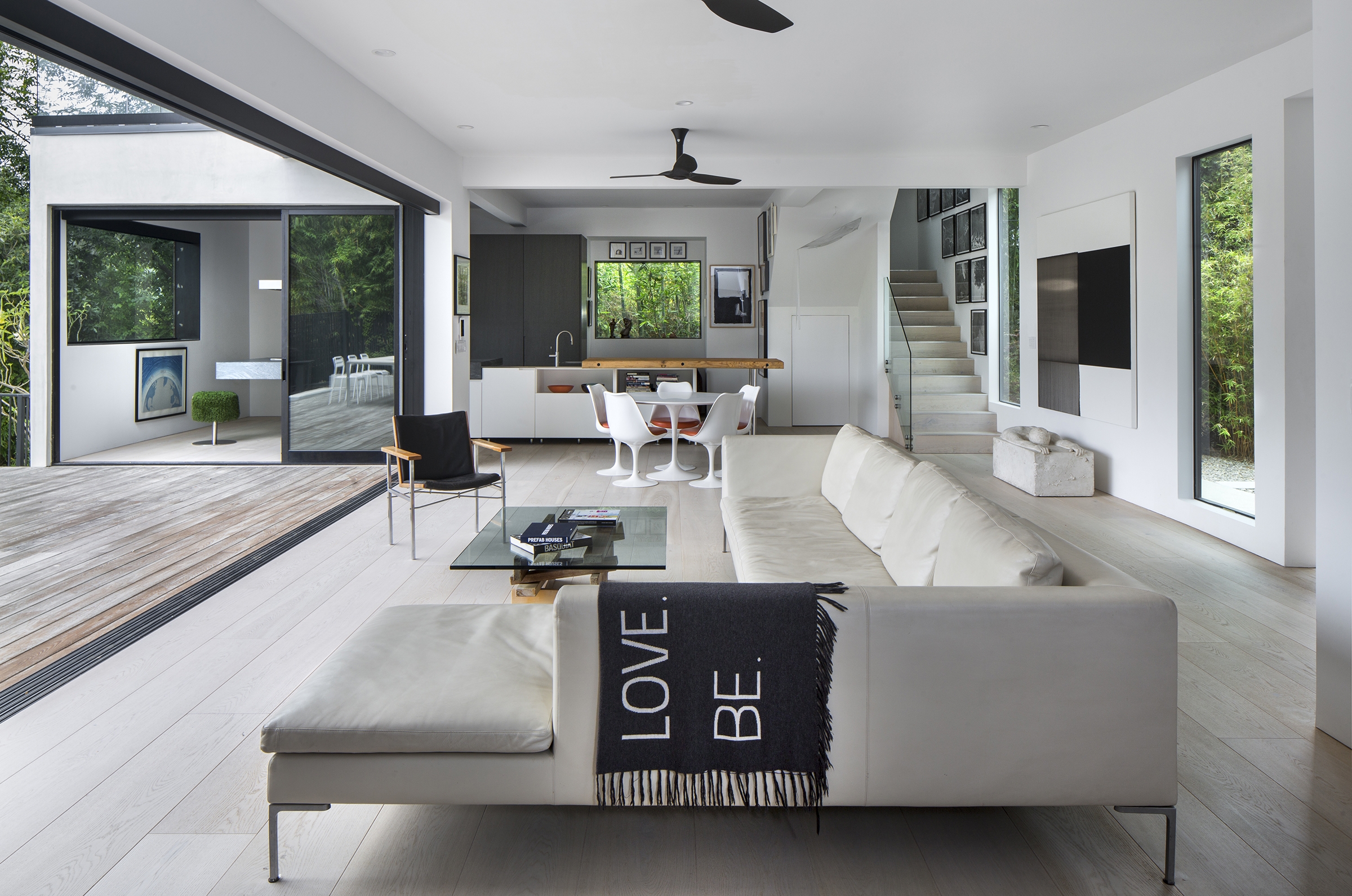 The living room includes a spacious island connecting the kitchen and dining area to enhance the flow of the space. The first level offers a home office with a powder room featuring black marble walls imitating the flow of Icelandic lava and a recycled rubber sink, made of recycled rubber tires. Design elements are oriented to take optimum advantage of natural light and cross ventilation.