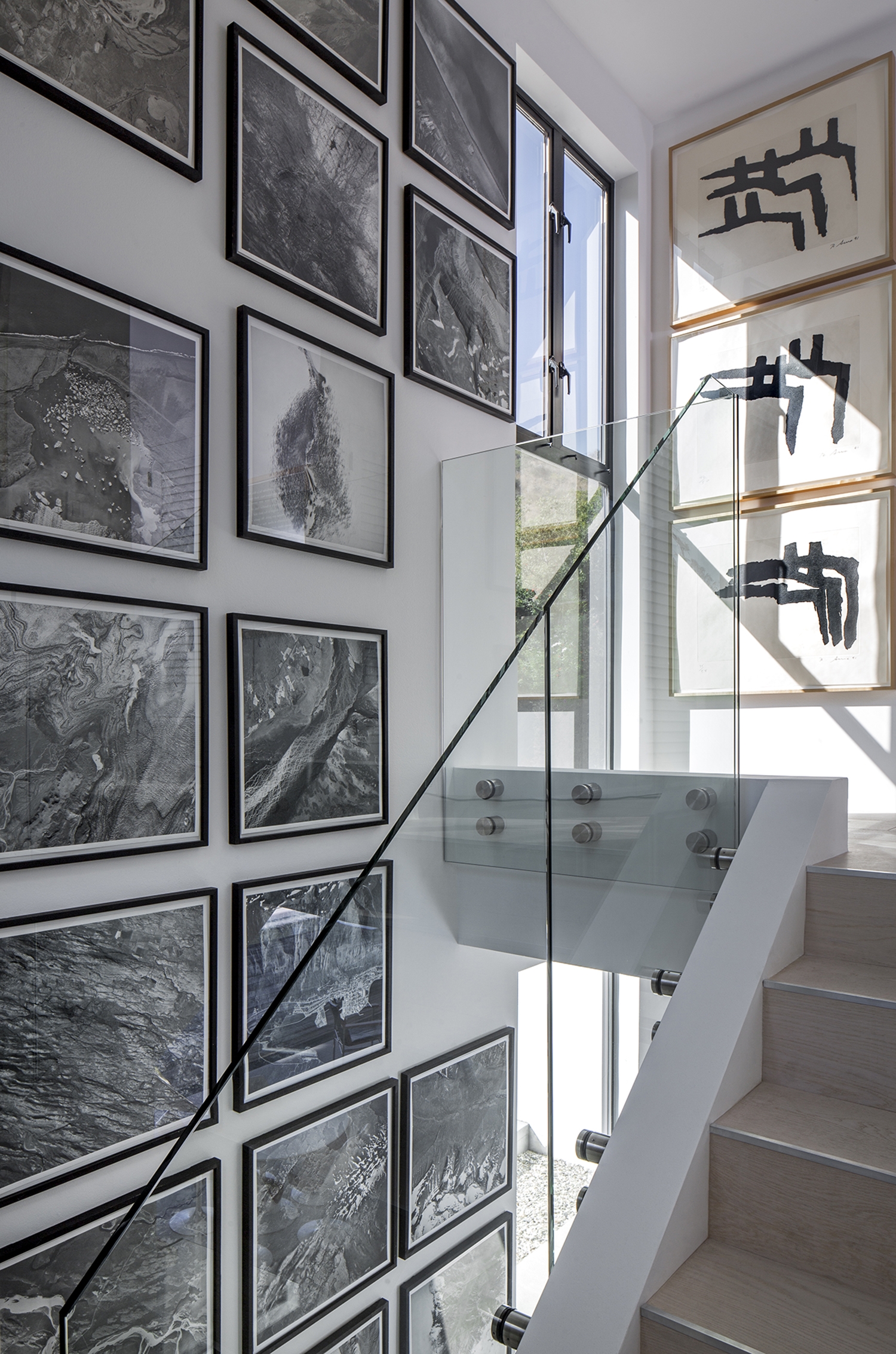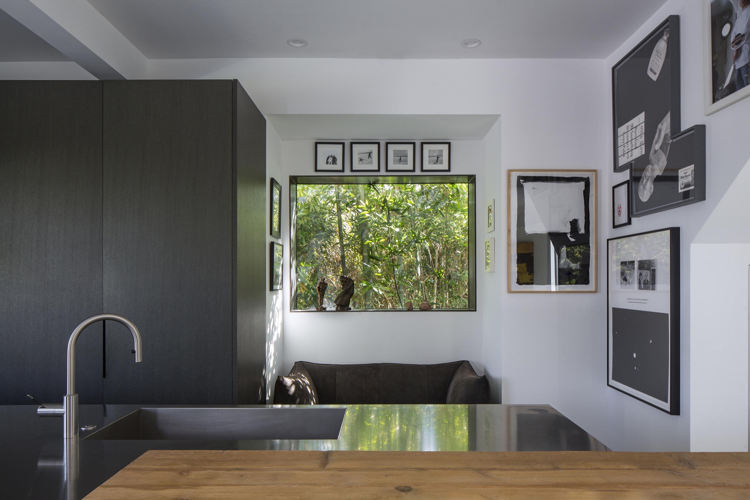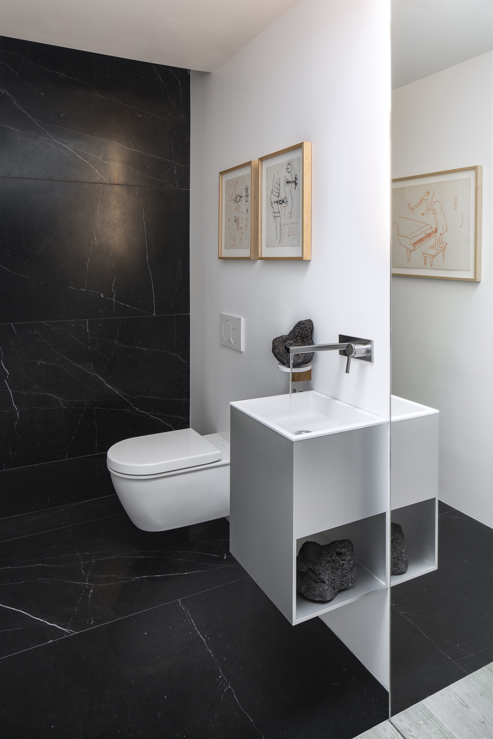 The living room includes a spacious island connecting the kitchen and dining area to enhance the flow of the space. The first level offers a home office with a powder room featuring black marble walls imitating the flow of Icelandic lava and a recycled rubber sink, made of recycled rubber tires. Design elements are oriented to take optimum advantage of natural light and cross ventilation.
