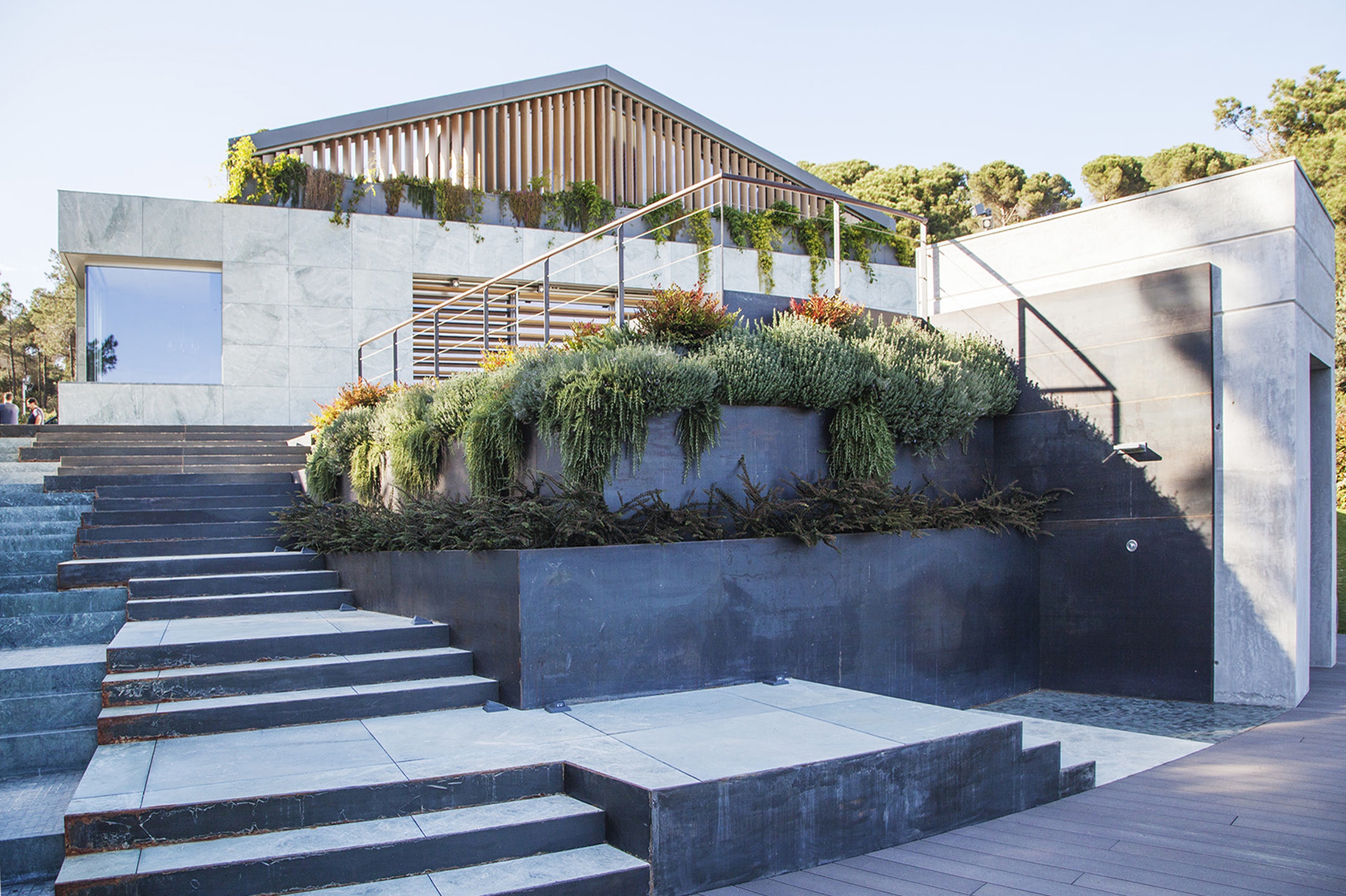 The proposal takes advantage of a pre-existing natural platform, while integrating the topography to avoid avoid further damage on the territory. Water becomes an element that joins the house and enhances the slope towards the pool through a staircase waterfall.