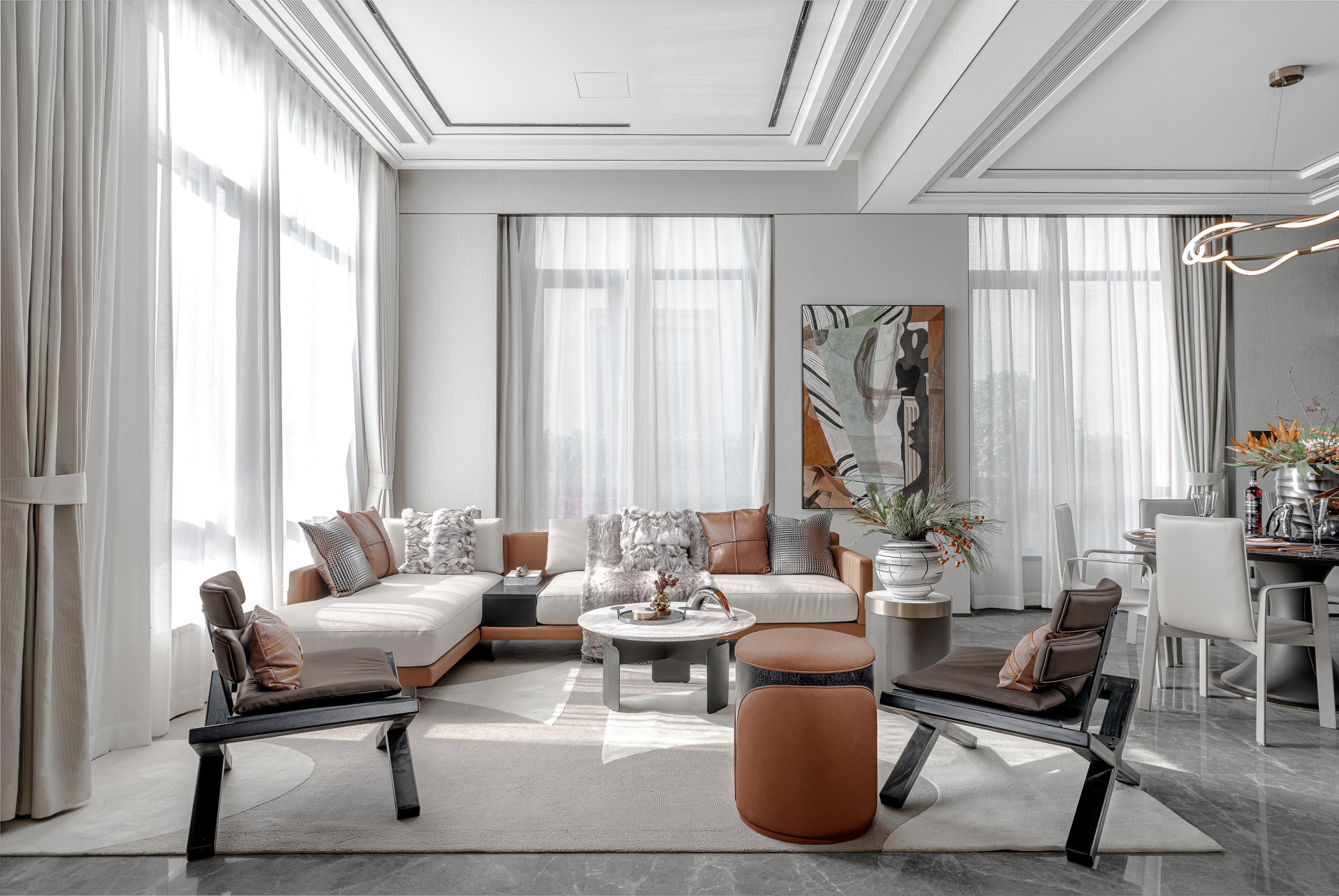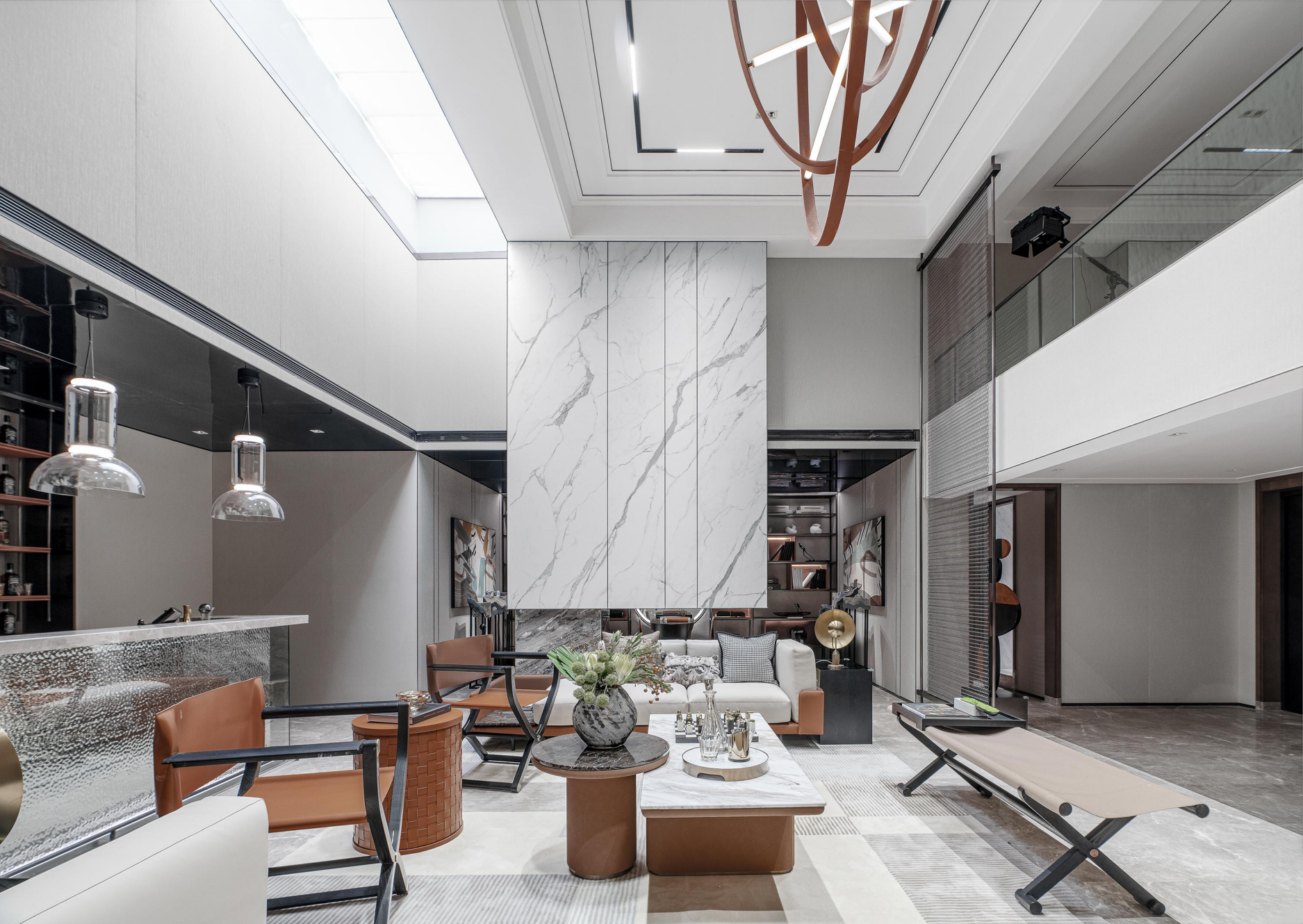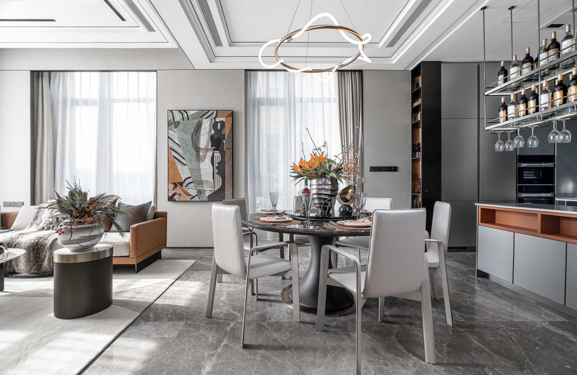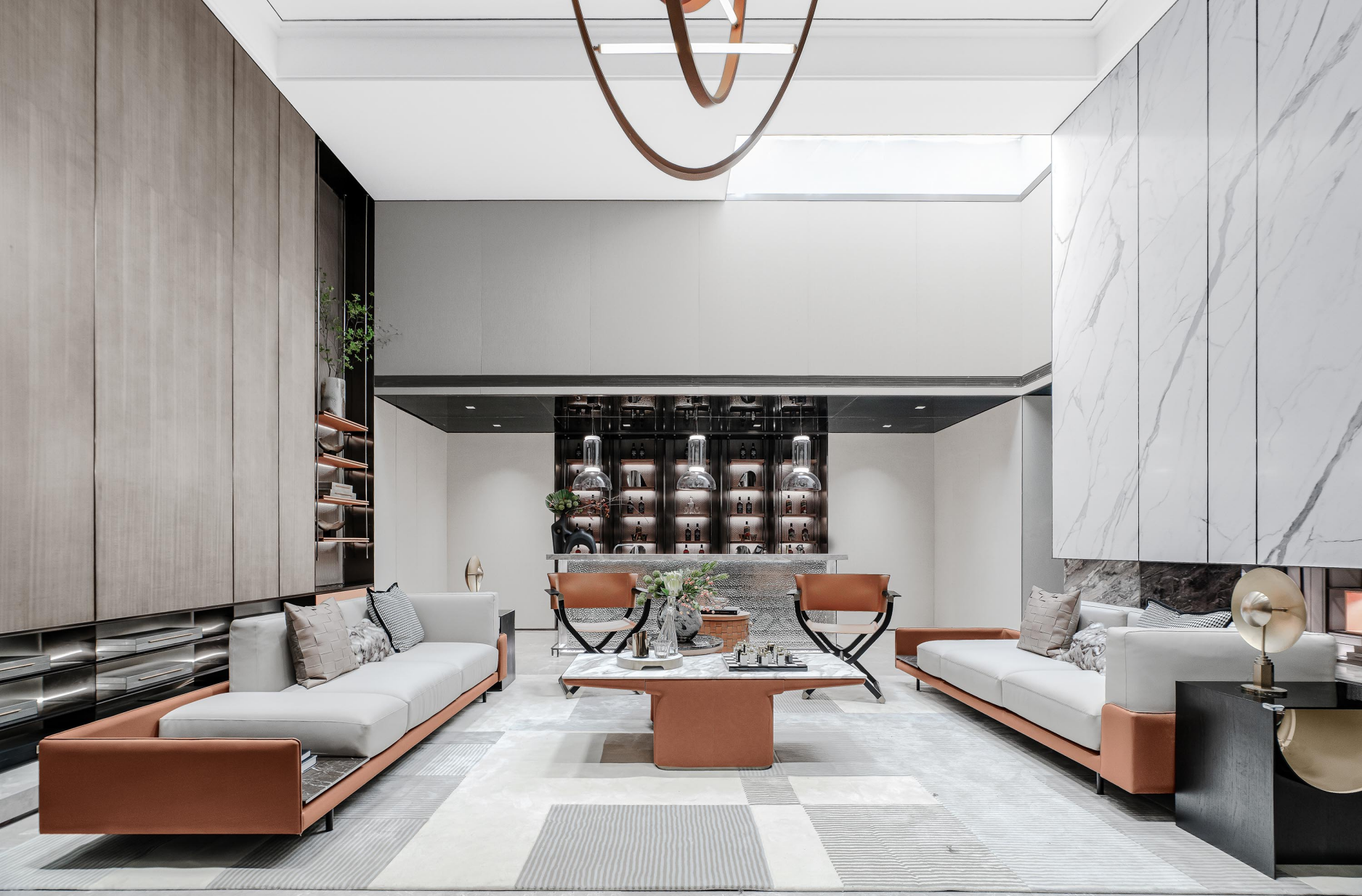 Stone, leather and metal, co-mbined with high-end luxury technology and deep conno-tation of fashion, show the m-odern and luxury quality. The bright color of the ornament seems to be the vitality that activated indoor, filled with brightness and. Artistic patt-erns and lighting infuse warm and soft colors into the space, following the footsteps of the residents, blooming brilliance in the elegant and fashionable space.