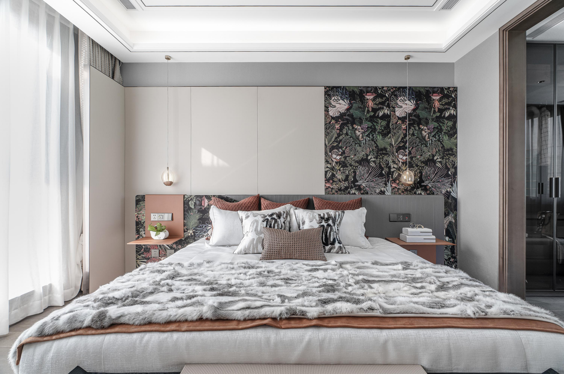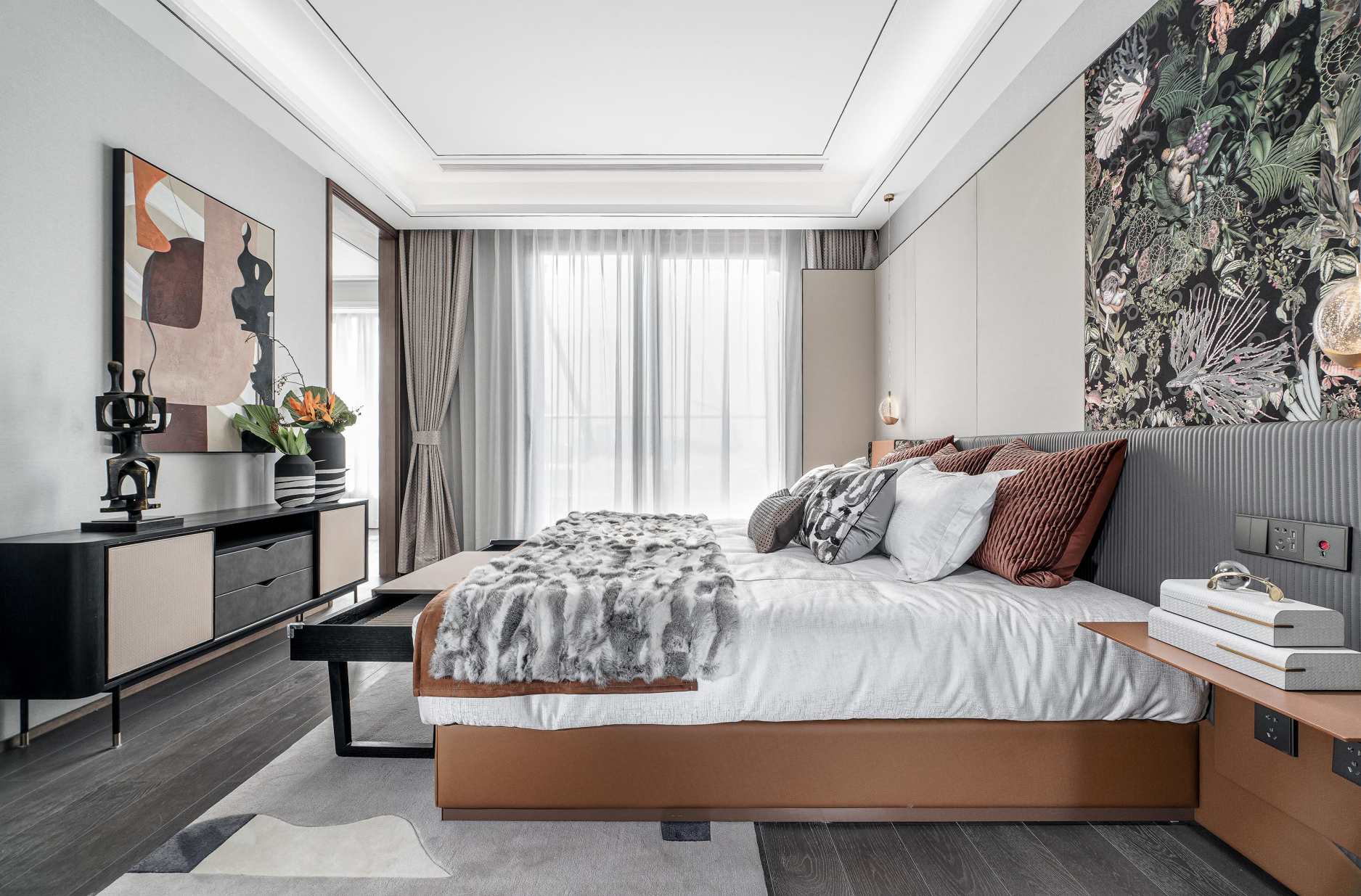 The bedroom space reflects the greenness of nature into the room, and extracts the vitality of Jiangnan gardens. The forms of flowers, birds and animals are dynamic, bringing the freshness of the garden into life. The green plants, sculptures and paintings in the soft furnishings echo the natural scenery of the outer space, dep