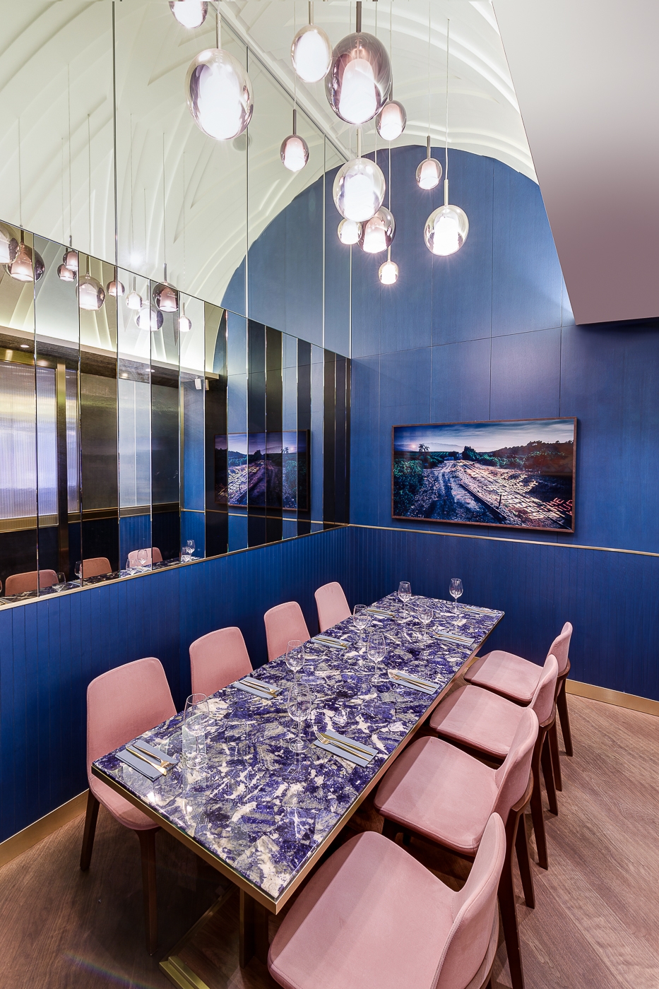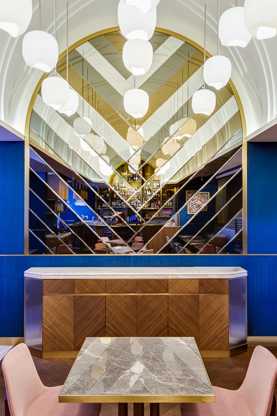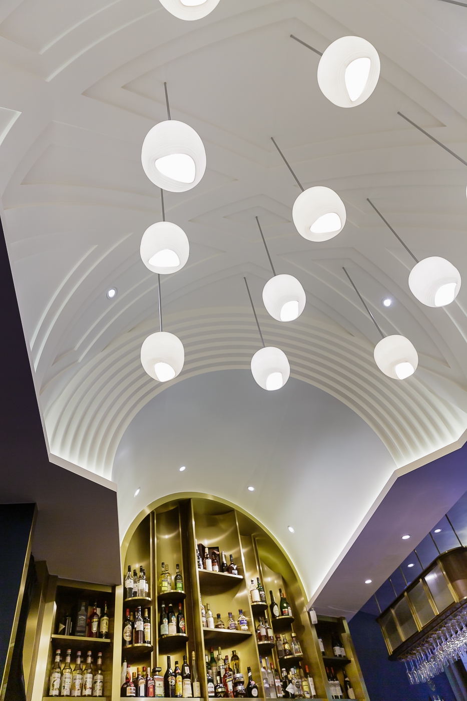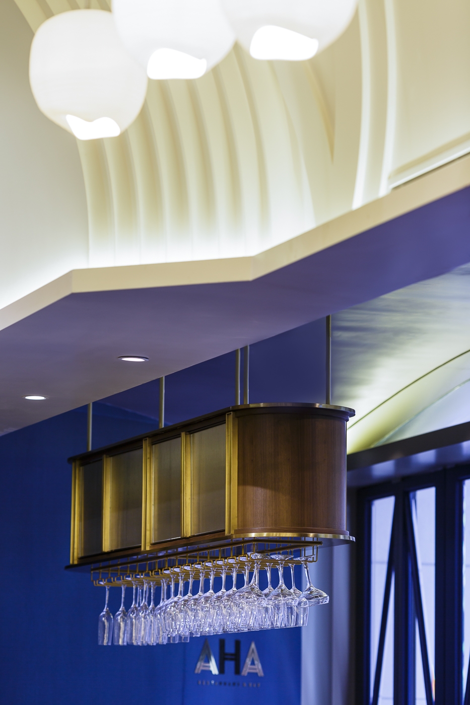 The brand identity was inspired by the notion of “communion for food”. Places of worship became reference for the design, seeking forms and shapes from churches and alters. Inspired by the nave and vaulted ceilings, the main dining area opens up to a bold and airy interior, taking advantage of the 5m ceiling height. A golden metallic pipe organ inspired wine display frames the bar area with a glittering presence.