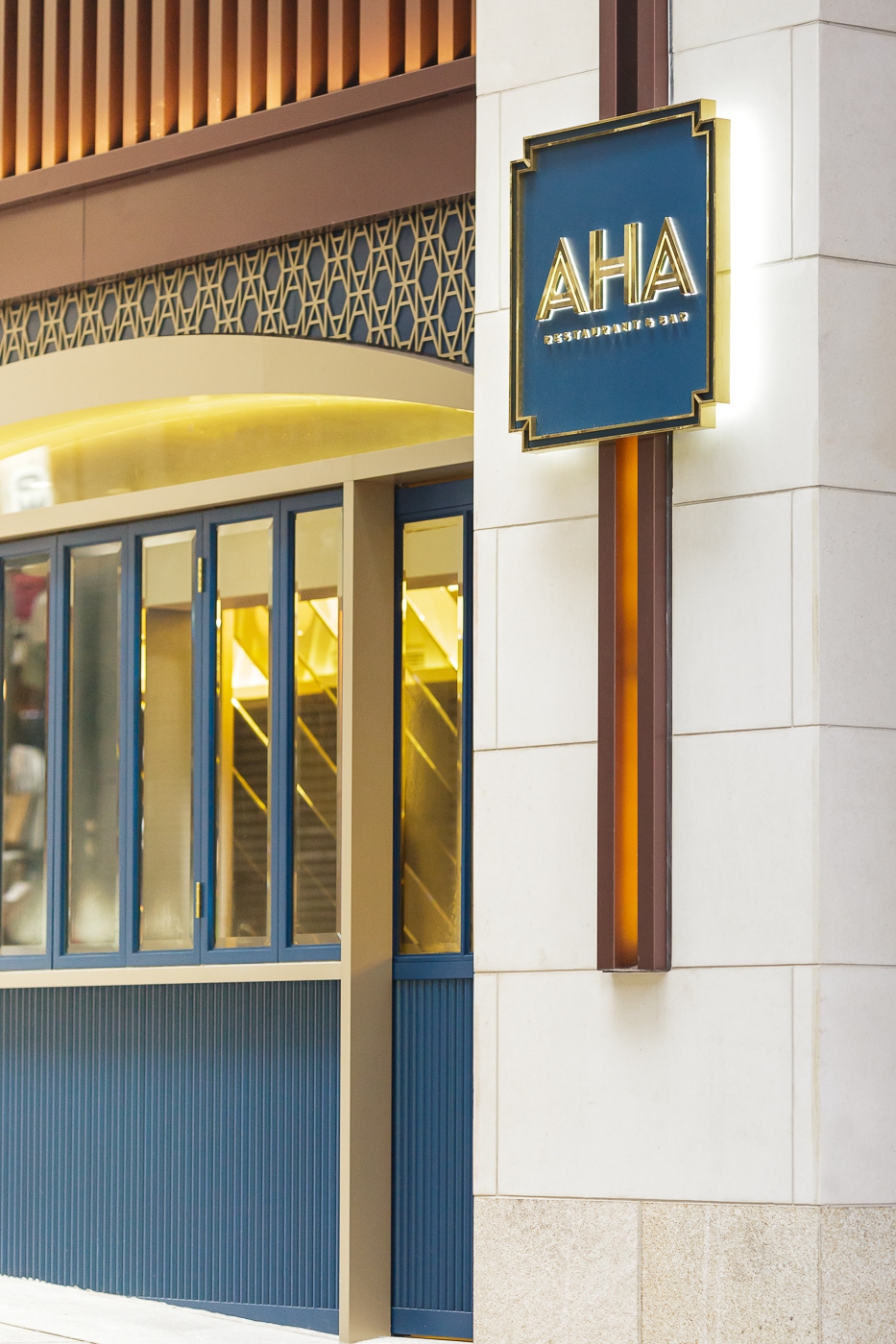 Located on the ground floor, the project’s first task was to create an attractive frontage to draw customers. The shop front is flanked by two similar yet functionally distinct openings to allow physical and visual access into the restaurant. Golden arched profiles and custom designed electroplated steel screen patterns offer strong street front identity. Full height French doors and windows creates partial alfresco experience.