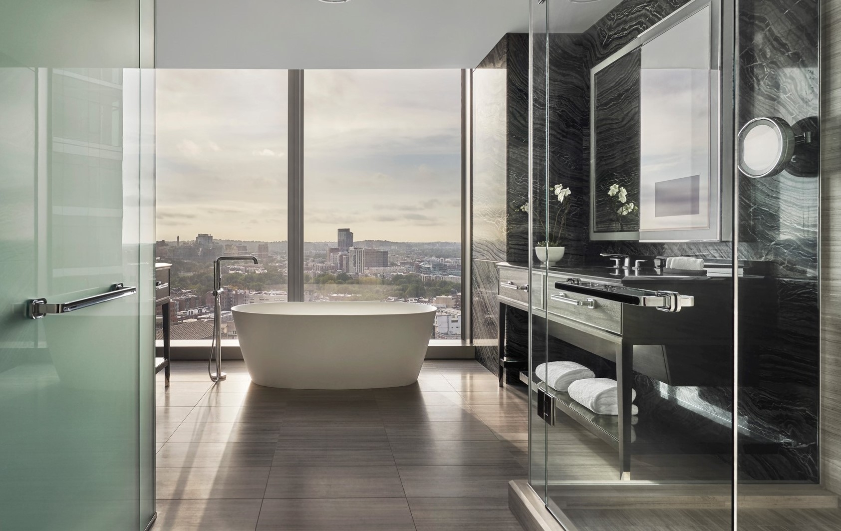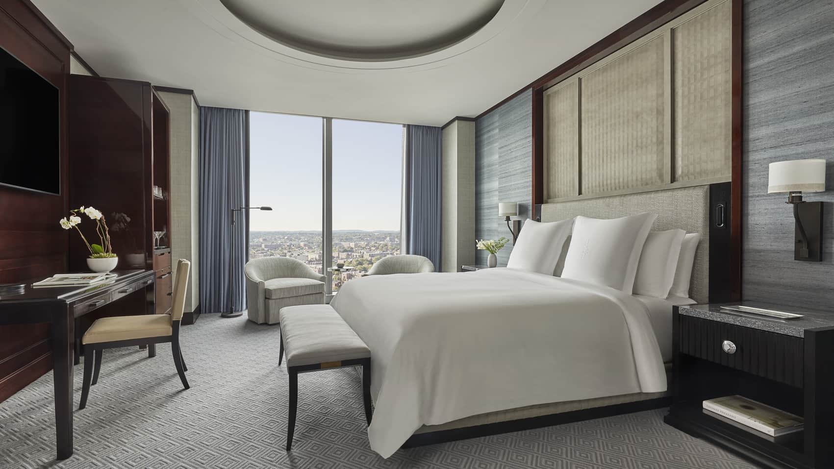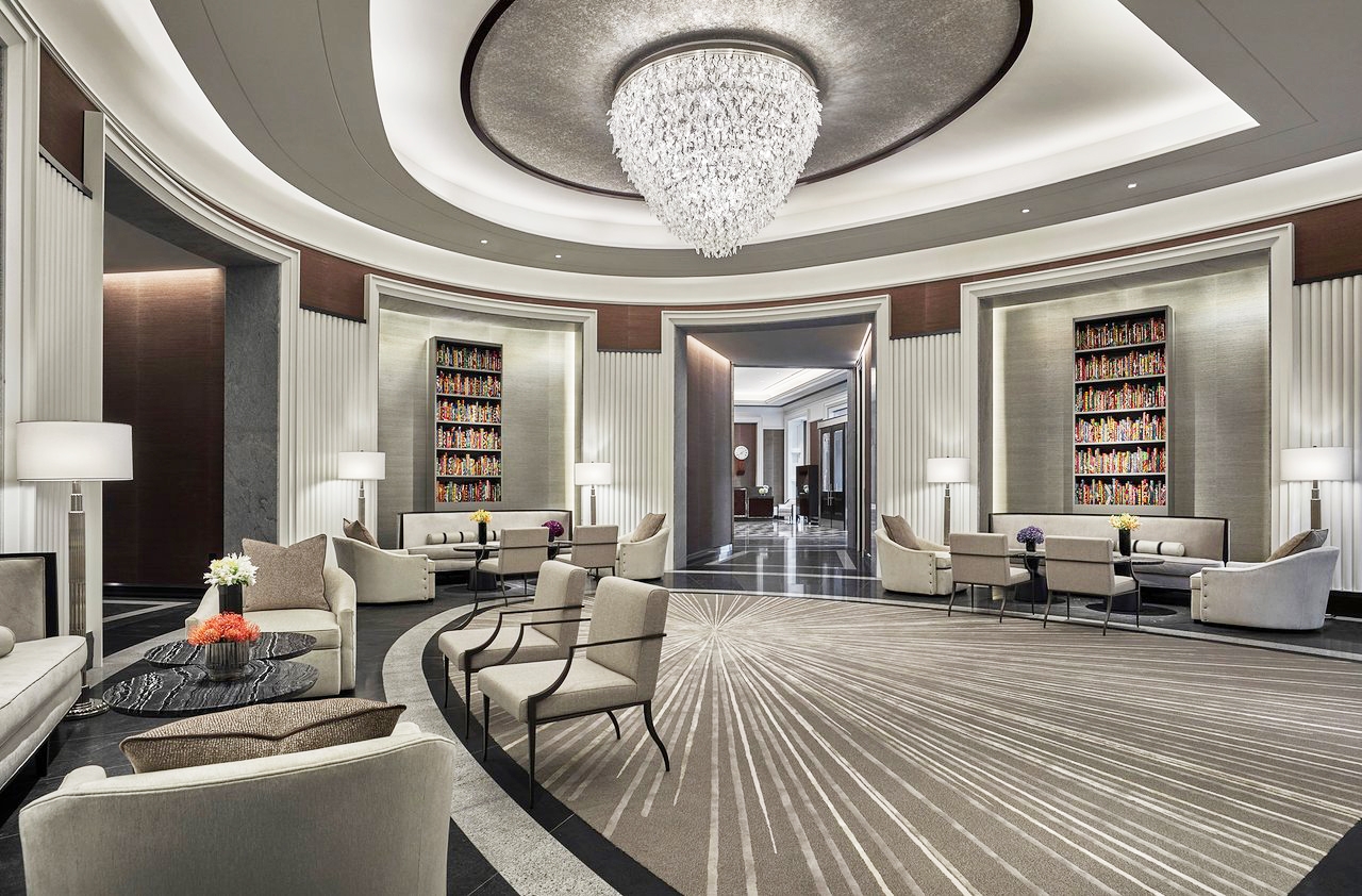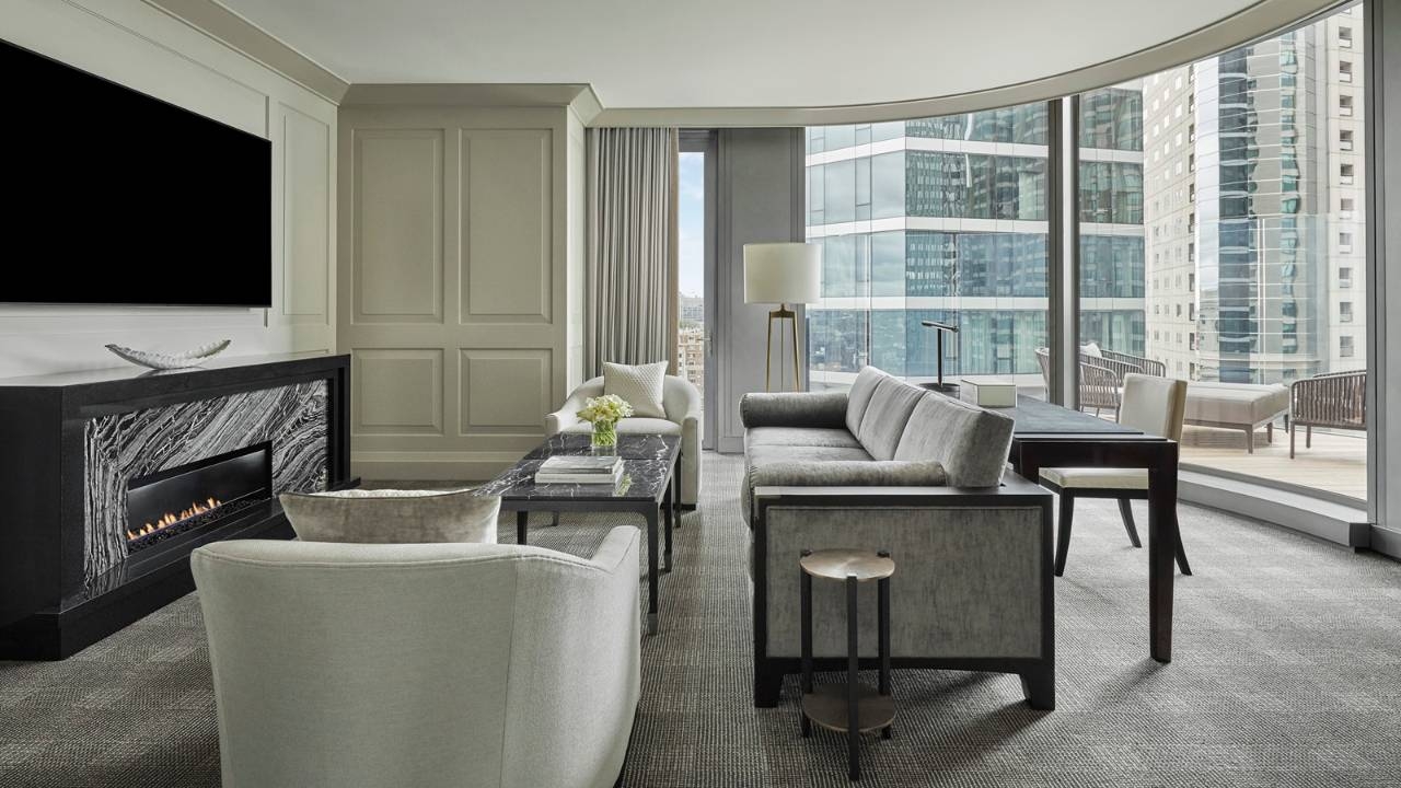 The owner mandate was to make the guestrooms “a New luxury offering for Boston rooted in context of place”. The personality of the interiors are derived from a modern and refined New England material palette. Pattern, texture, and form further define the experience by the use of polished mahogany, soothing tones, modern fluted walls, reinvented raised panel details, Wilton style wool carpet in a windowpane pattern, grass cloth accents, light gray stone, embroidery, and a well- balanced blend of wallcovering surfaces of herringbone, patterned textile, linen, and raffia textures. With a subtle reference to
