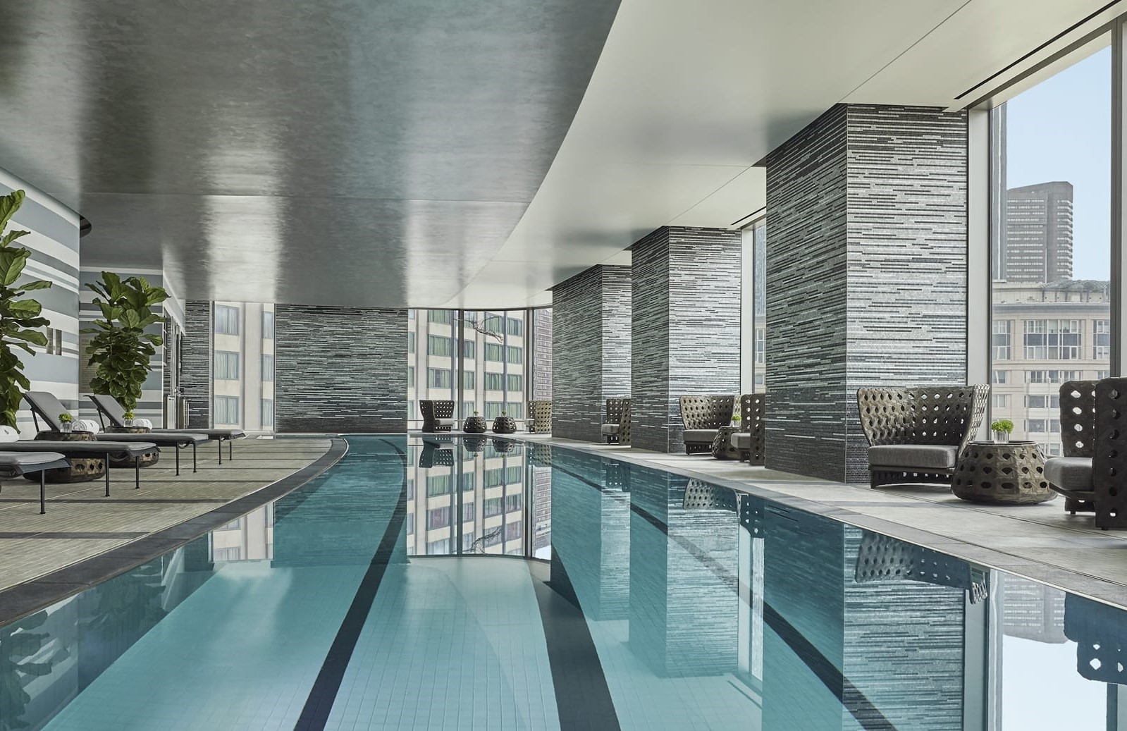 The hotel portion of the project occupies the first 21 floors of the property. Due to site constraints related to the unique triangular form of the project site, the building has been designed in the form of a soft triangle with radiused sides and corners. This provided for a unique opportunity as it related to interior