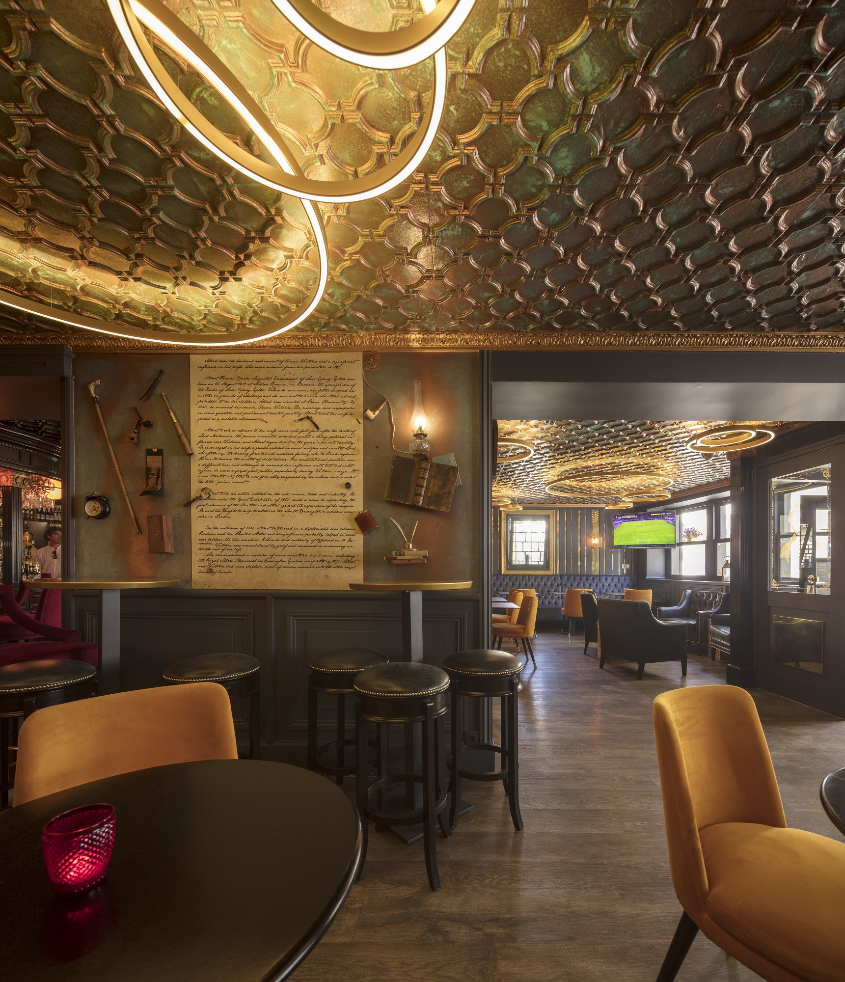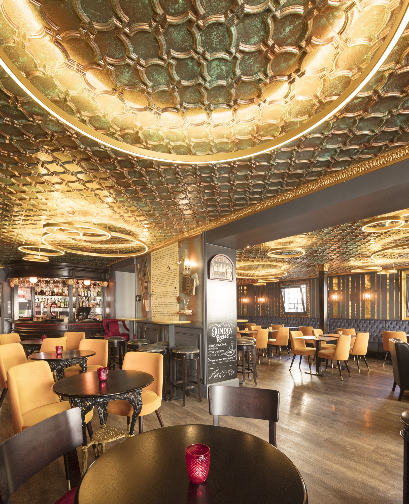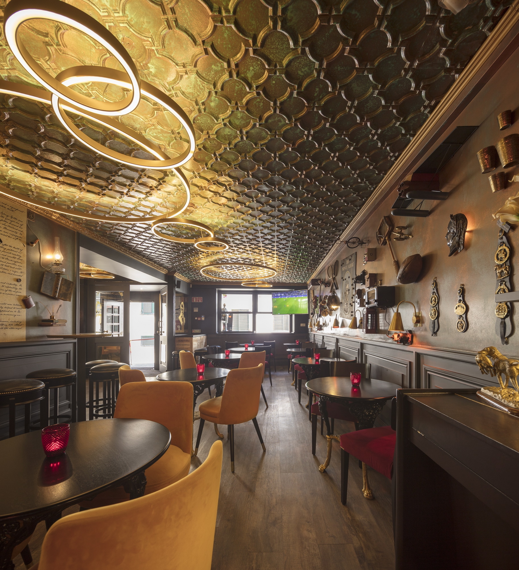Inside, the colours, lighting and fabrics blend together and ennoble the pub. The ceiling, with artistic plastic treatment, takes us to a nocturnal and rich atmosphere. The metallic, golden rings illuminate, energise and bring magic to the space. The colour of the oxidised aged copper transport us to the past, which we don't want to forget. Paintings and objects remind us of the famous Victorian era.