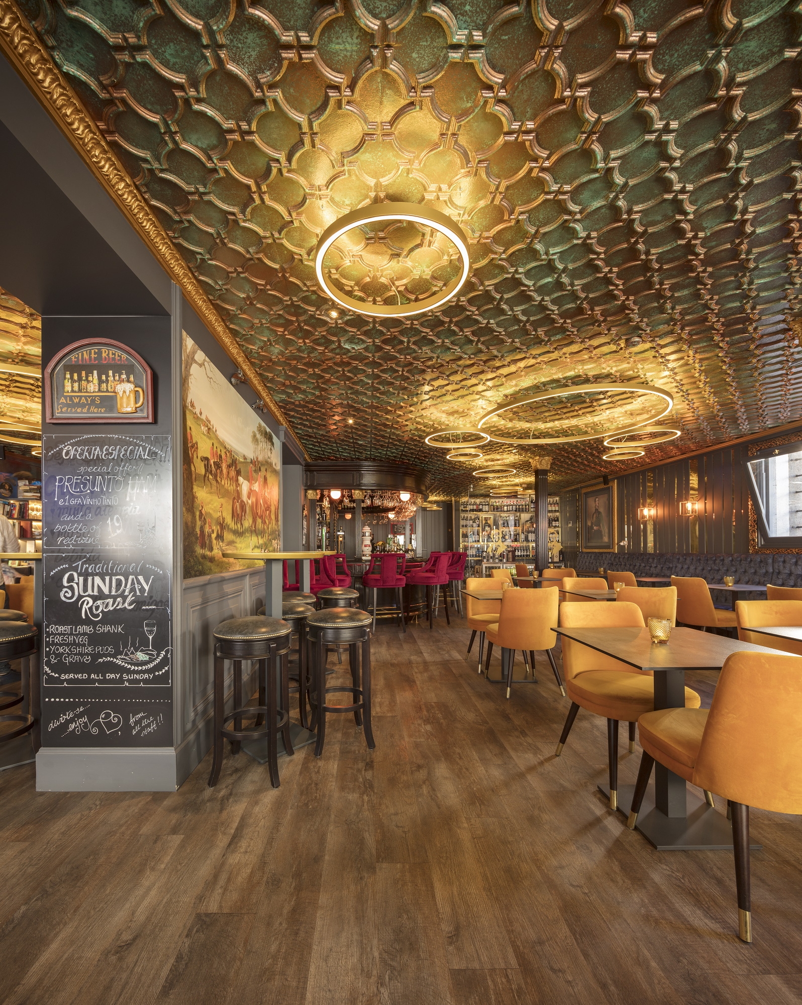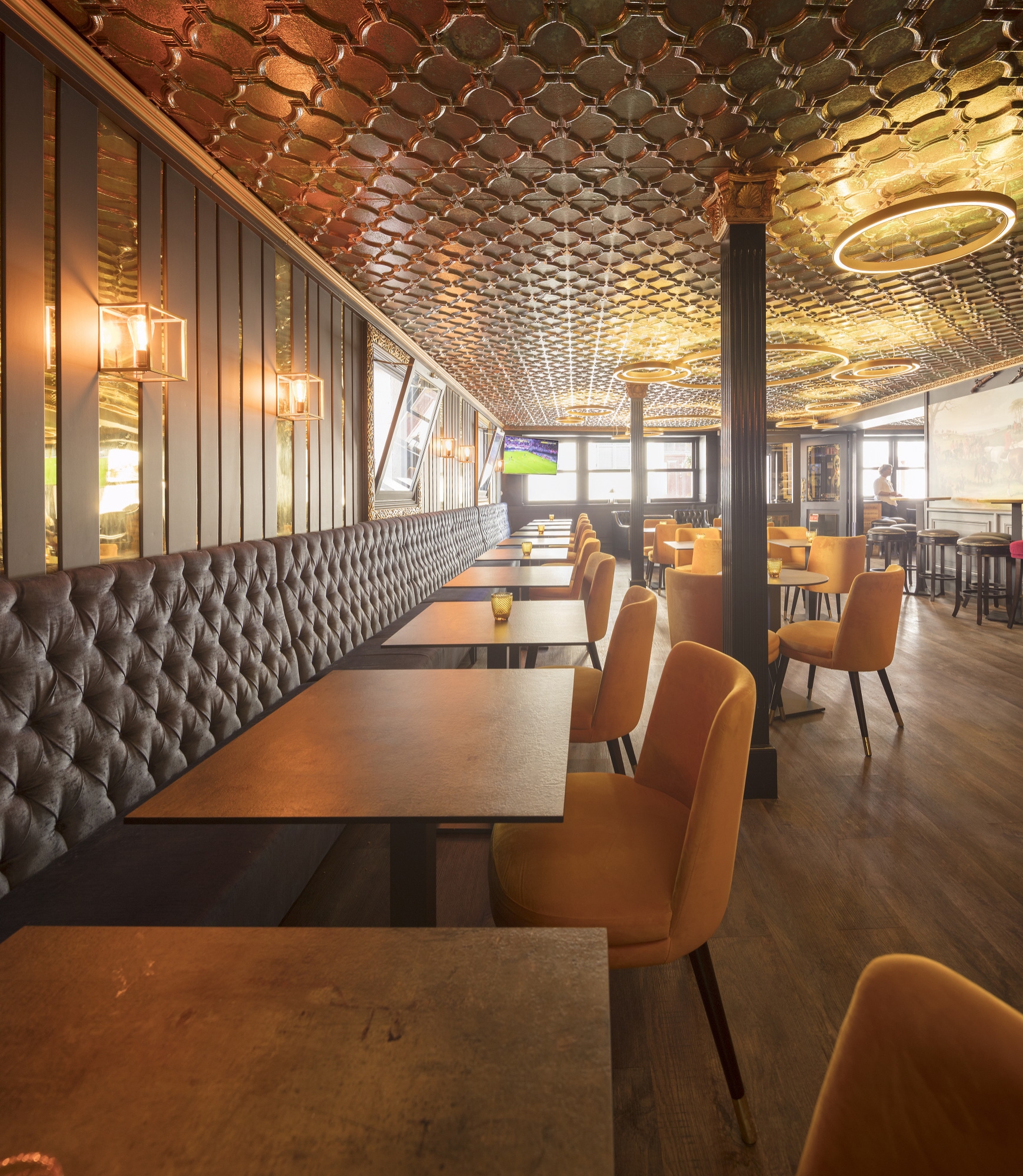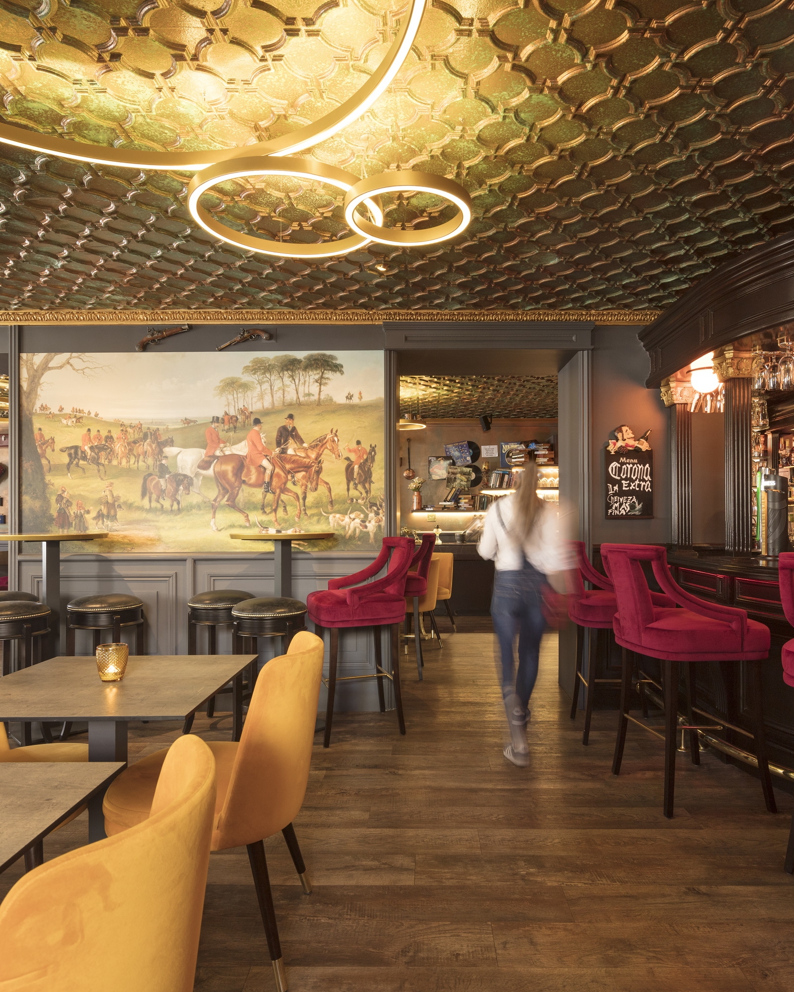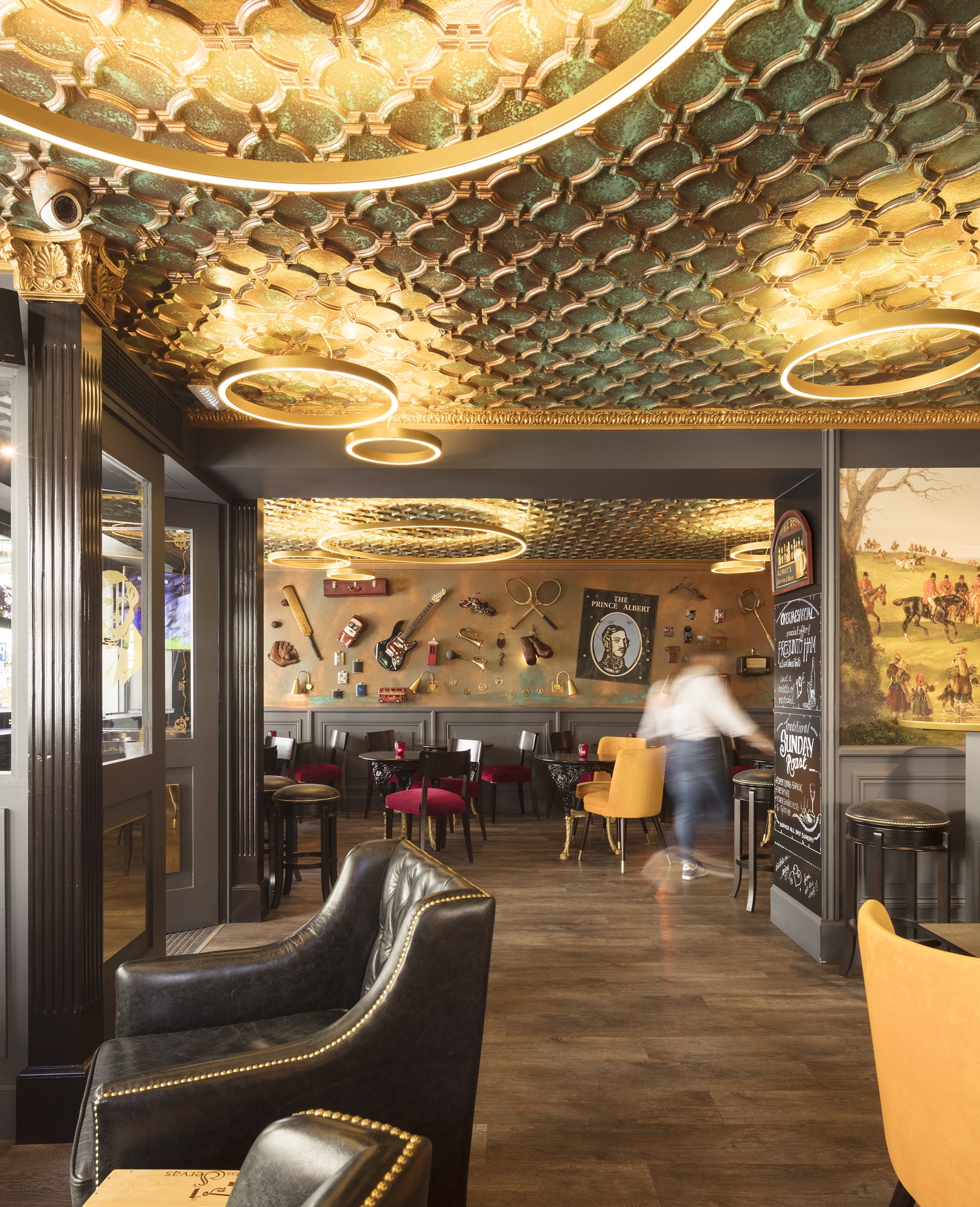 Inside, the colours, lighting and fabrics blend together and ennoble the pub. The ceiling, with artistic plastic treatment, takes us to a nocturnal and rich atmosphere. The metallic, golden rings illuminate, energise and bring magic to the space. The colour of the oxidised aged copper transport us to the past, which we don't want to forget. Paintings and objects remind us of the famous Victorian era.