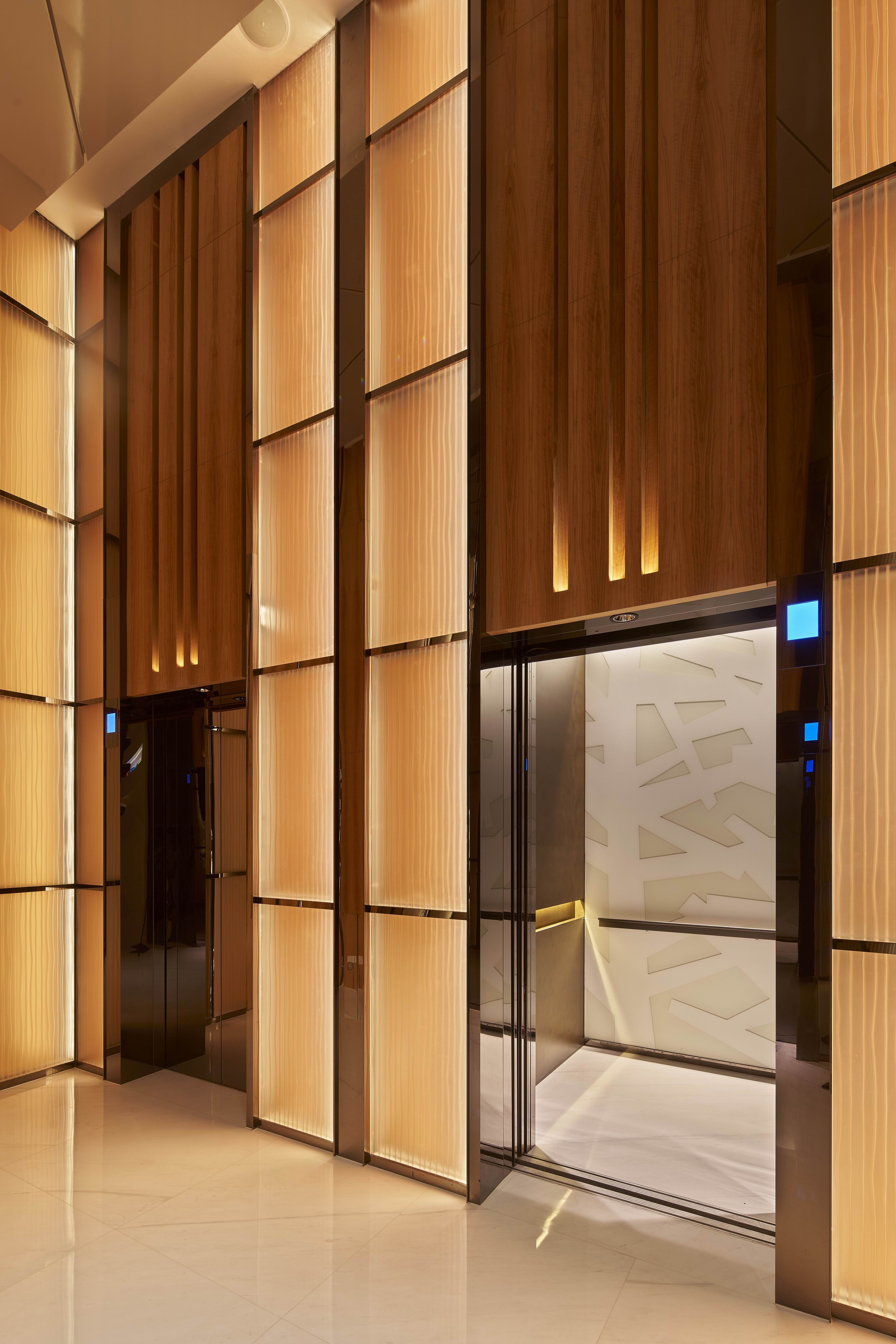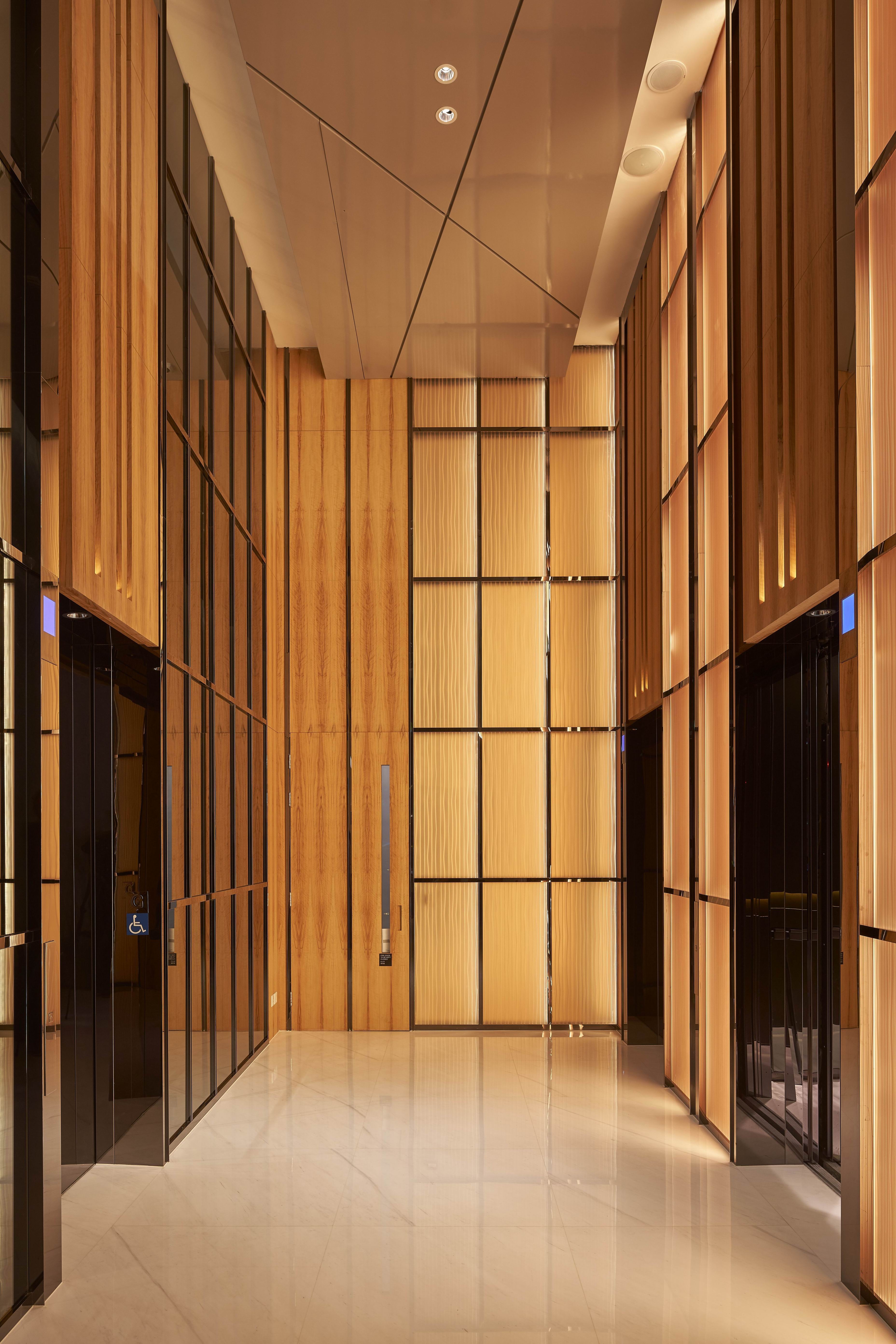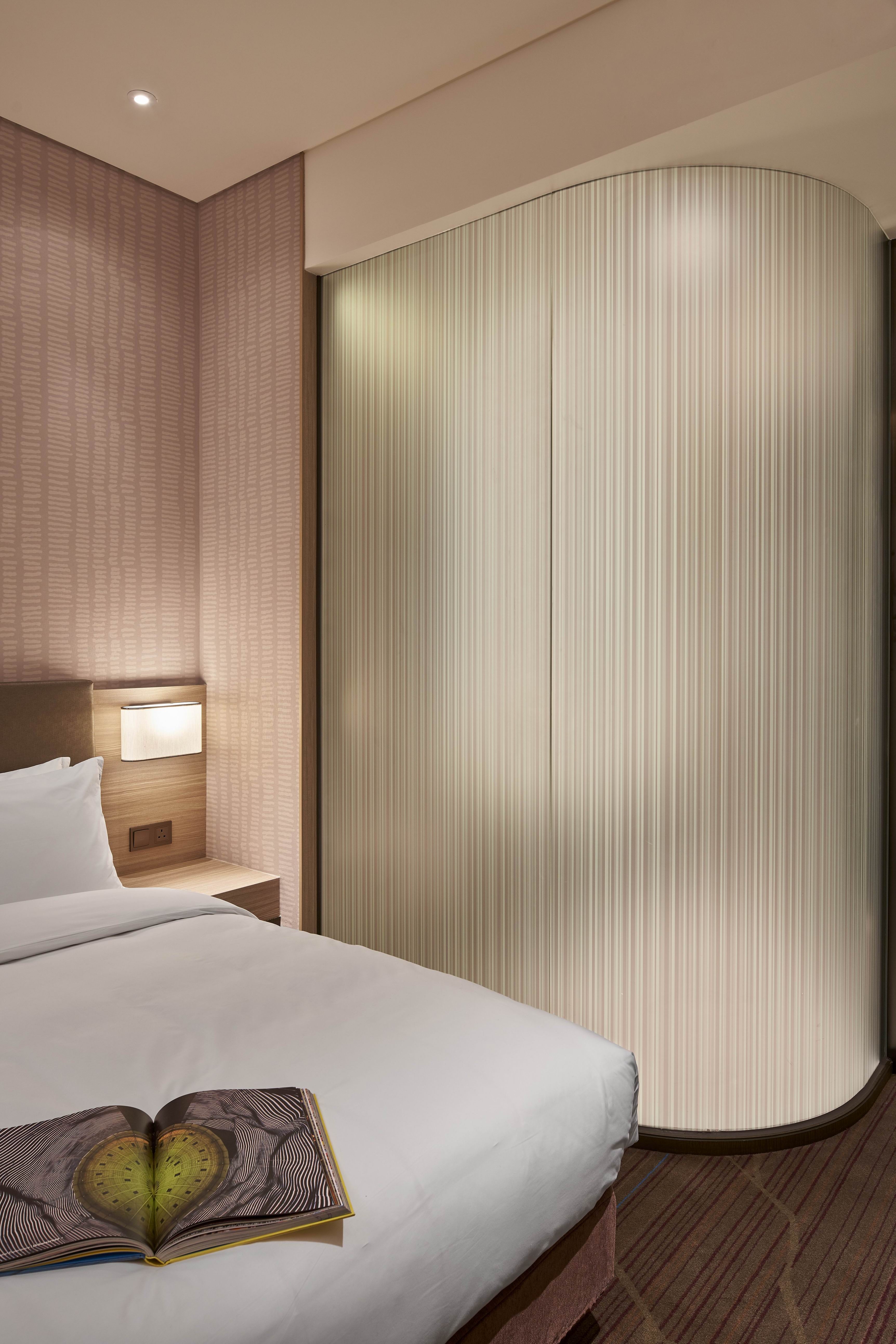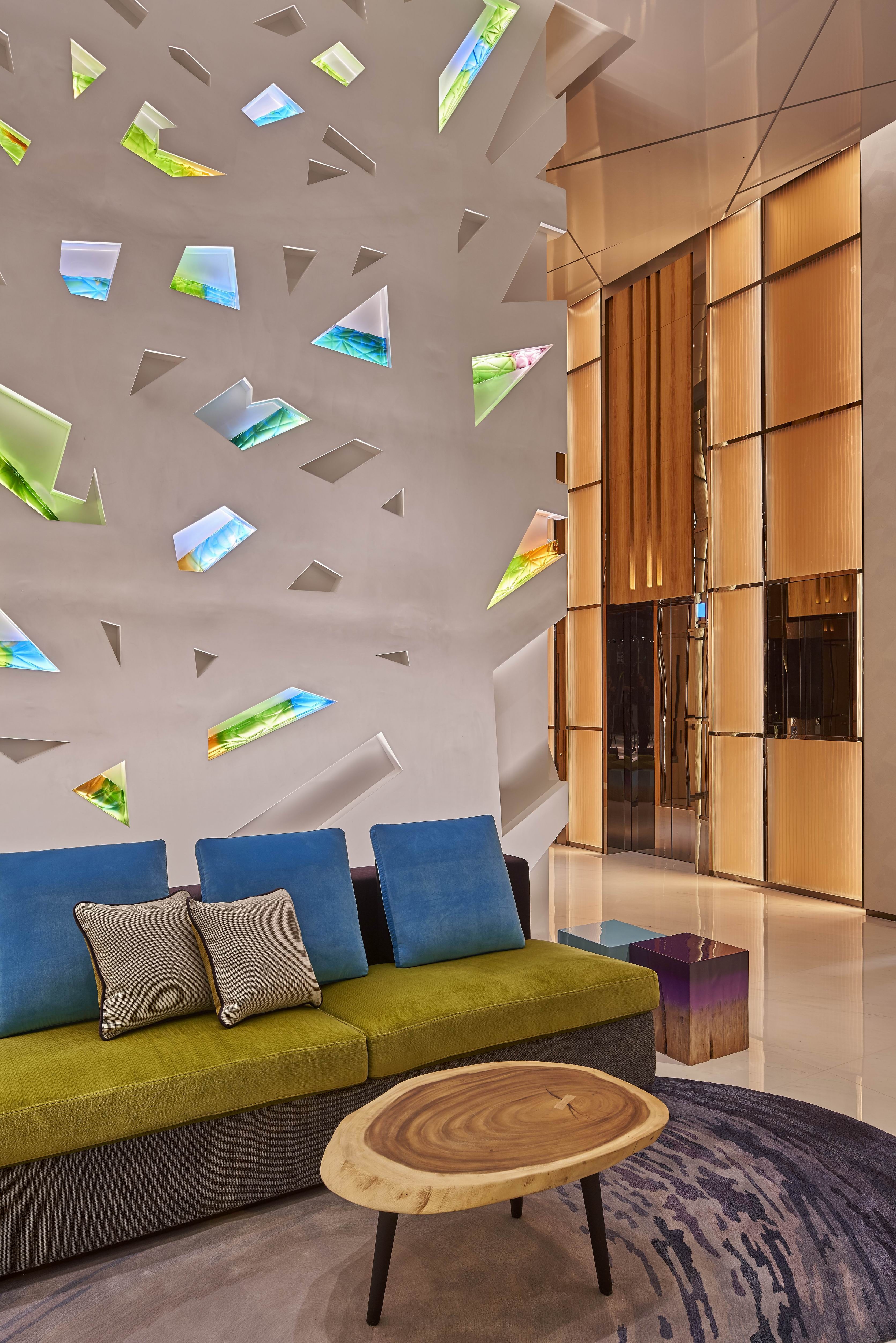 The hotel lobby opens directly from How Ming Street making a striking impression on the streetscape with its colourfully lit double height core wall forming a backdrop to the lobby waiting area.
