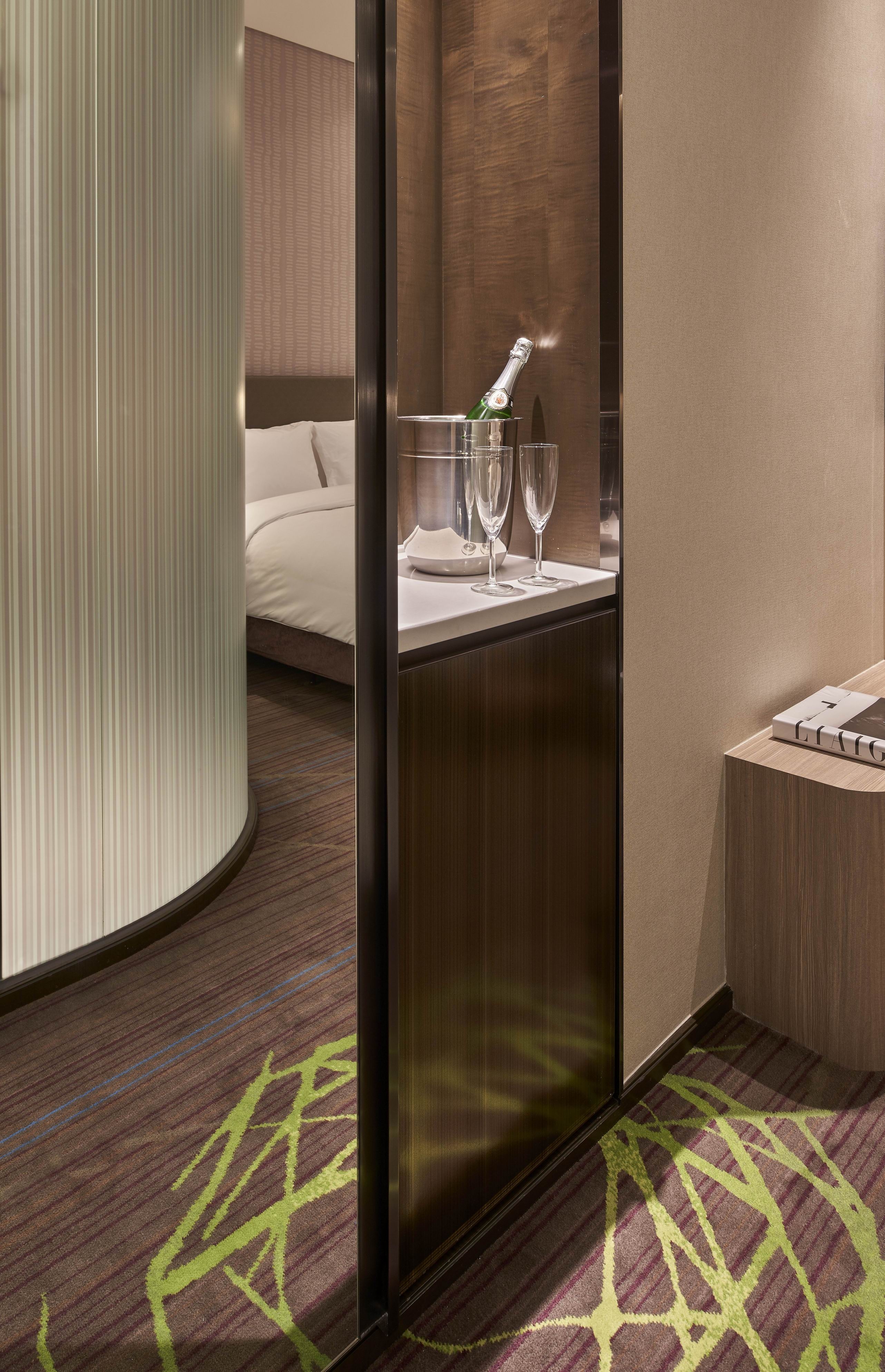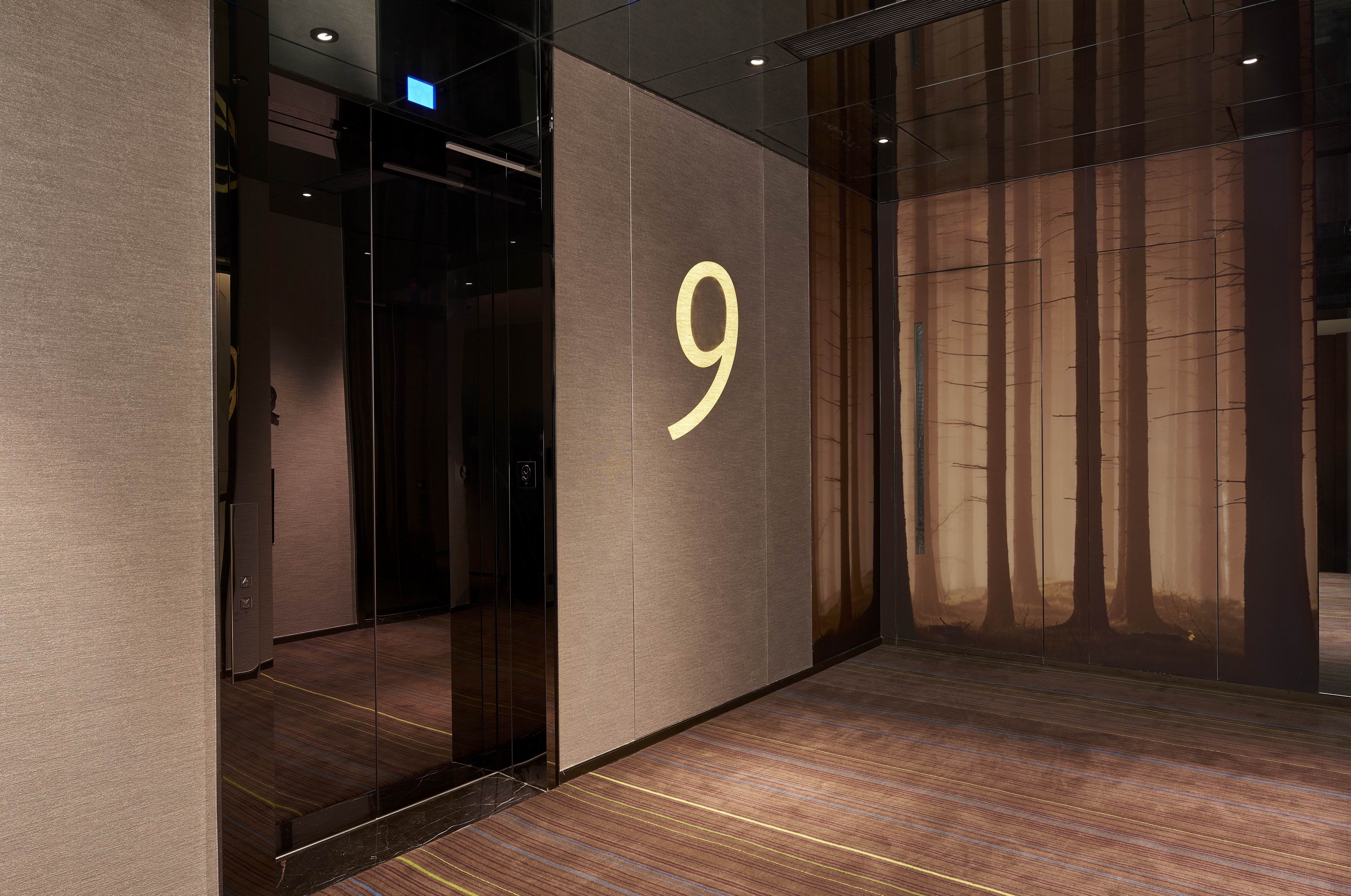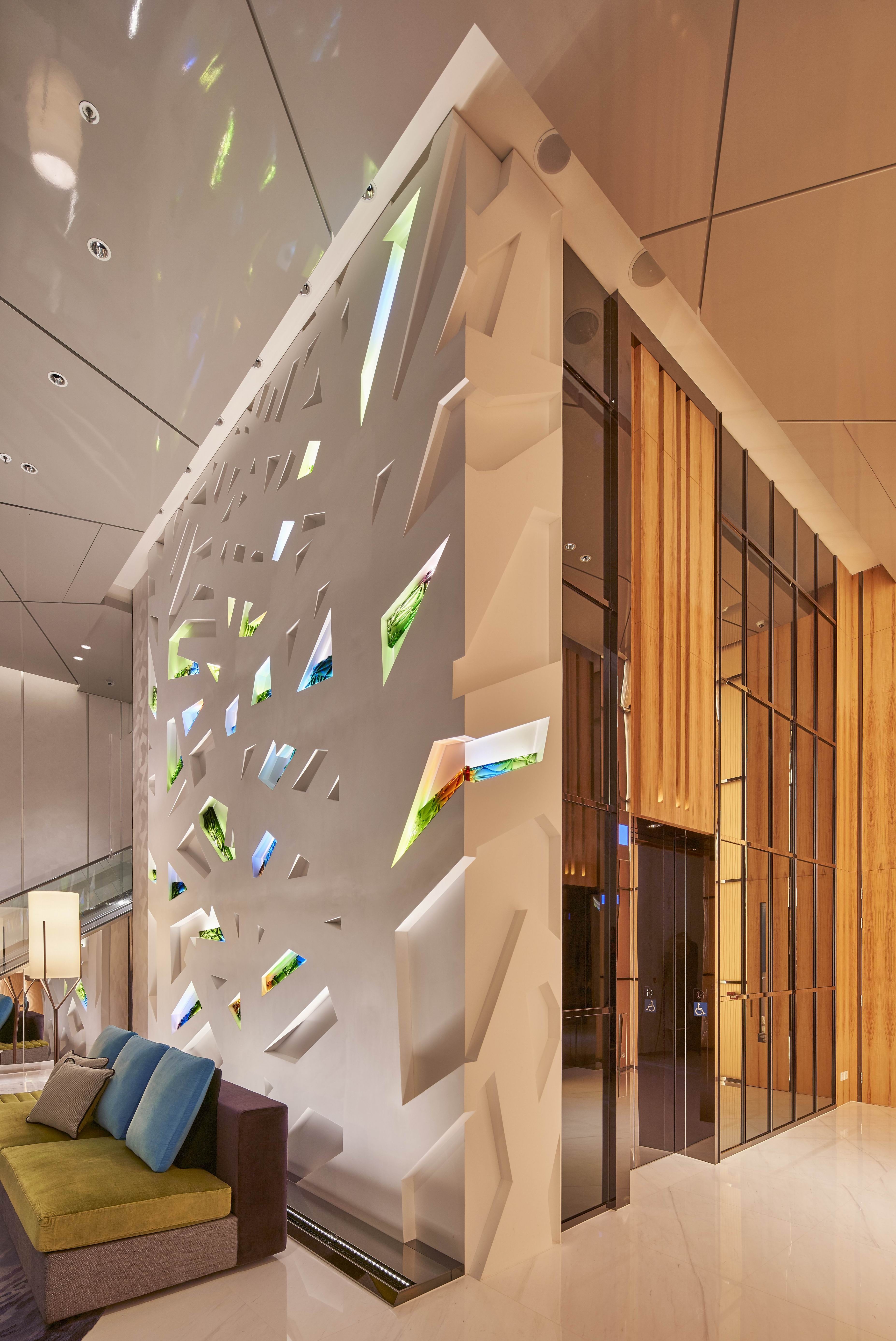 The concept for the backdrop comes from the idea of a nest, giving comfort, warmth and protection to the weary traveler, formed by a tangle of branches and twigs with bright flashes of colour reminiscent of iridescent peacock feathers. It is a theme that continues throughout the hotel in the circulation areas, lift car interiors and into the hotel rooms where the branches turn to green symbolising new growth.