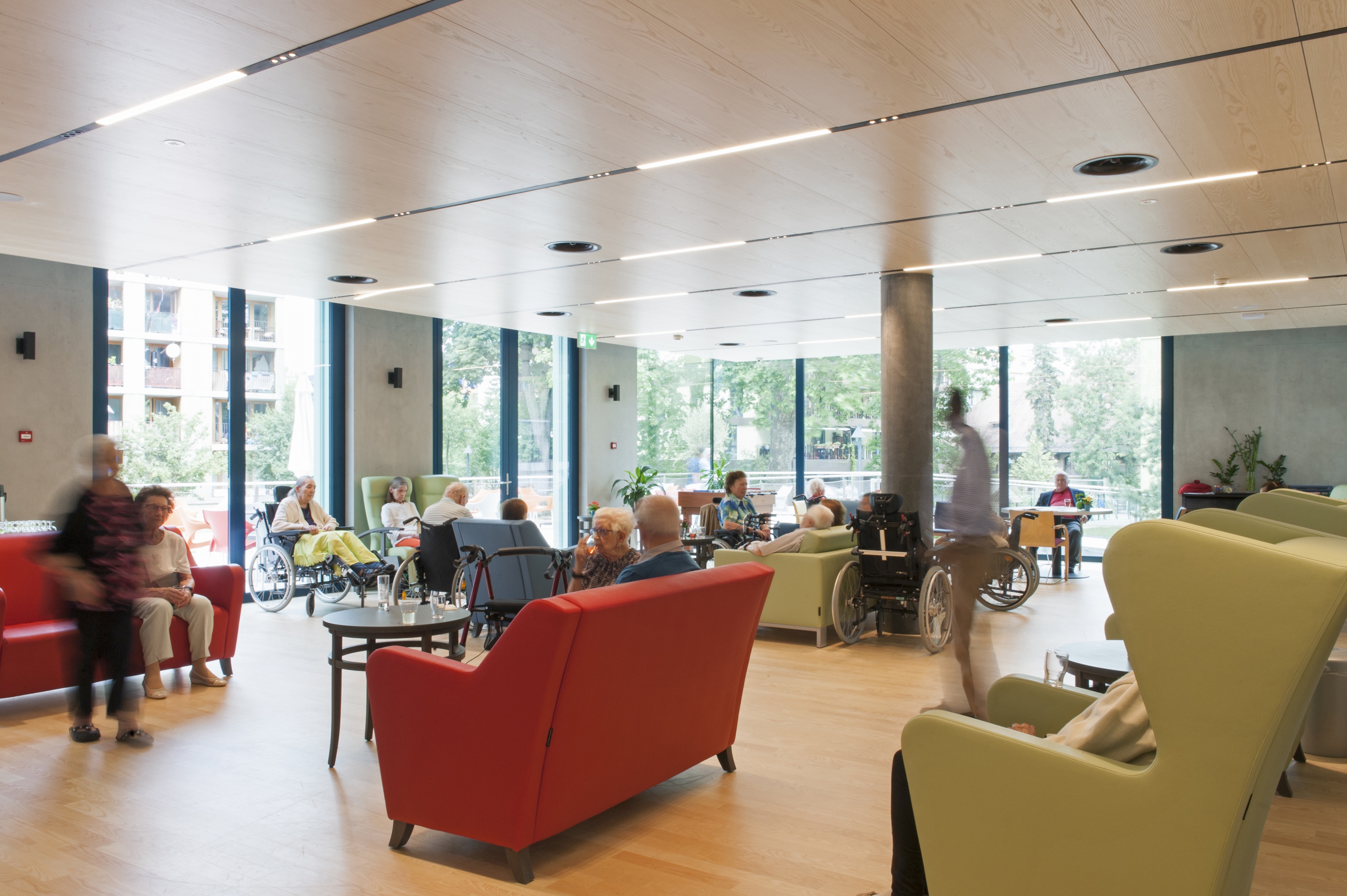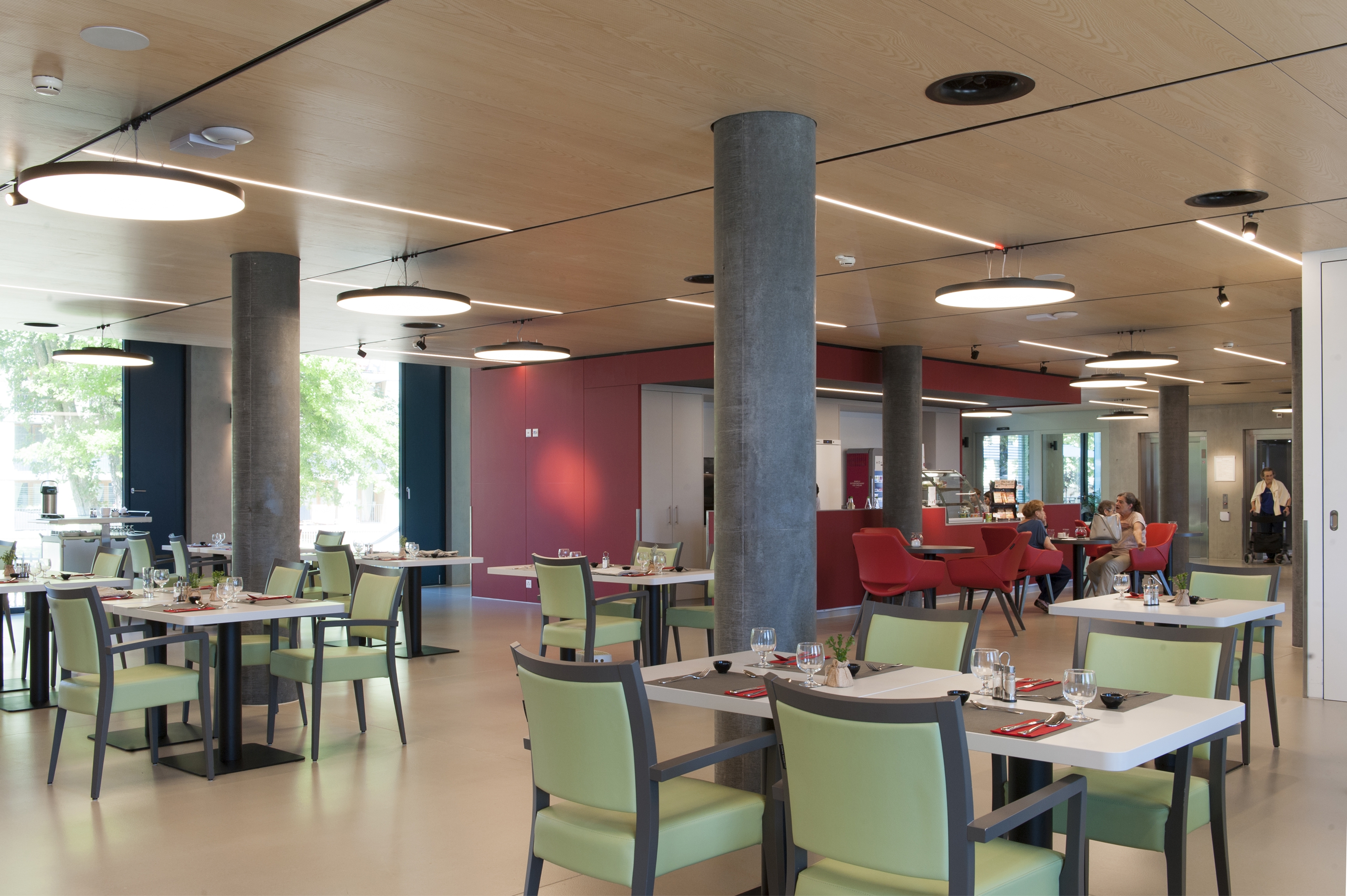 The housing and the medico-social space, the neighborhood house, as well as the nursery are grouped around the central space and are precisely implanted in this existing public park.